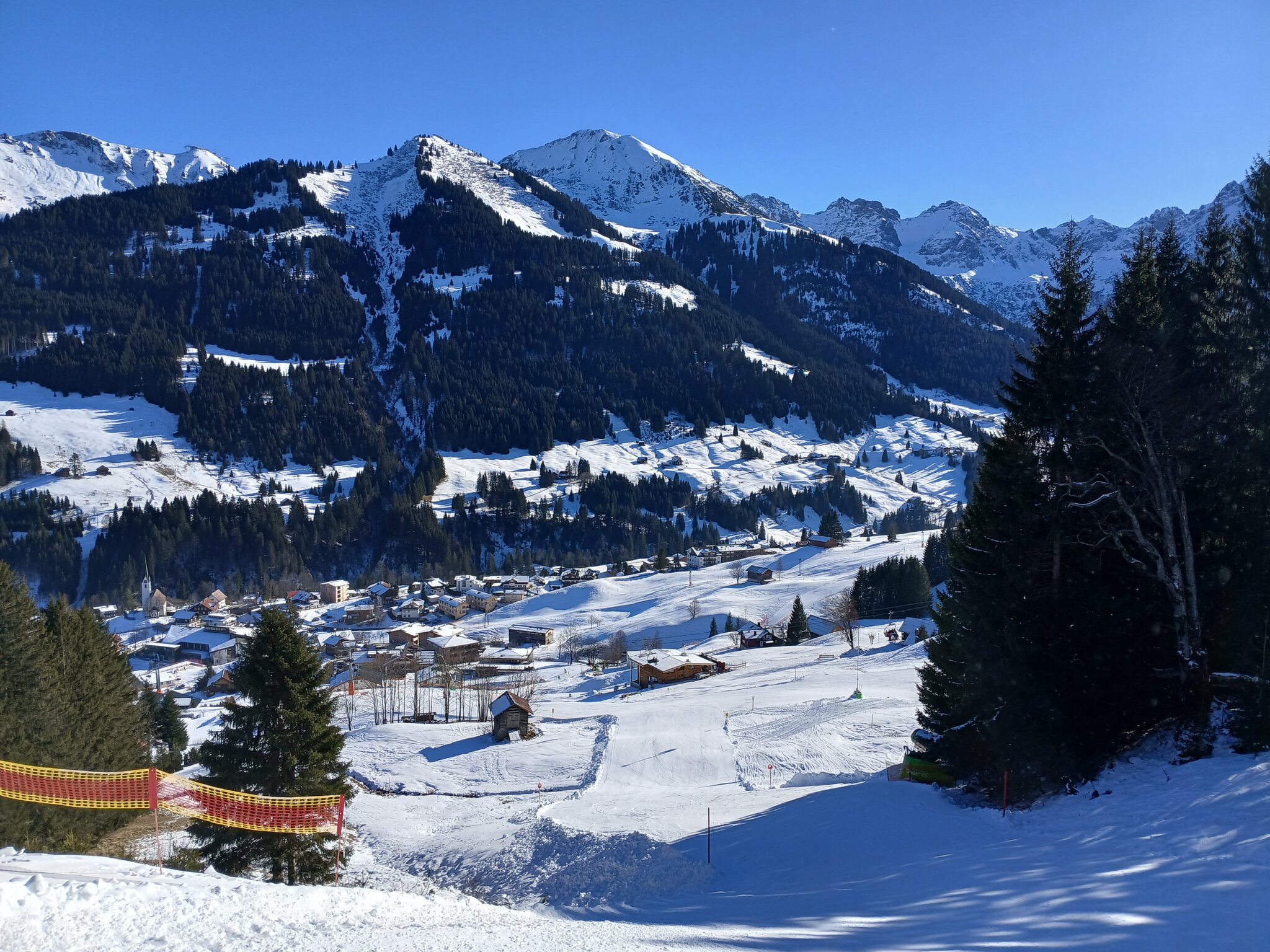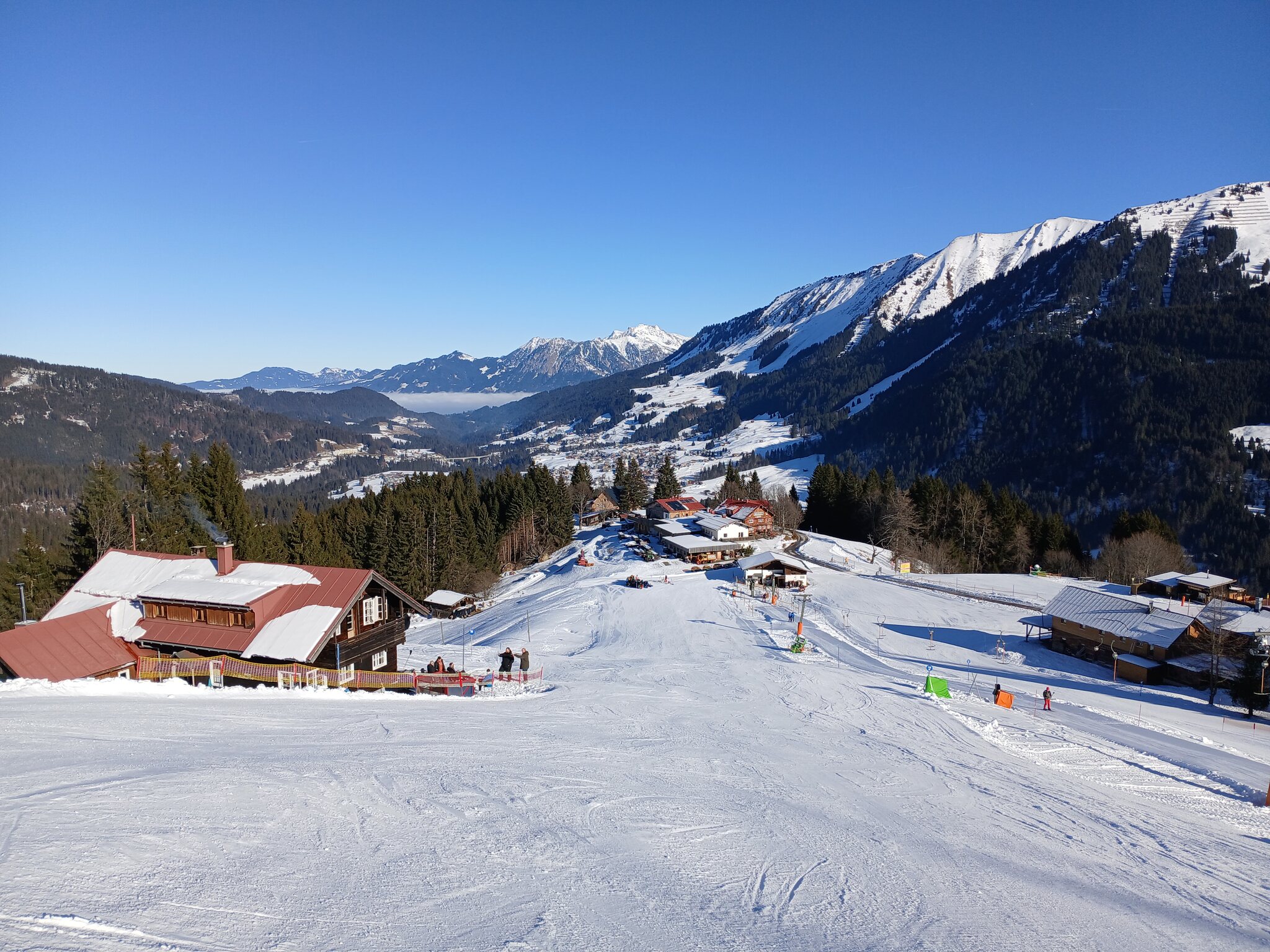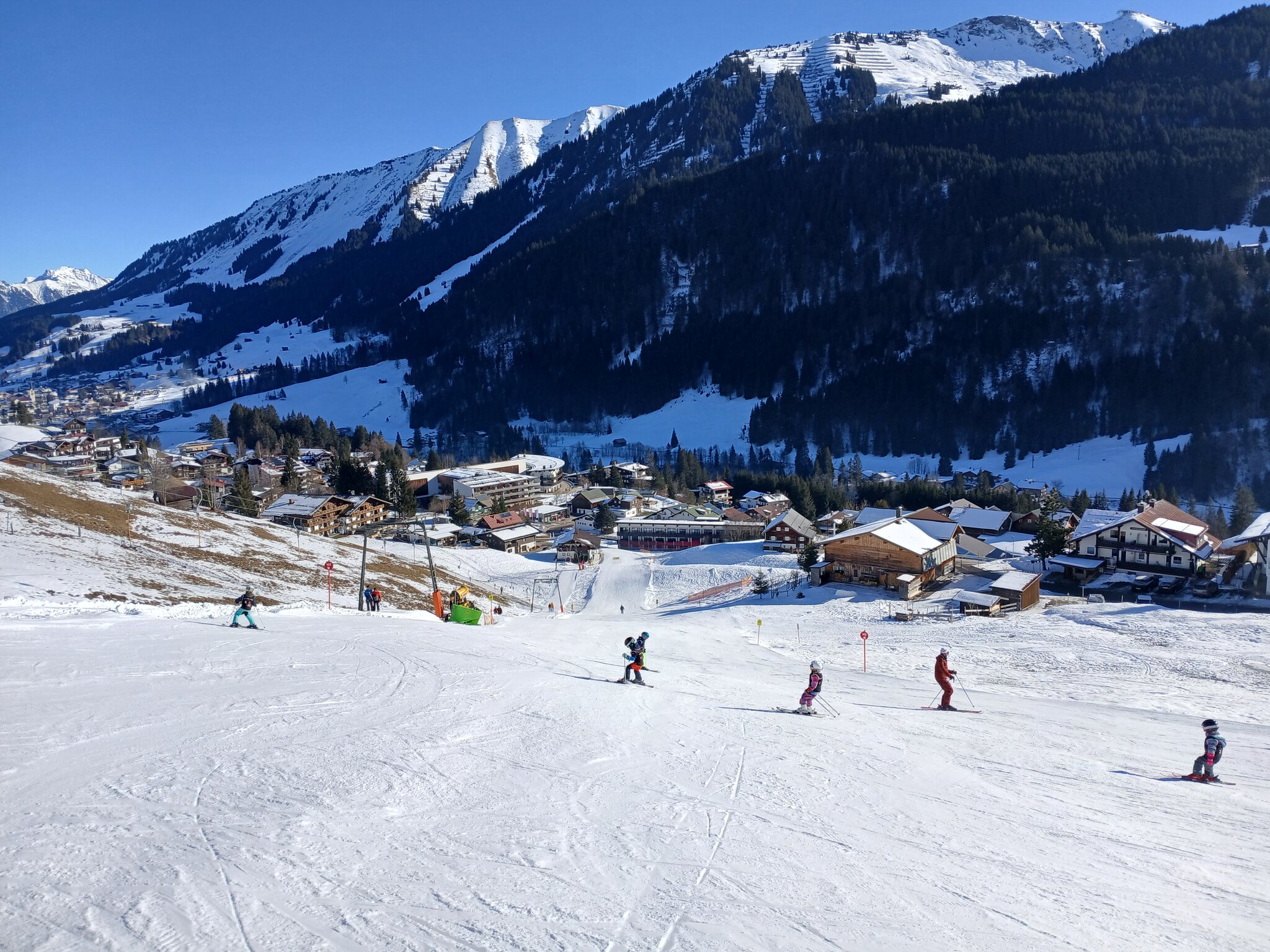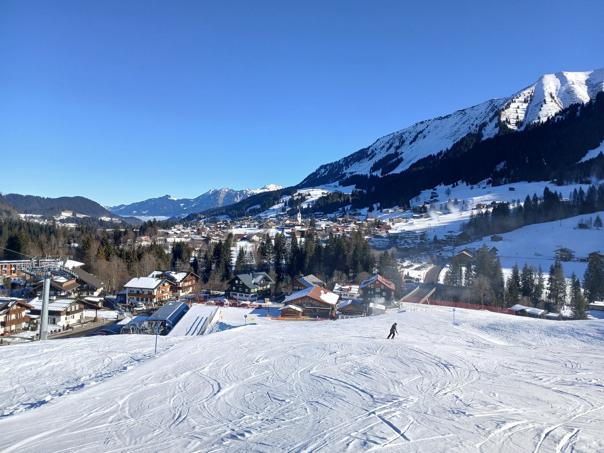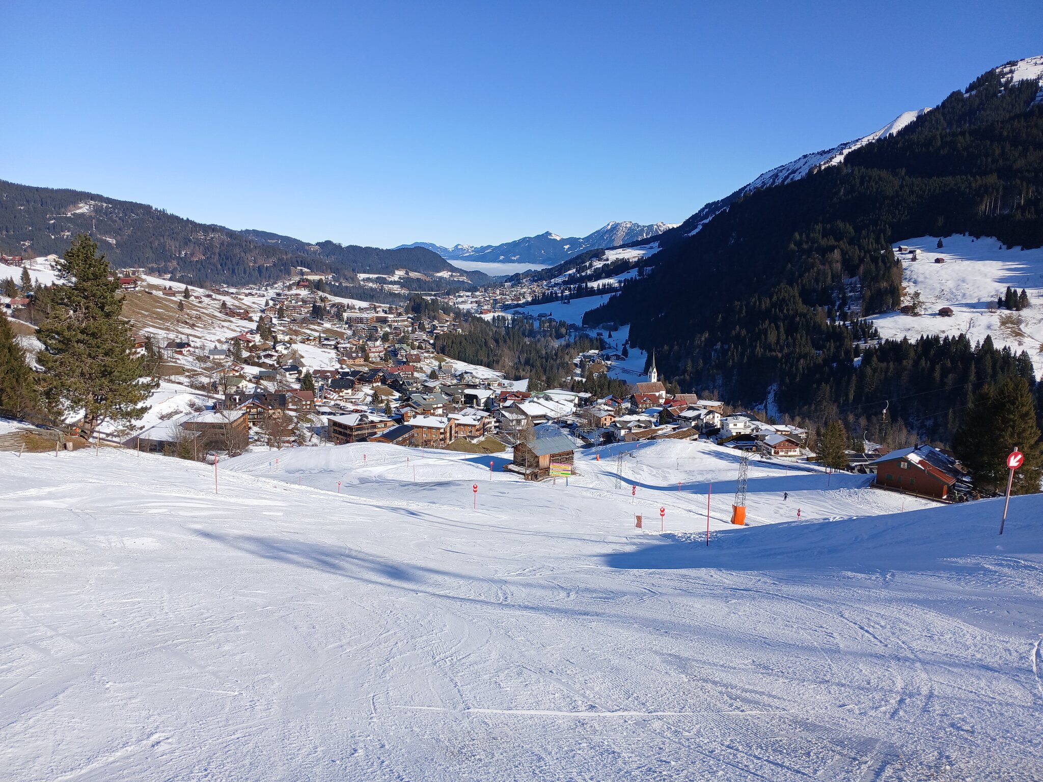 Blick von der tendenziell etwas schneearmen Talabfahrt am Walmendinger Horn auf Mittelberg