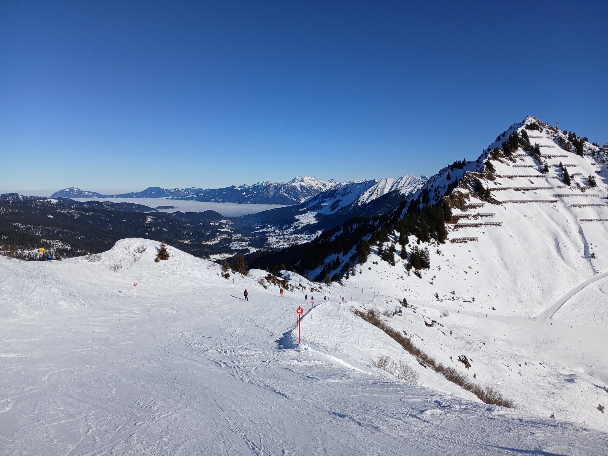 Um 08:30 Uhr ging es mit der Kanzelwandbahn ins erste Teilskigebiet. Dort waren so gut wie alle Pisten geöffnet. Die schwarze 6 war im interaktiven Pistenplan als geöffnet gekennzeichnet. In Realität war sie gepistet, ausgesteckt aber weiterhin mit einem „Gesperrt“-Schild versehen. Sie war aber auch furchtbar knollig.