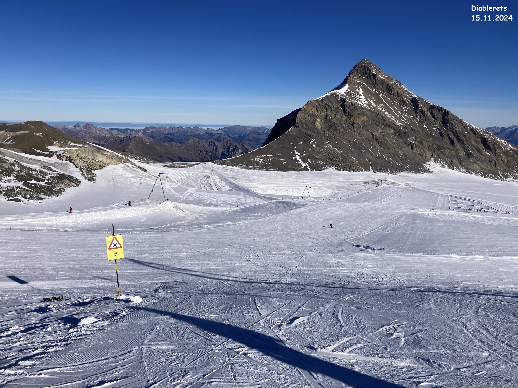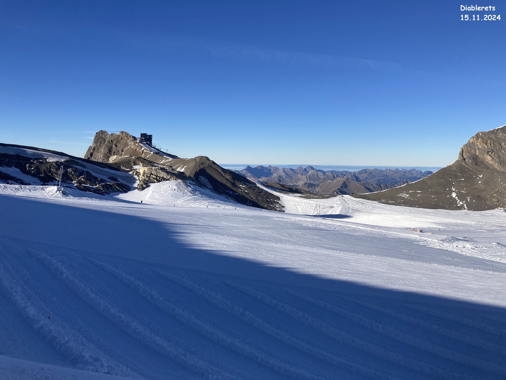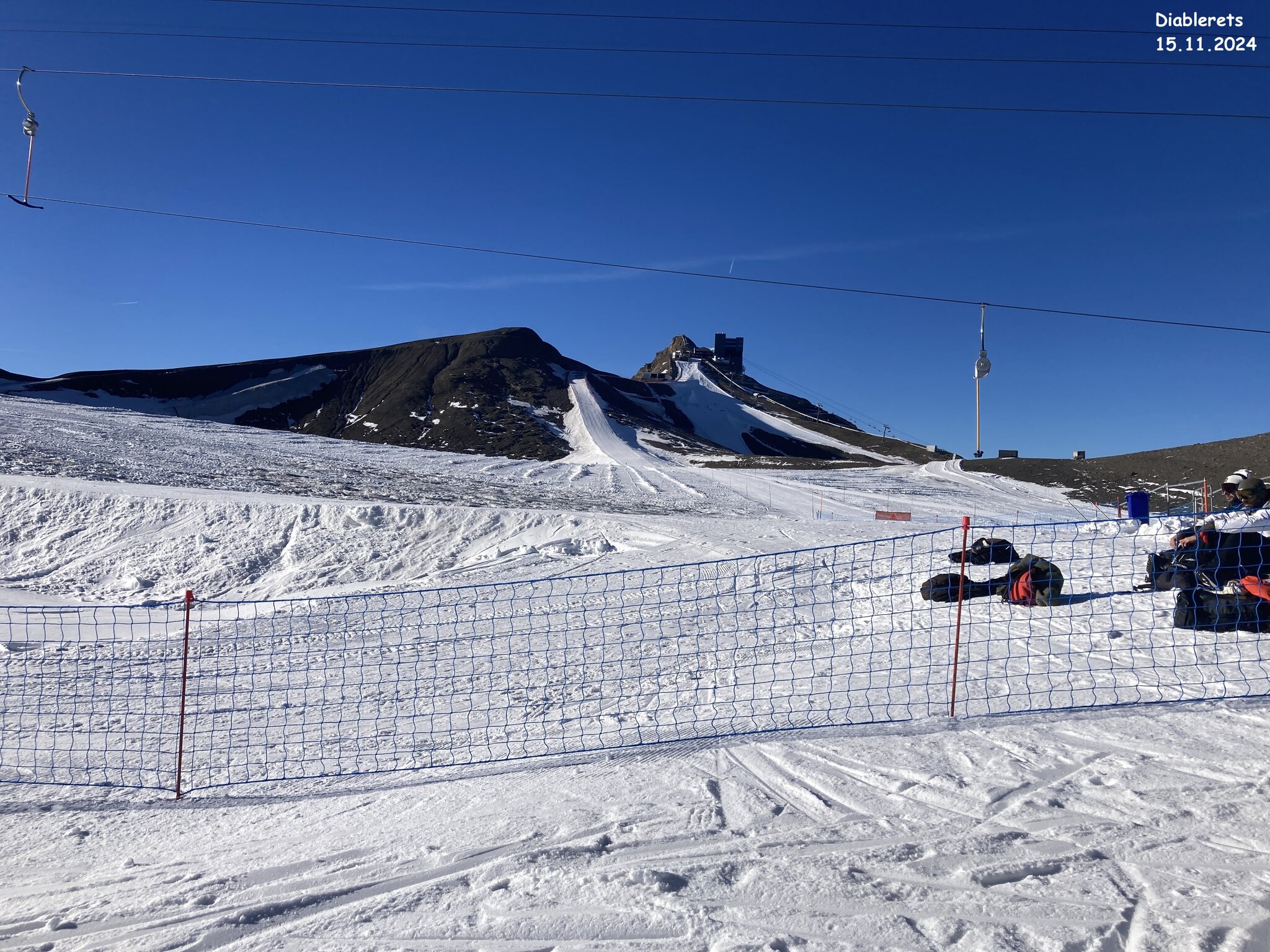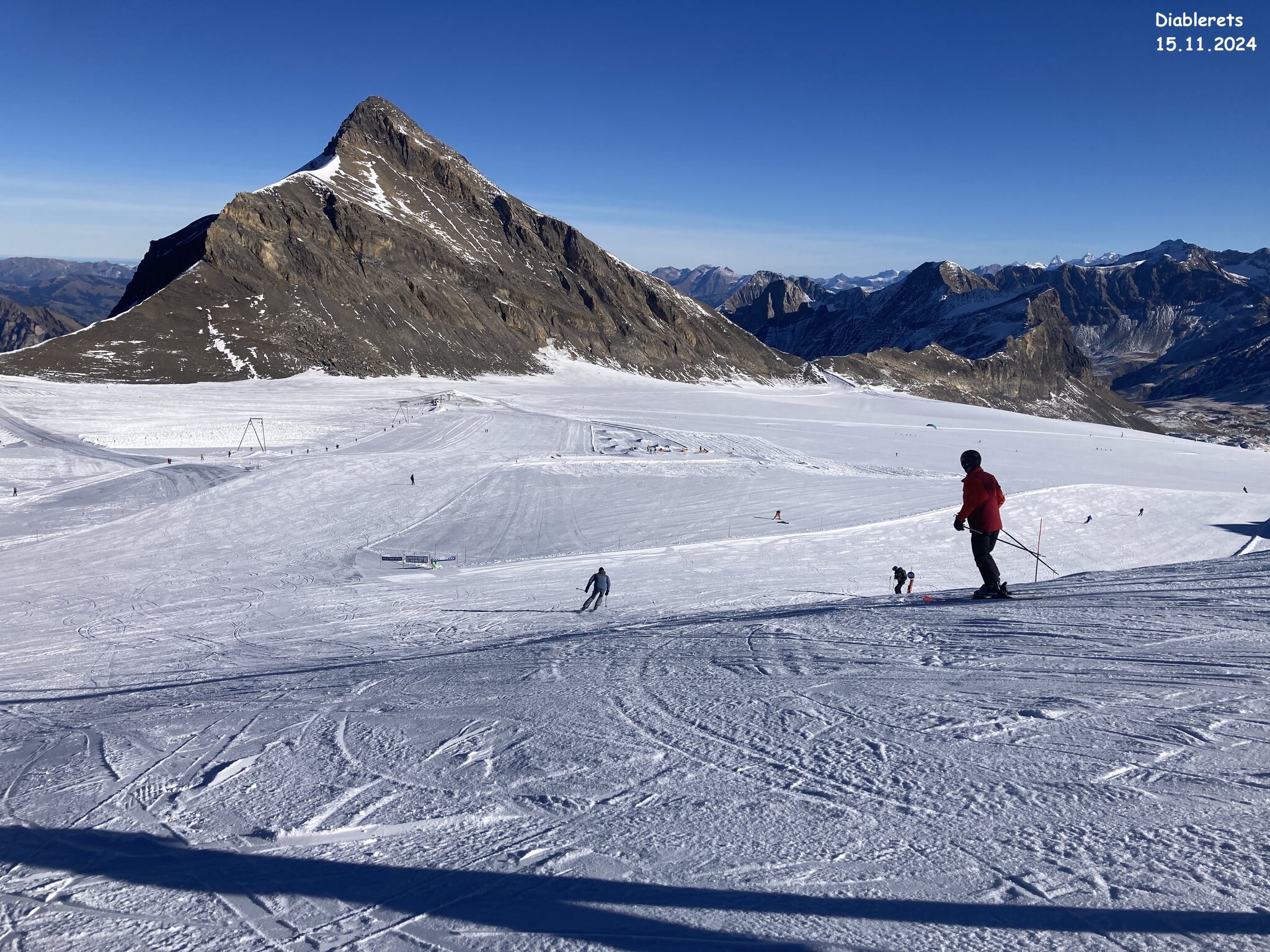 Heute in Glacier 3000 (Diablerets), gute Bedingungen. Guter, wenn auch etwas weicher Schnee. Skilifte Le Dôme und Tzanfleuron mit ihren blauen Pisten geöffnet. Sessellift und rote Piste von Scex Rouge geöffnet. Es gibt jetzt einen kleinen Snowpark in Le Dôme und der große Snowpark ist in Le Scex Rouge.
