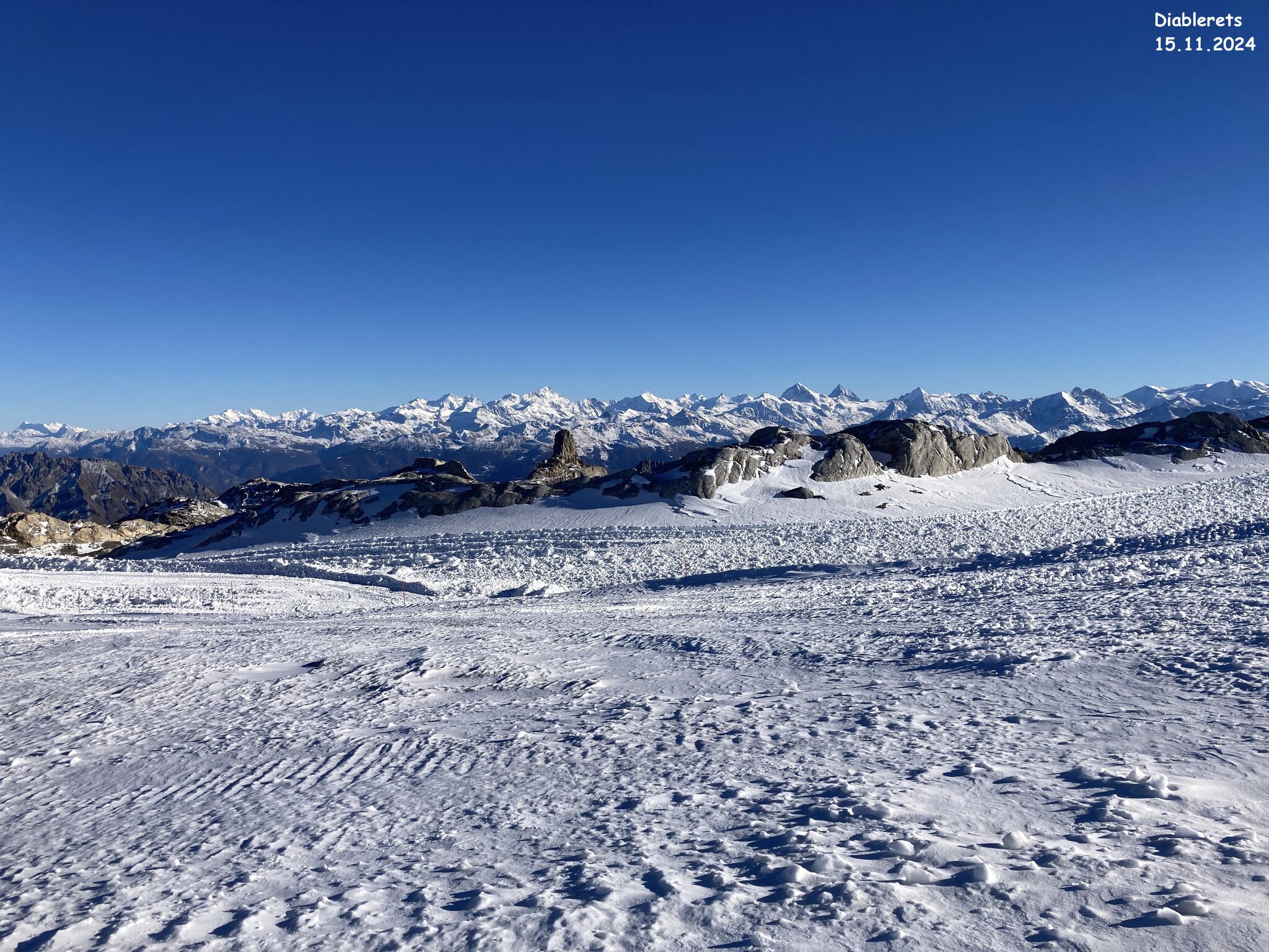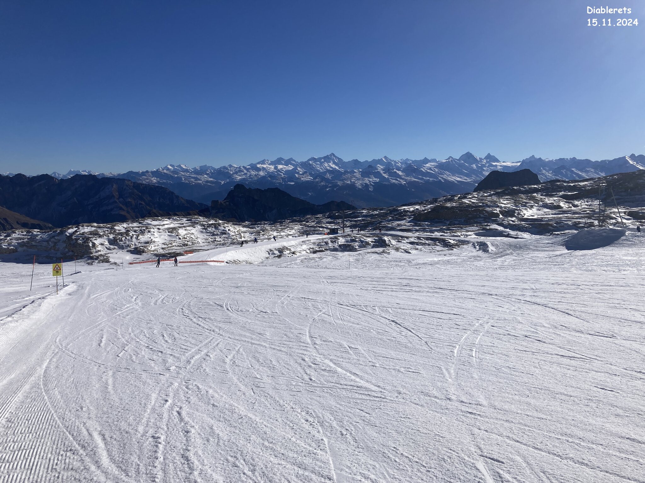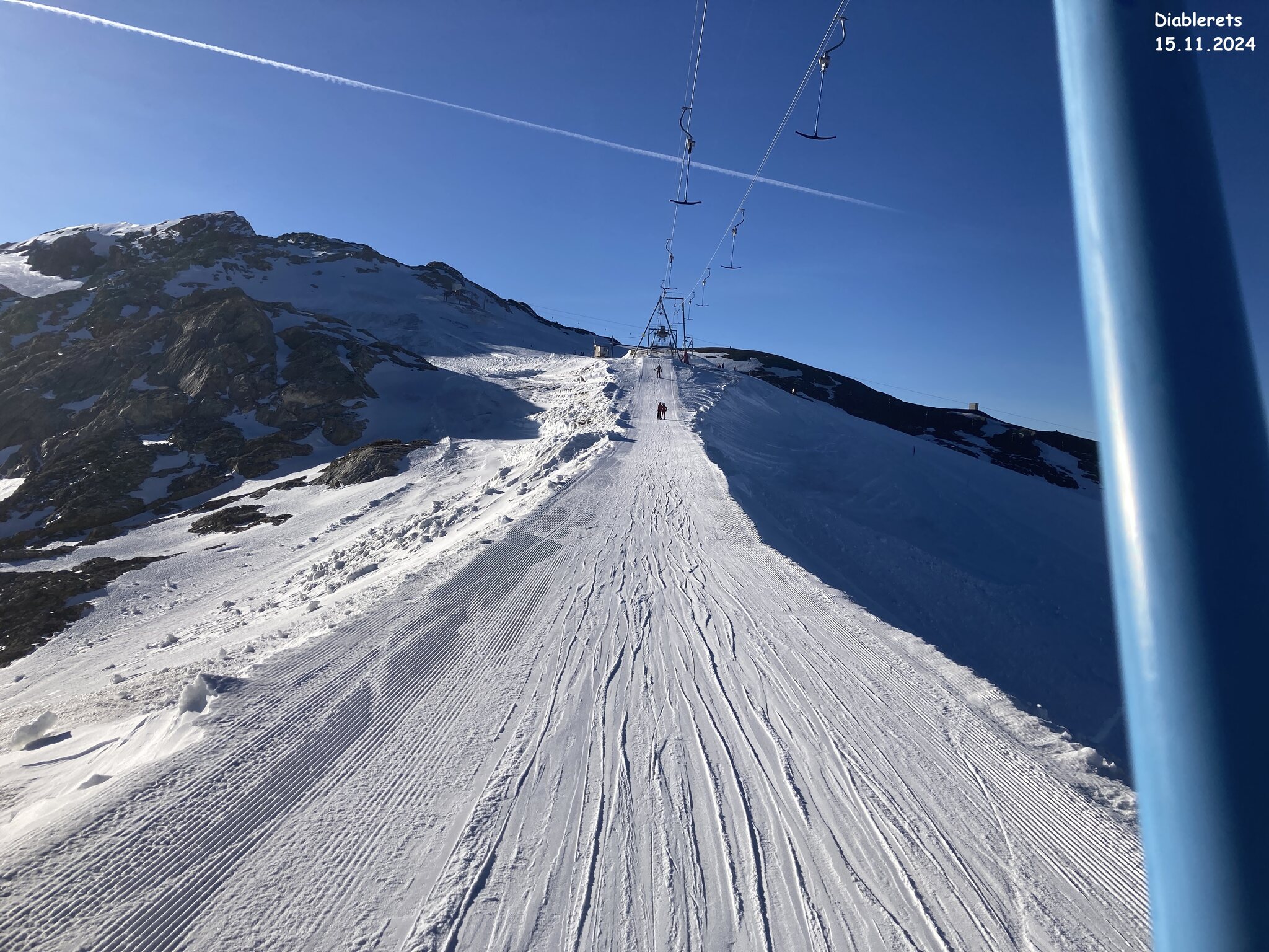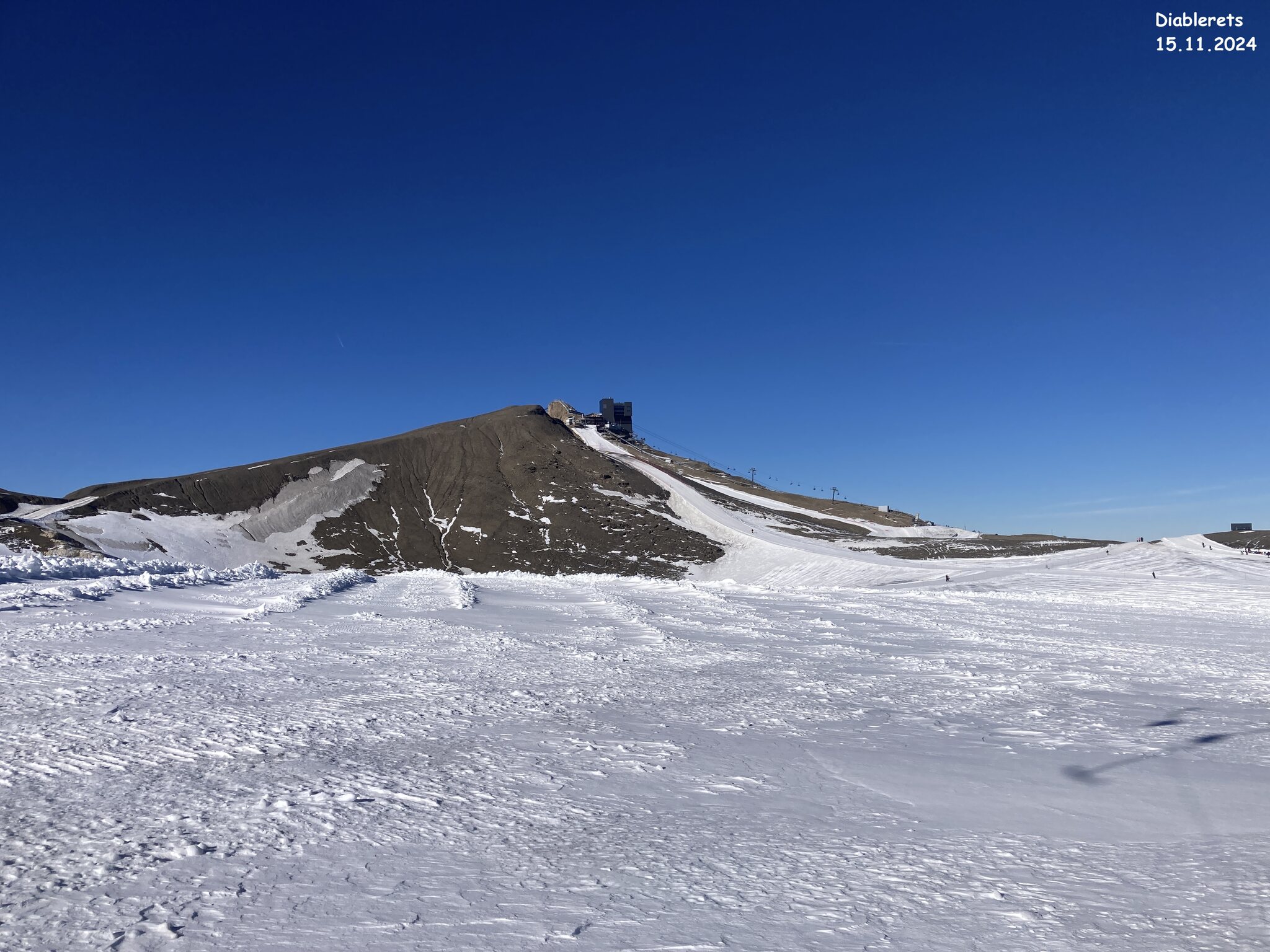 Heute in Glacier 3000 (Diablerets), gute Bedingungen. Guter, wenn auch etwas weicher Schnee. Skilifte Le Dôme und Tzanfleuron mit ihren blauen Pisten geöffnet. Sessellift und rote Piste von Scex Rouge geöffnet. Es gibt jetzt einen kleinen Snowpark in Le Dôme und der große Snowpark ist in Le Scex Rouge.