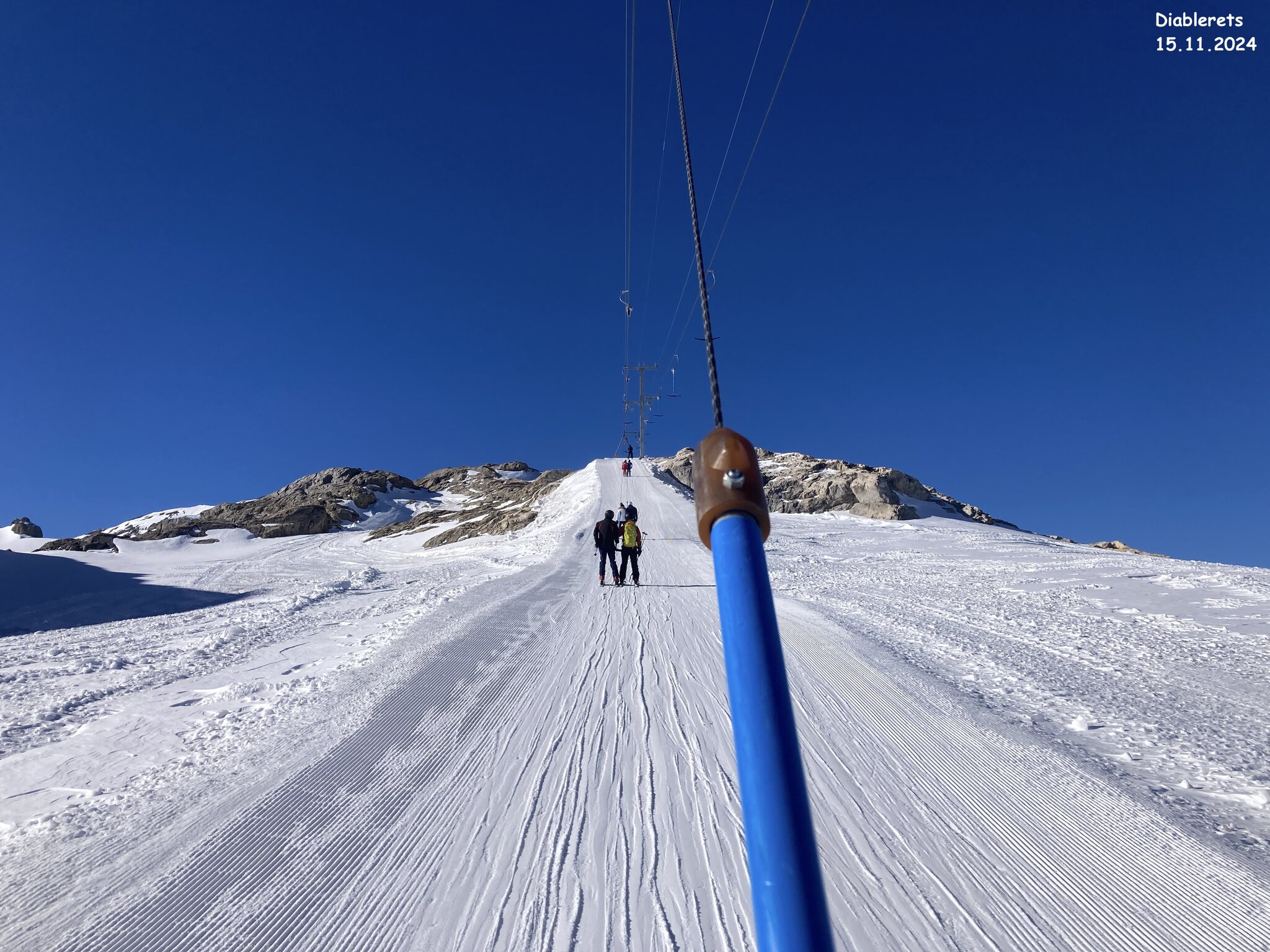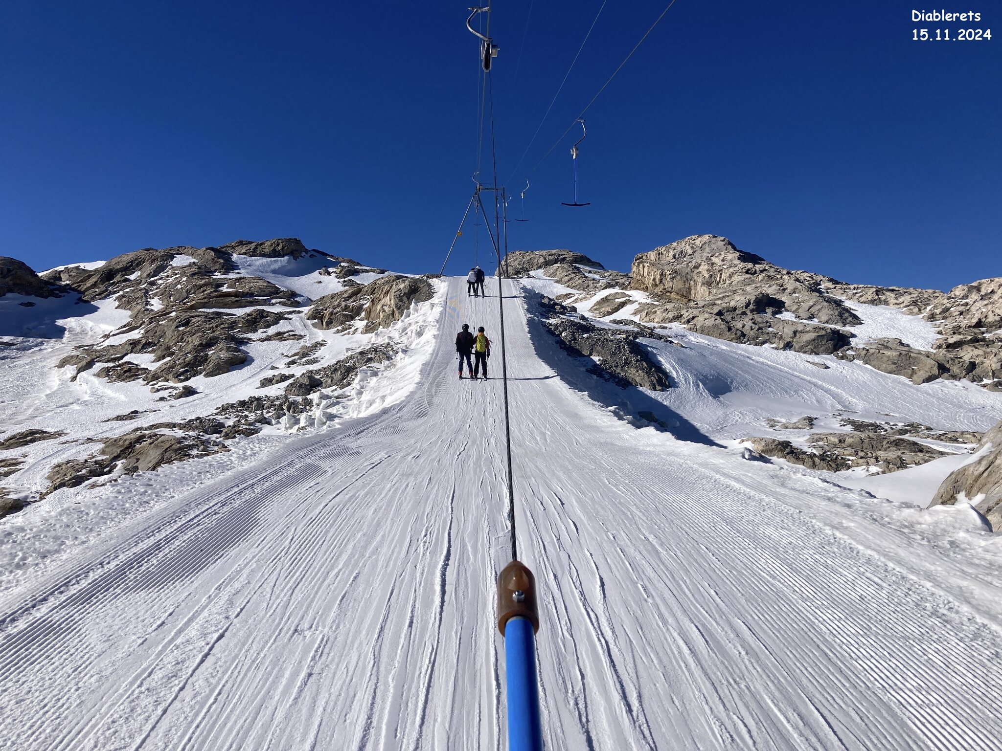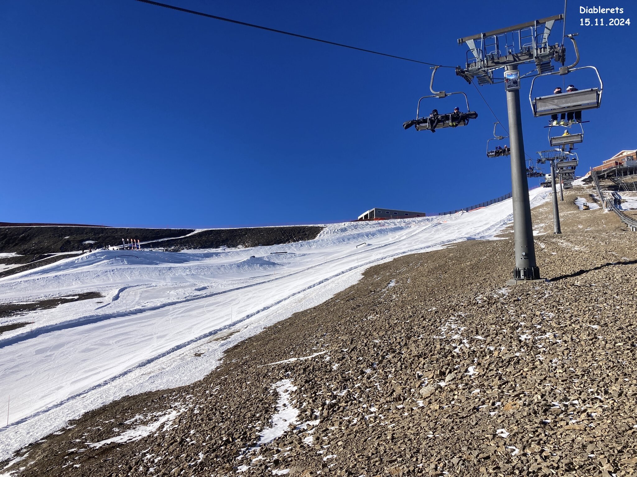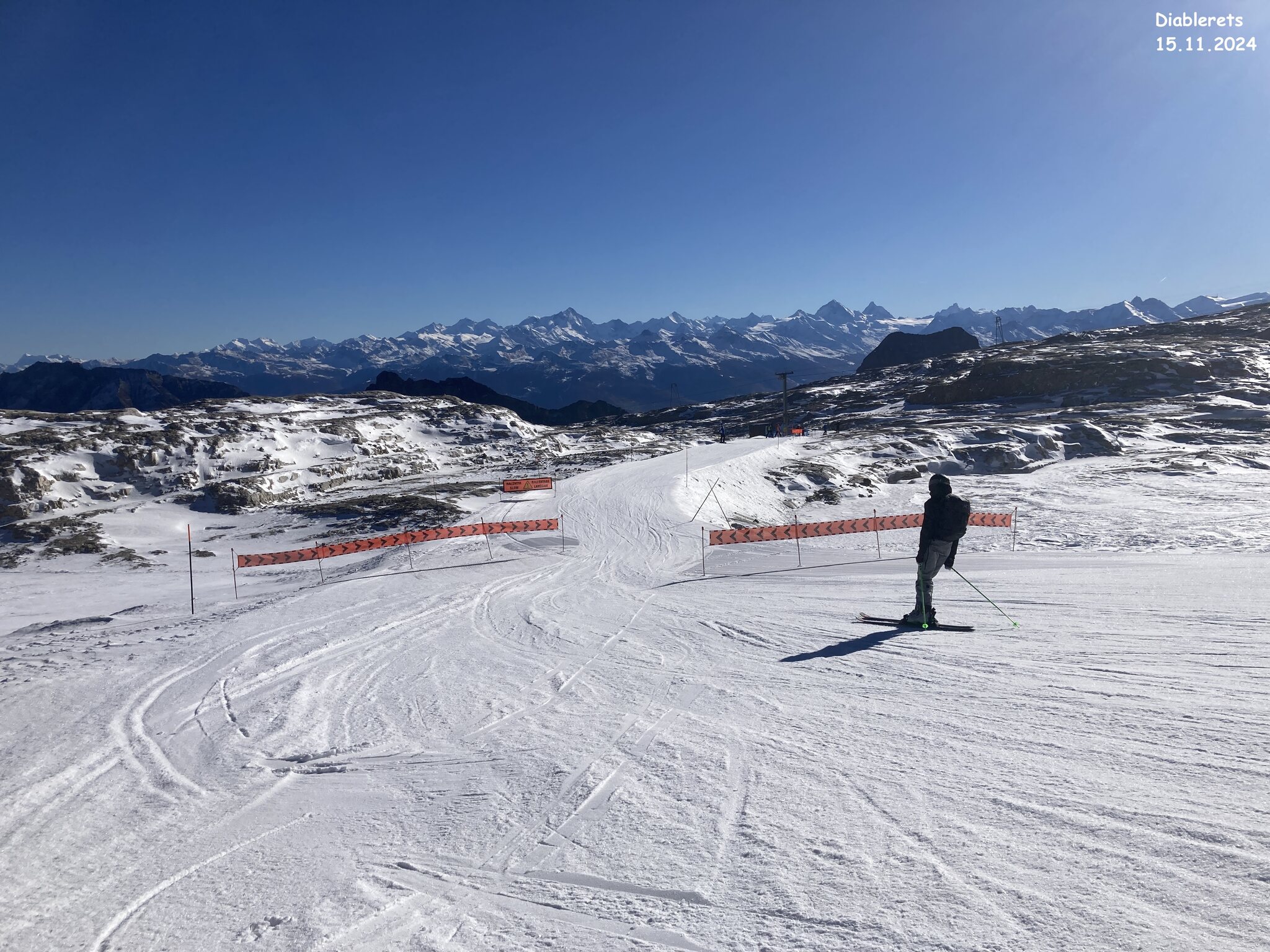 Heute in Glacier 3000 (Diablerets), gute Bedingungen. Guter, wenn auch etwas weicher Schnee. Skilifte Le Dôme und Tzanfleuron mit ihren blauen Pisten geöffnet. Sessellift und rote Piste von Scex Rouge geöffnet. Es gibt jetzt einen kleinen Snowpark in Le Dôme und der große Snowpark ist in Le Scex Rouge.