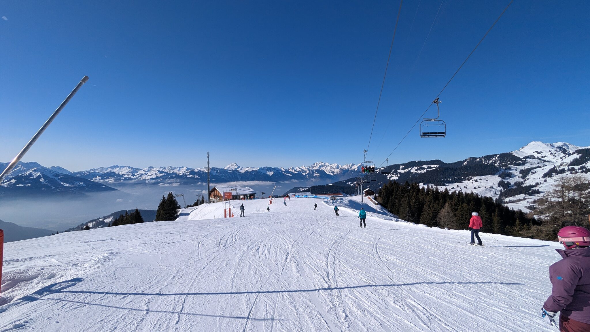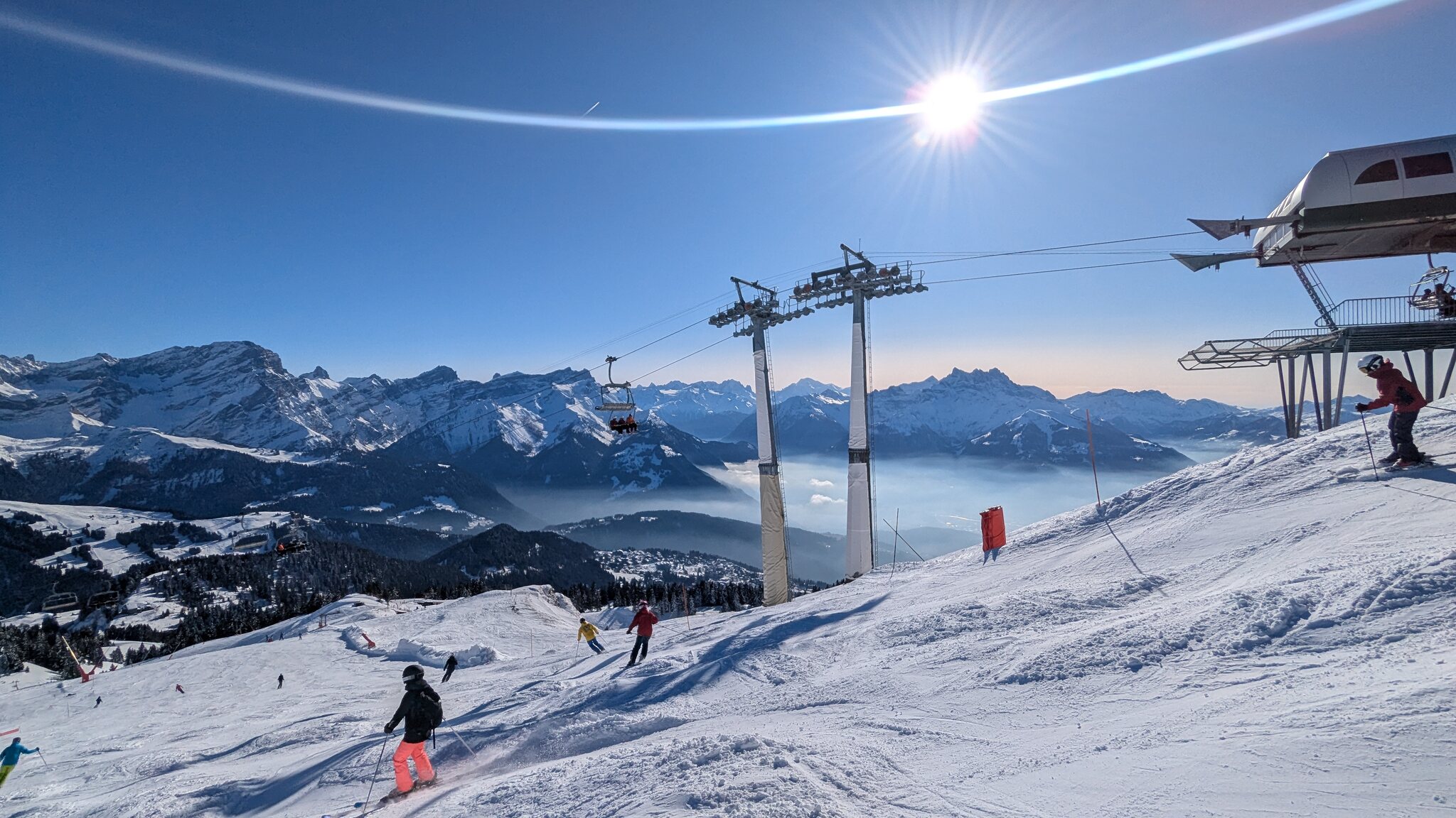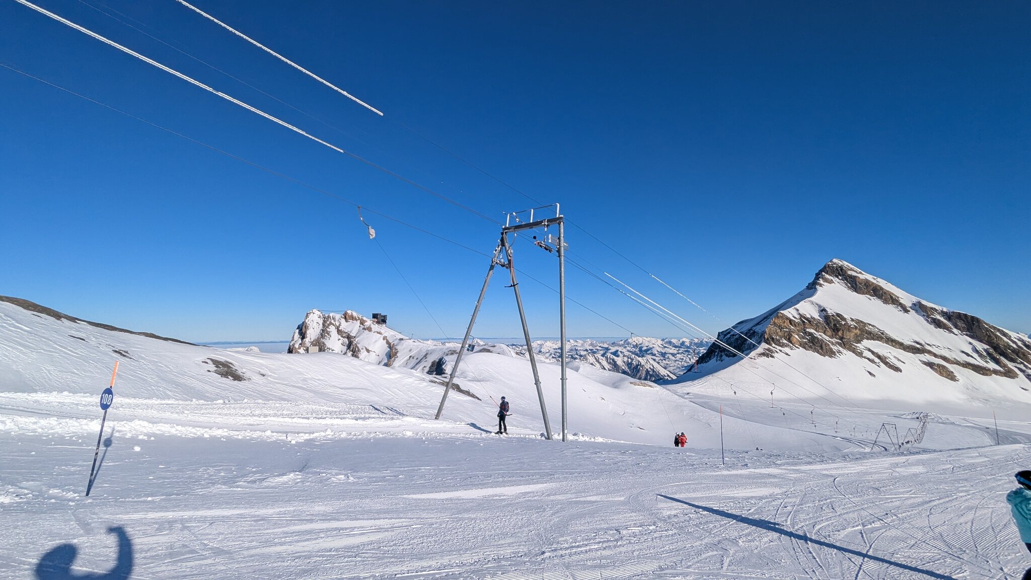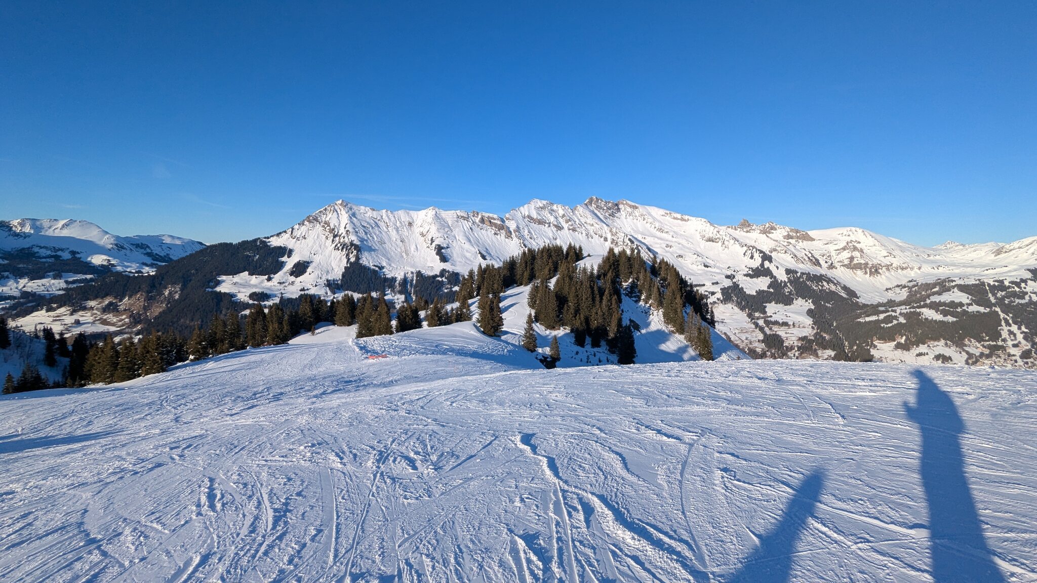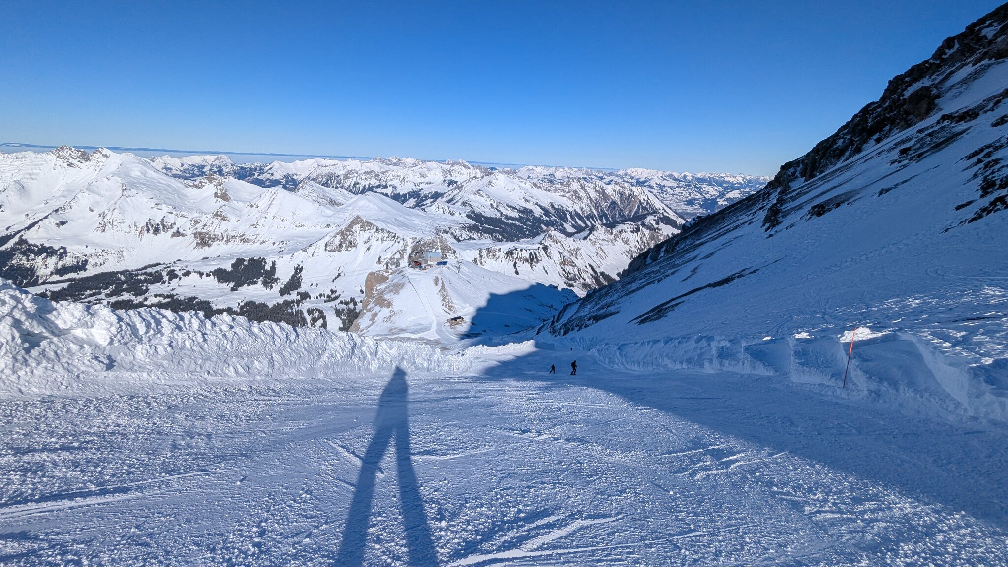 Wenig Schnee, aber Top-Bedingungen, immer noch tolles Panorama und nicht zu viele Leute. Keine Wartezeiten an den Skiliften.