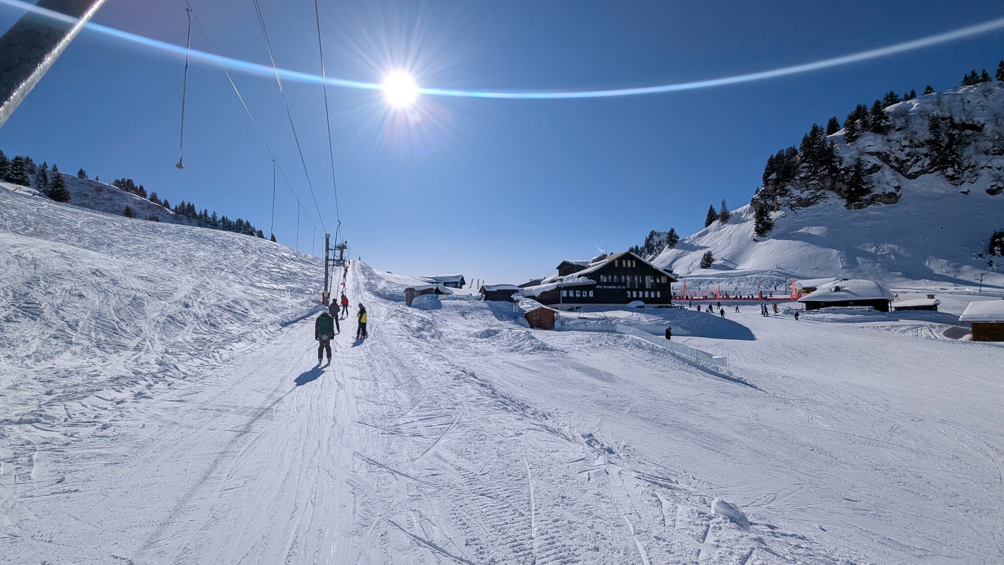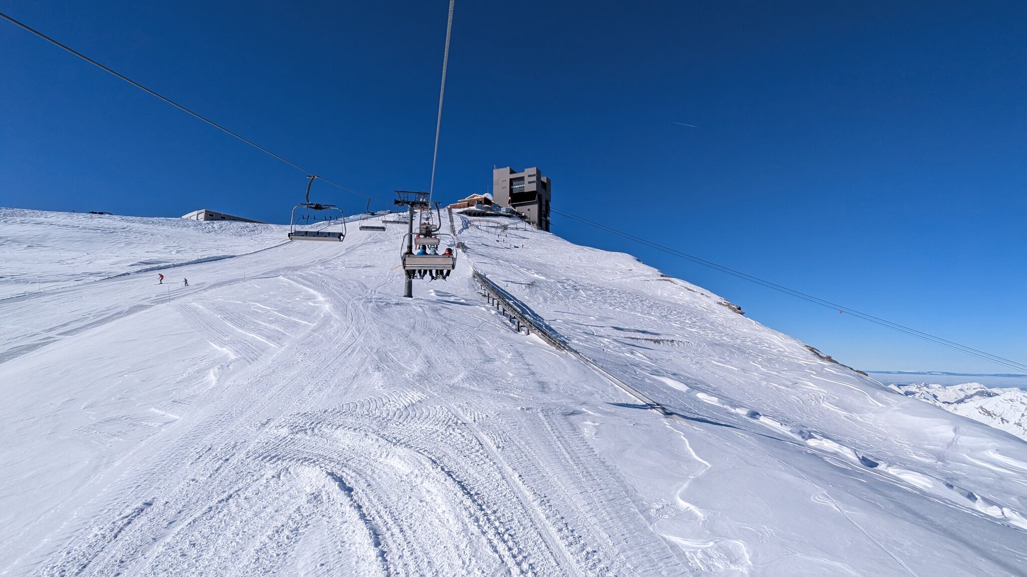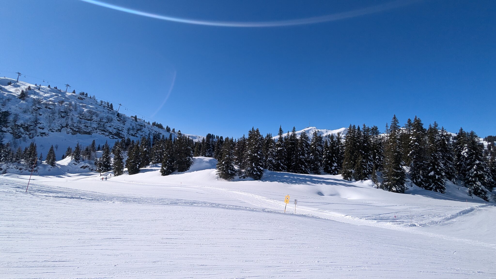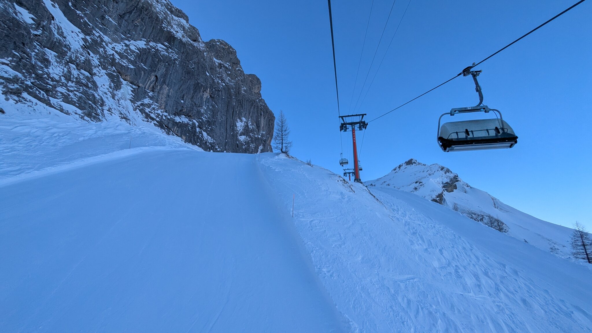 Wenig Schnee, aber Top-Bedingungen, immer noch tolles Panorama und nicht zu viele Leute. Keine Wartezeiten an den Skiliften.