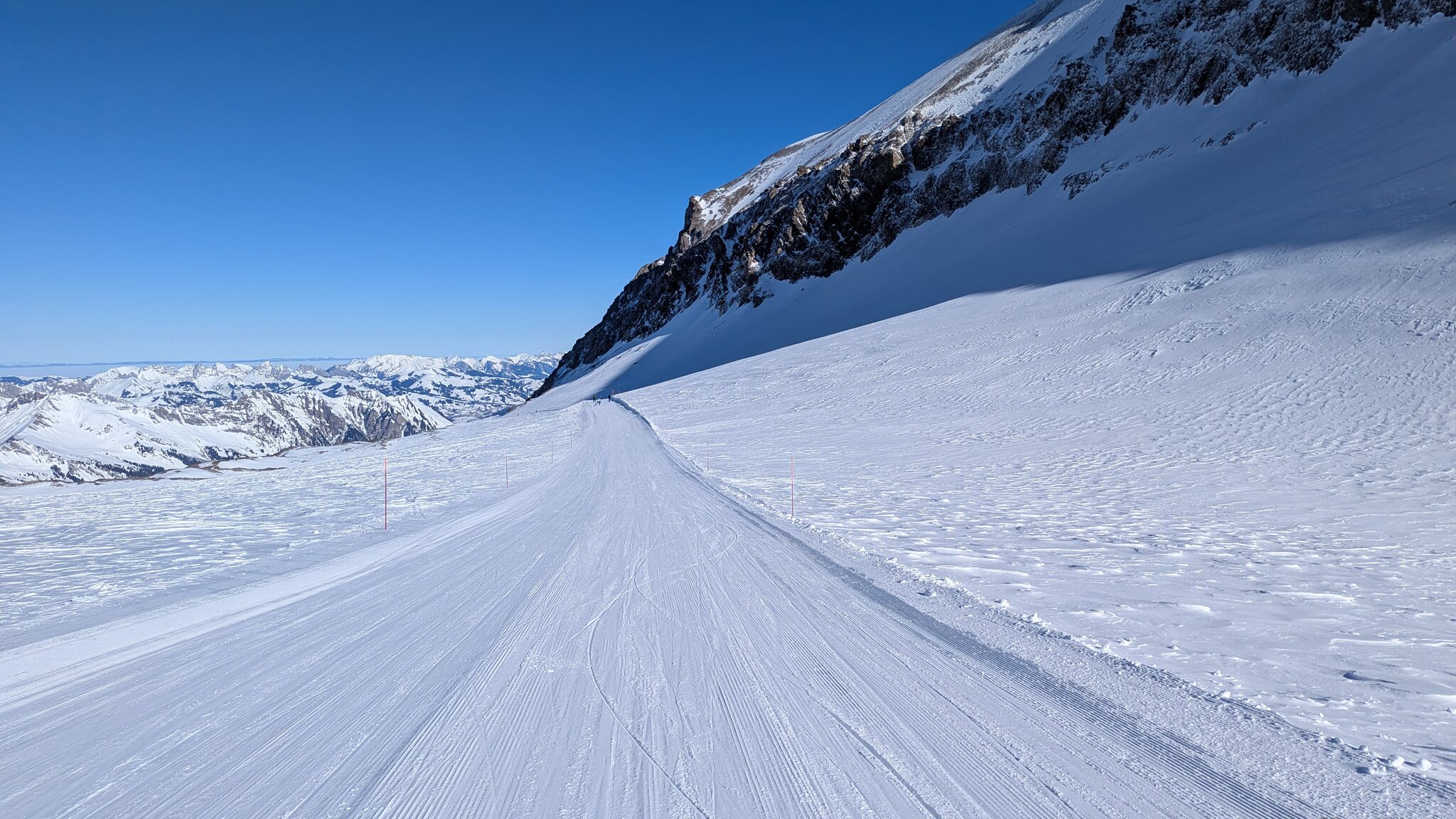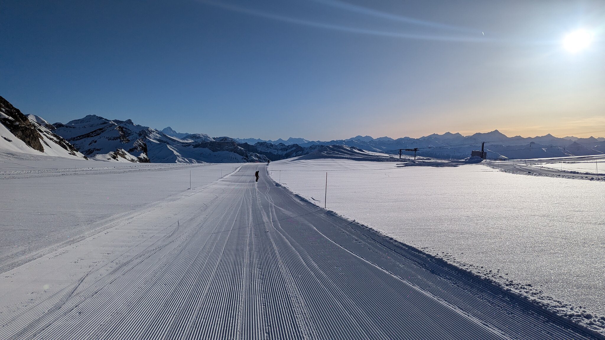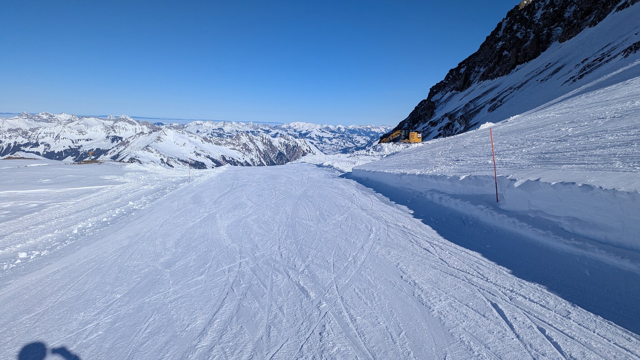 The access piste to the glacier deteriorated during the day, revealing some stones, but the pistes on the glacier were super pleasant all day long.