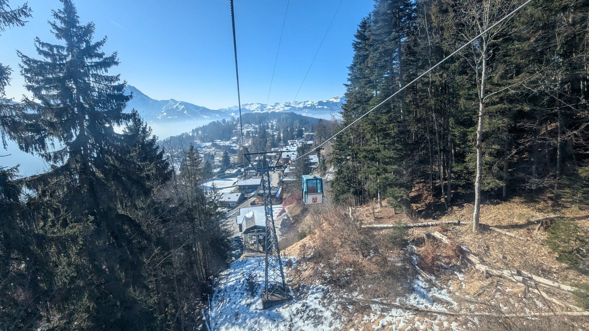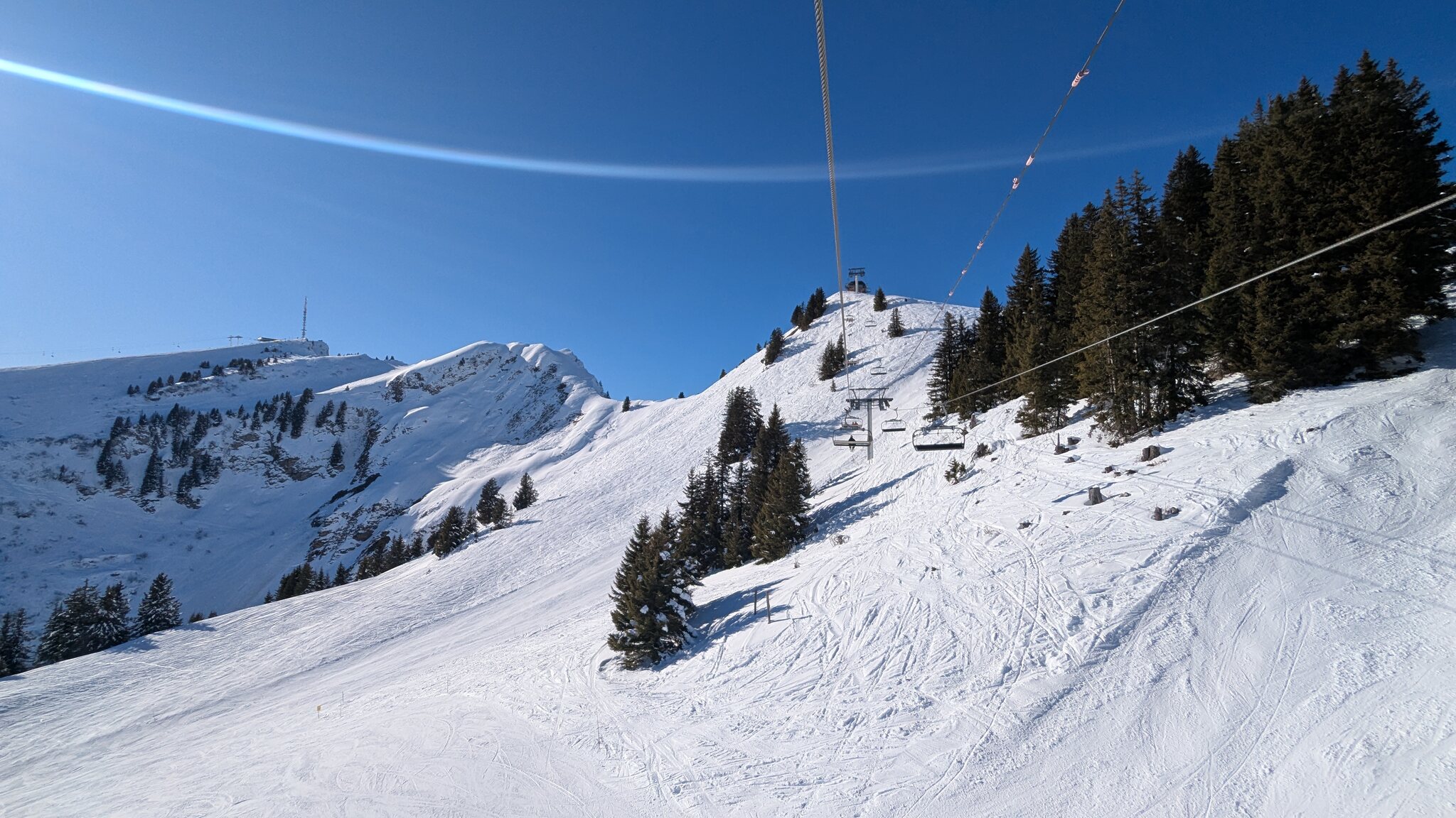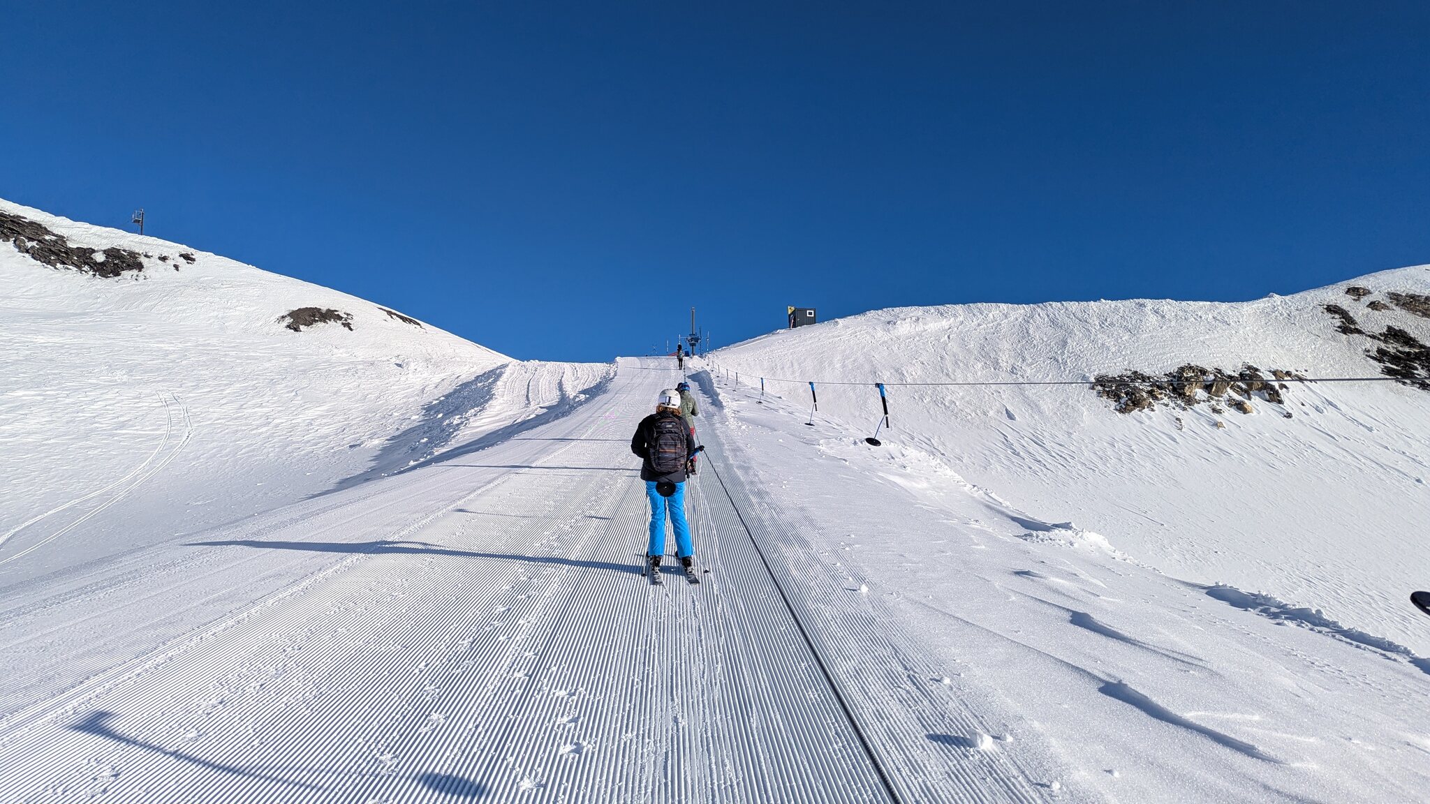 - Jetzt noch der obligatorische Abstecher nach Vers l'Eglise. Der uralte Stangenschlepper unten in der ersten Sektion fährt sehr zügig und gefällt mir! Im Gegensatz dazu ist die zweite Sektion Schlepplift ein typischer Bügellift der unerträglich langsam fährt! Daher erneut, ein Hoch auf den Stangenschlepper!