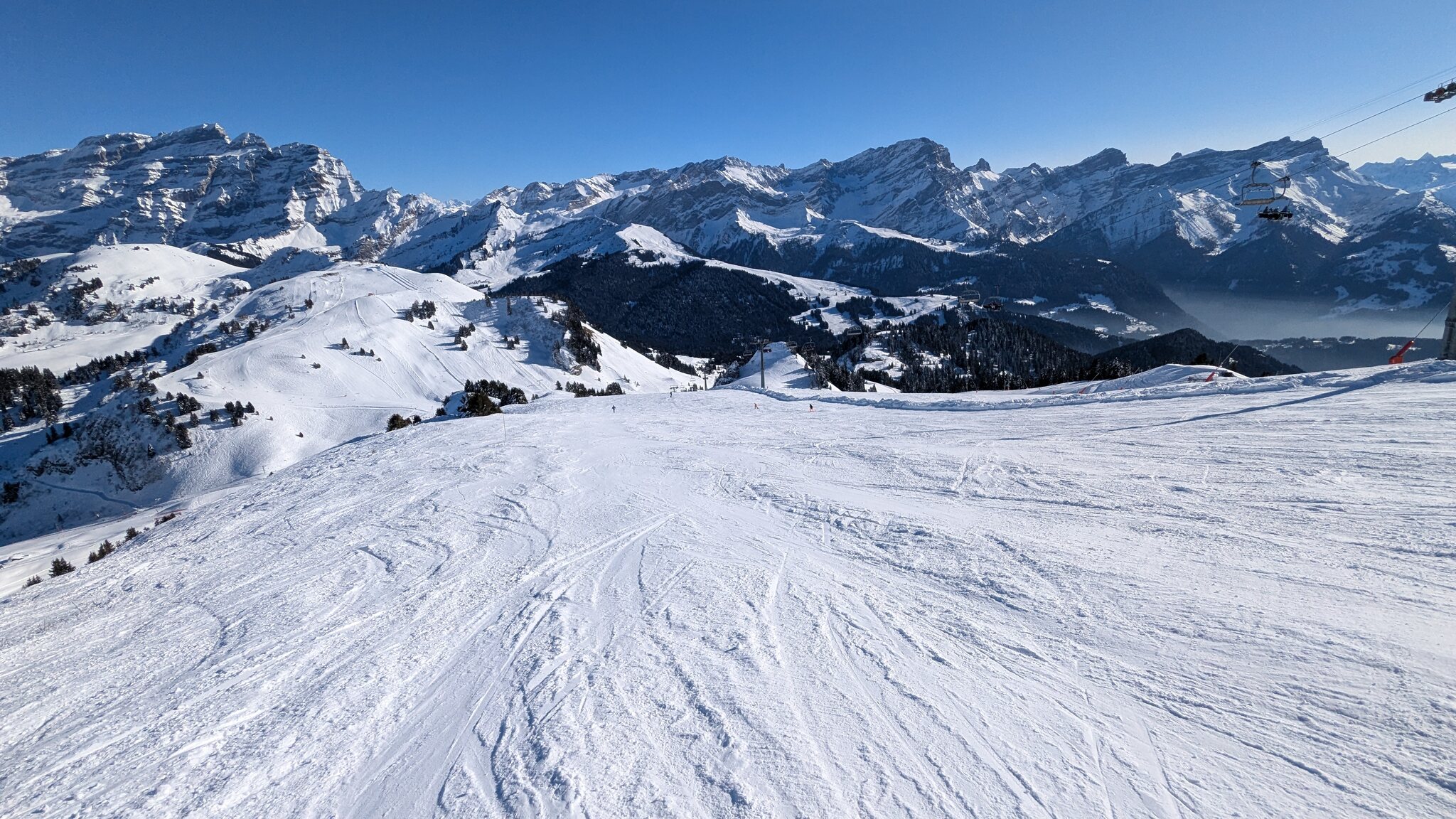 Drüben in Les Diablerets dann alles schon mehr abgerutscht und sulziger aber dafür eine gemütliche Ski Atmosphäre, fühlt sie fast wie Frankreich an! Am Ende aber deutlich voller und eisiger als ich es erwartet habe.