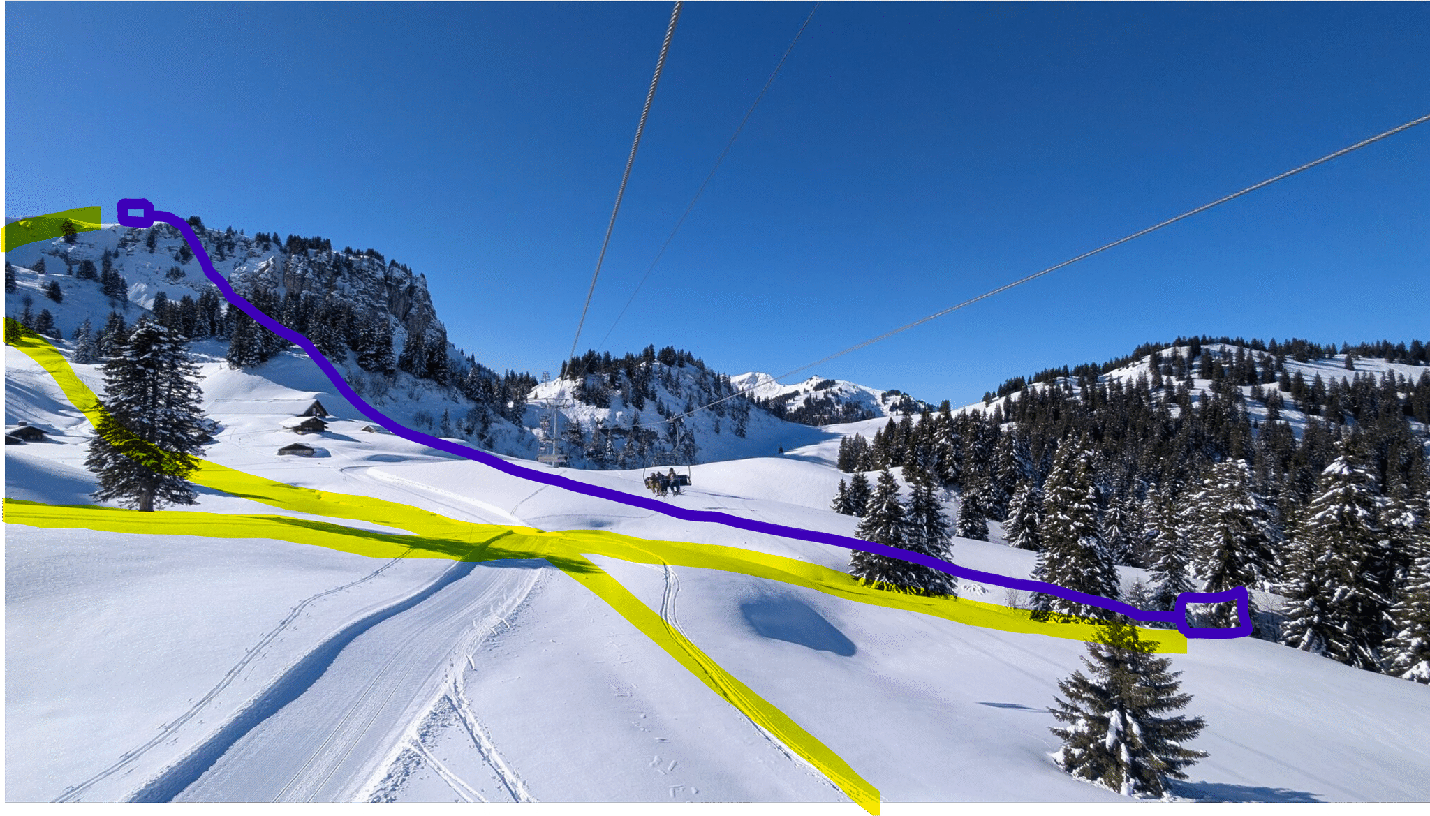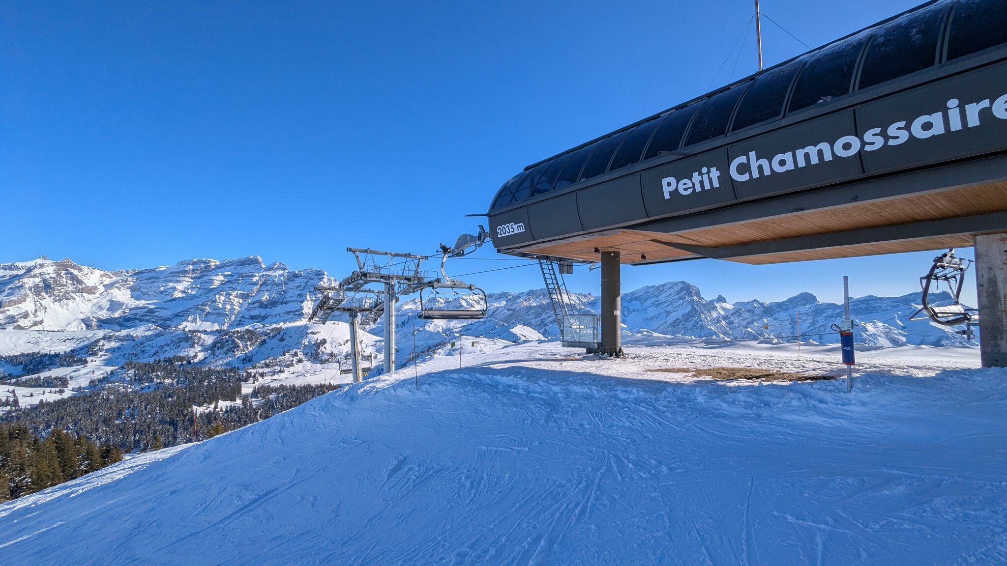 Ein kurzer fix geklemmter Sessellift führt auf den Zwischenhügel auf etwa 2020 Meter Höhe. Von dort ergibt sich eine lange Abfahrt bis zur bestehenden Talstation TSD Laouissalet-Meilleret auf der Seite Les Diablerets. Vor Ort habe ich einige Spuren im Schnee auf genau dieser möglichen Piste entdeckt. Die sind wohl das kurze Stück selbst aufgestiegen. Einzig in der Mitte bei den Hütten ist ein flaches Stück, bei dem aktuell eine Schiebestelle ist. Mit einer guten Pistenführung und Präparierung kann man mit Schwung aber wahrscheinlich ohne Schieben durch fahren. In Richtung Les Villars wird weiterhin der Verbindungslift benötigt.