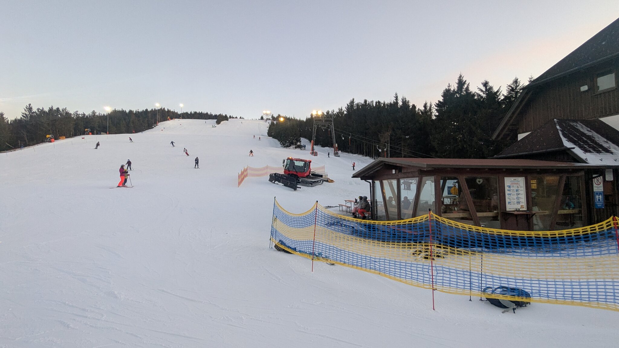 Die Bekanntmachung im Radio hat wohl niemanden interessiert, jedenfalls verloren sich an dem 200 m langen Hang, bedient von einem Stemag-Schlepplift von ca. 1970, gerade mal 10 Skigäste. Der Lift wird von einem ehrenamtlich agierenden Team älterer Einheimischer betrieben, sonst gäbe es ihn schon nicht mehr. Der Hang ist nett, aber man ist natürlich mit wenigen Schwüngen wieder unten.