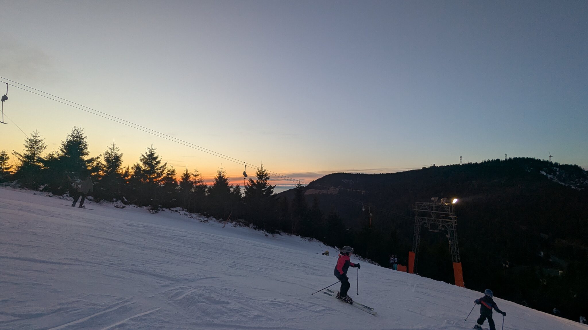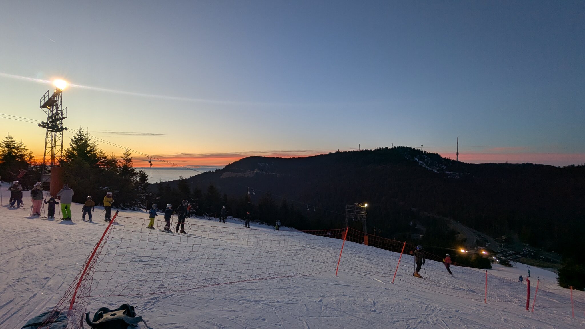 Heute geht es erneut zum Flutlicht Skifahren an den Mehliskopf. Es hat zwar vor ein paar Tagen frisch geschneit, aber bei ungefähr 10 Grad schmilzt. Der letzte Schnee wieder nur so dahin. Dafür wunderschöne Sonnenuntergangsstimmung bei der ersten Abfahrt!