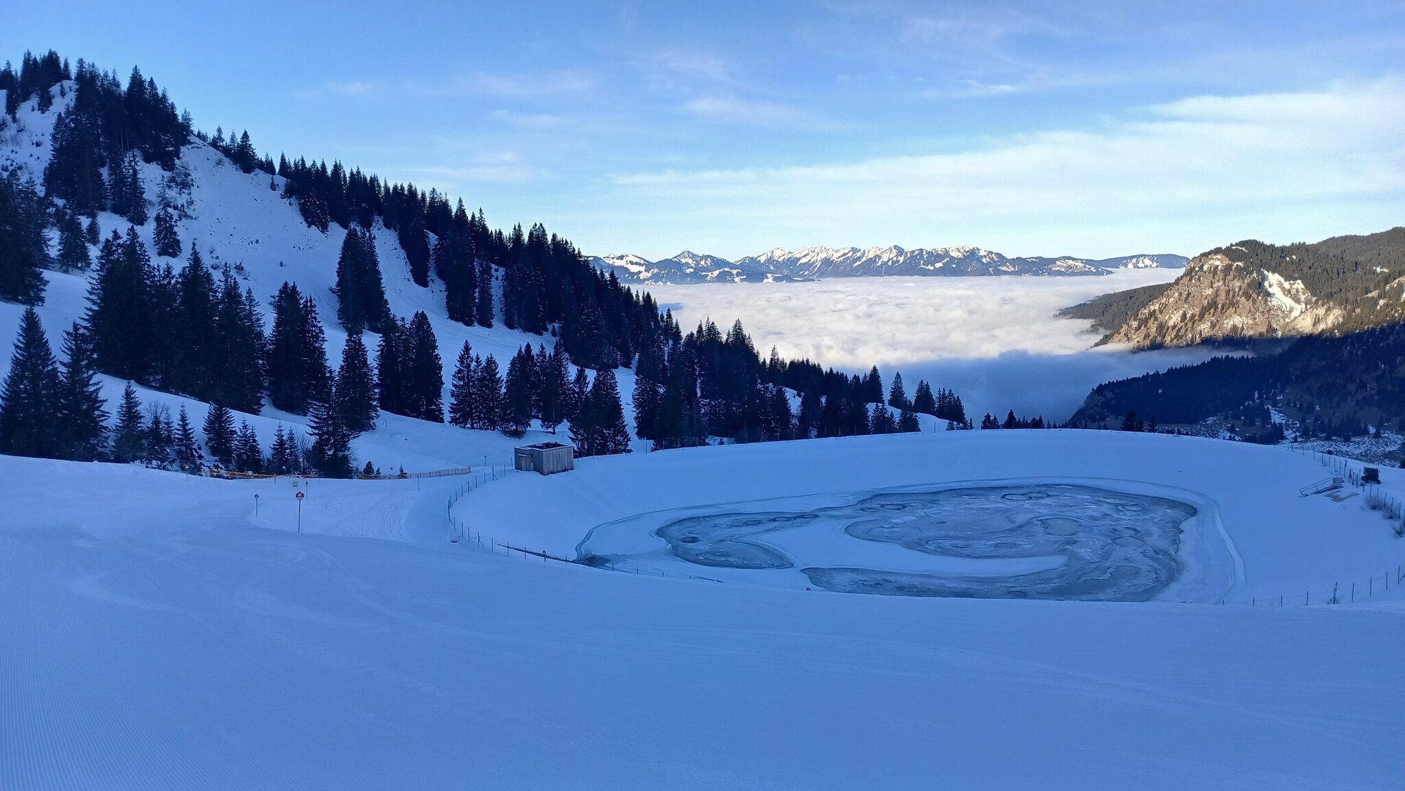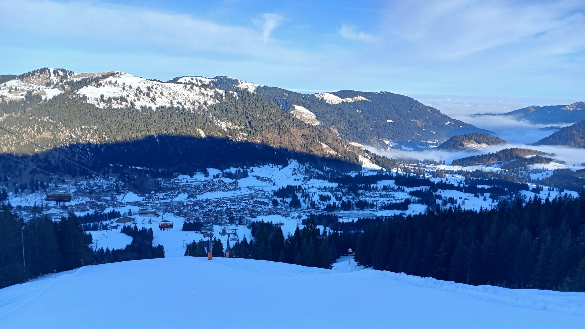 Am Oberjoch präsentierte sich das Wetter während meines Besuchs (Vormittagskarte um 40€ bis 13 Uhr) stets sehr gut. Es war quasi wolkenlos, während in Richtung Wertach und Bad Hindelang Nebel hing. Der Nebel kam aus Bad Hindelang ab und an bis zur Schwandenbahn hinauf, die „richtigen“ Anlagen wurden aber vom Nebel verschont. Es war dazu recht frisch mit deutlichen Minusgraden. Auffällig ist, dass selbst jetzt im Februar die Sonne immer noch kaum ins Gebiet reinkommt.