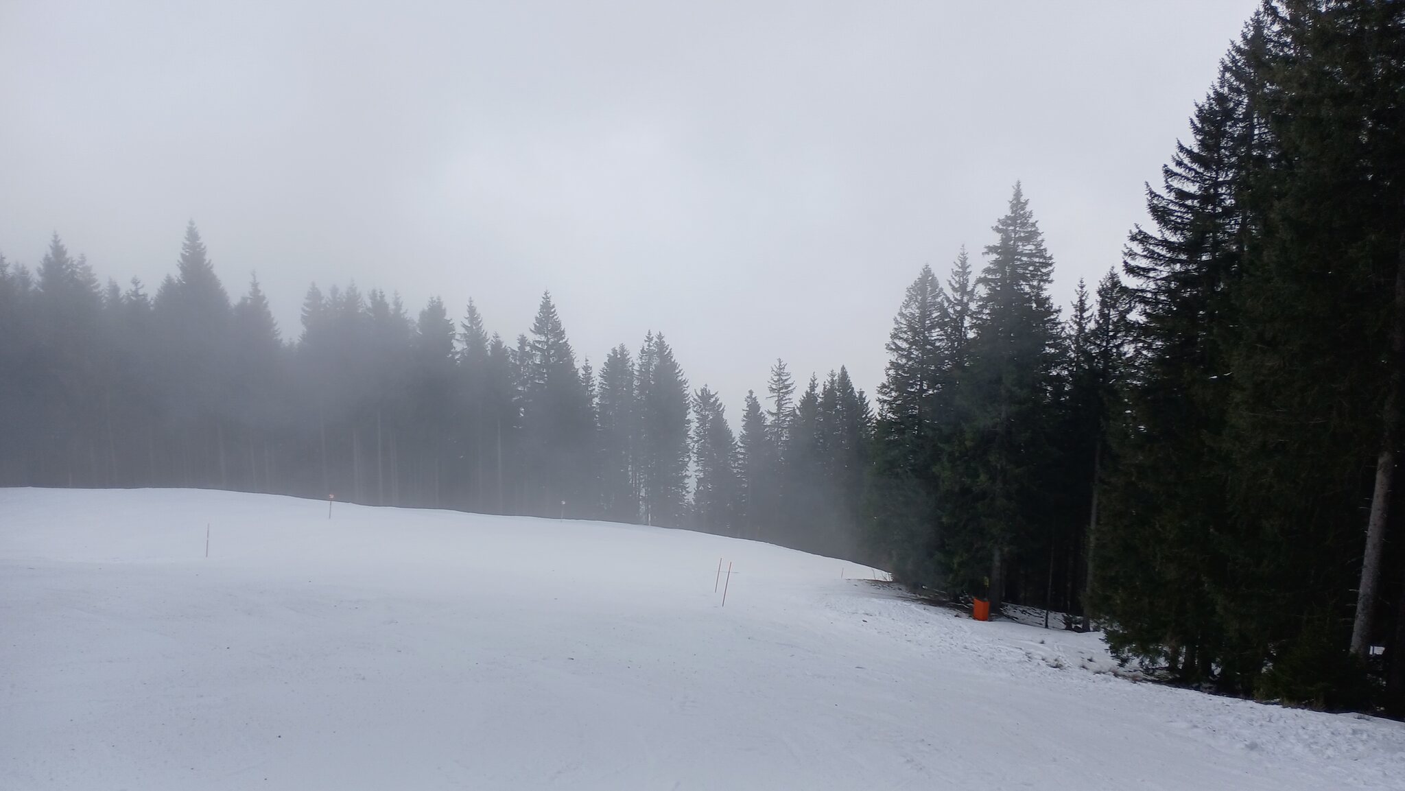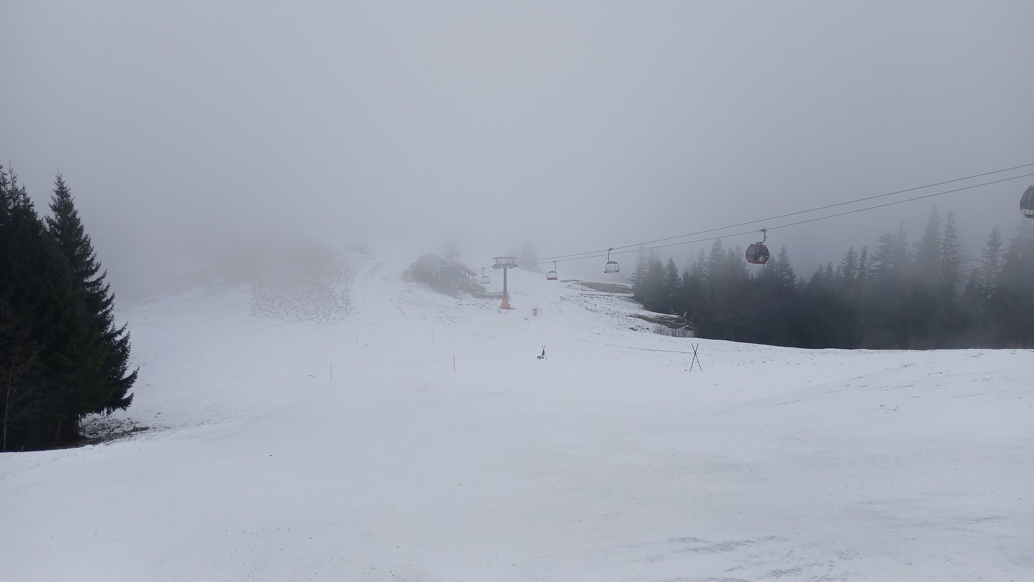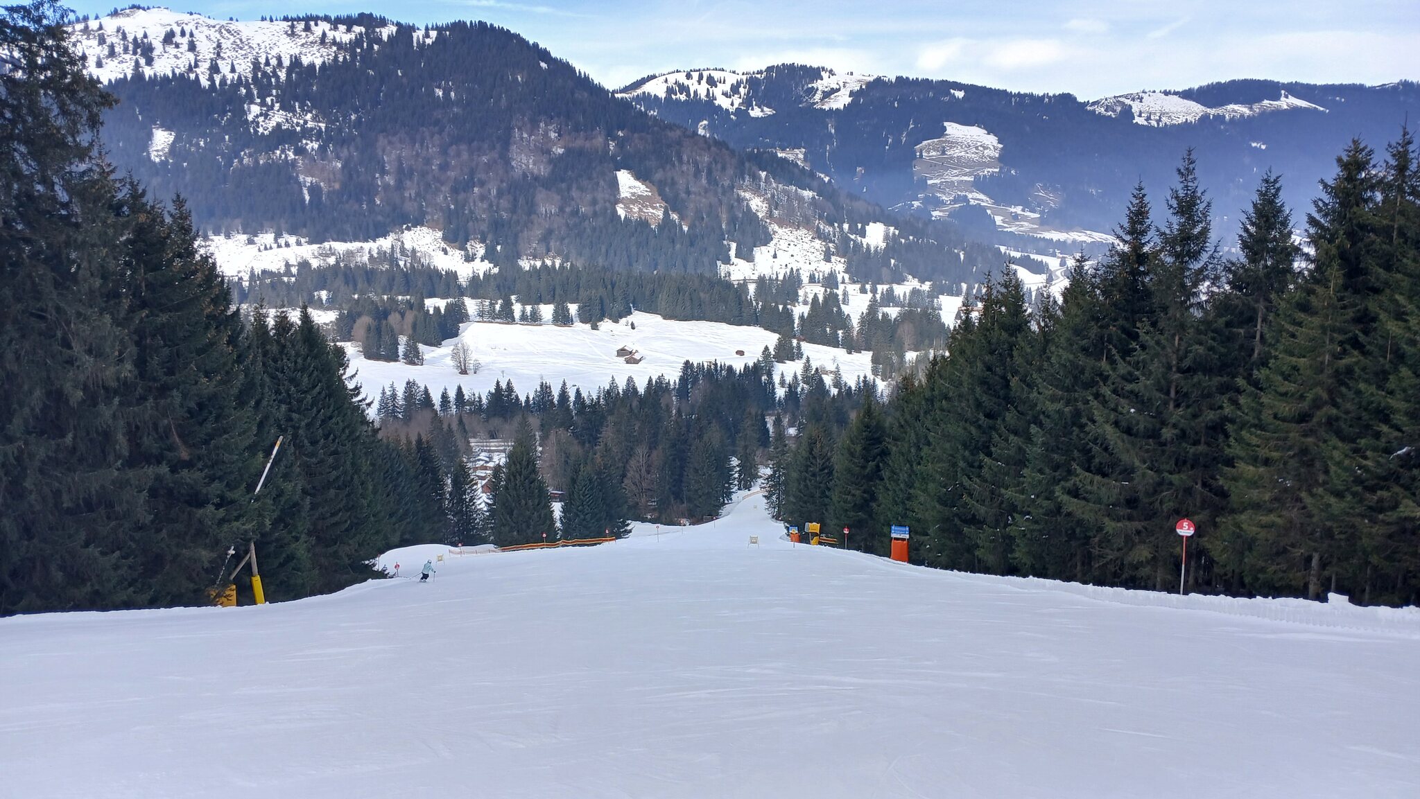 Die Abfahrt dort an der 2. Sektion führt eigentlich sehr schön durch den Wald und macht auch ein paar Höhenmeter. Völlig unverständlich, warum man hier nicht beschneit hat. Die Naturschneelage ist natürlich sehr mau, aber die Beschneiung hätte genügend Zeitfenster gehabt.