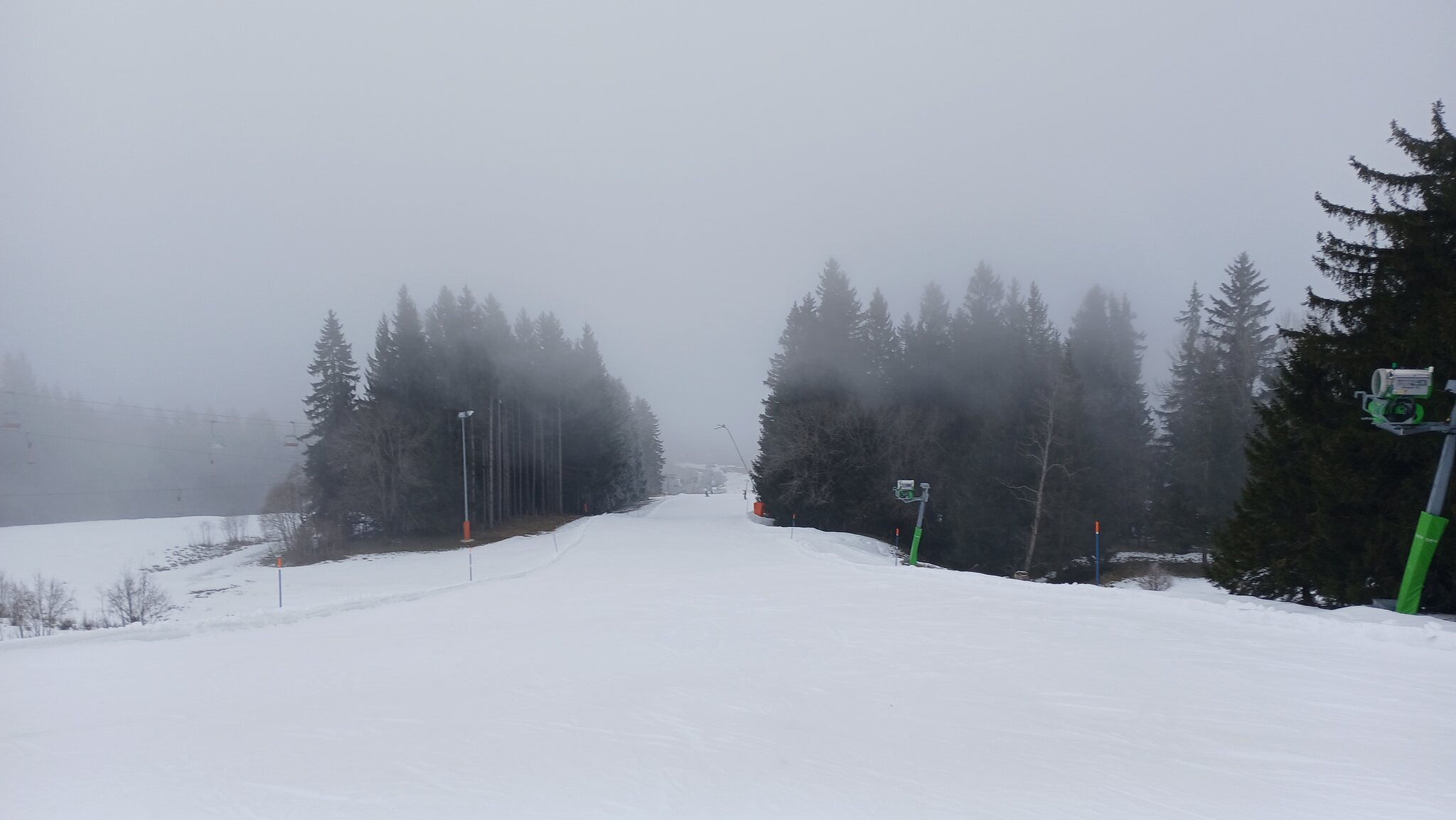 Unverständlich finde ich aber, dass an der oberen Sektion, an der eigentlich eine dichte Beschneiungslinie besteht, überhaupt nicht beschneit wurde und stattdessen an der Talstation Schneeerzeuger nutzlos rumstehen. Mit einer entsprechenden Maschinenschneeunterlage wär die Piste an der 2. Sektion noch besser und würde das Gebiet deutlich aufwerten.