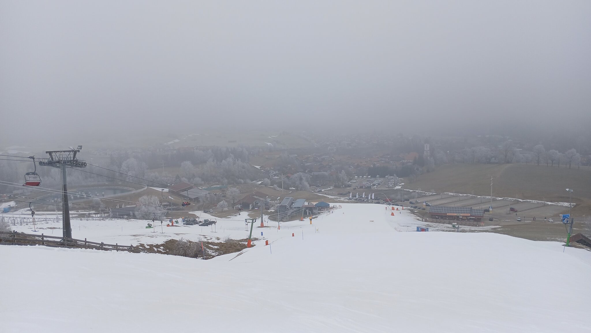 Blick auf die Talstation in Nesselwang mit den kostenpflichtigen Parkplätzen (4€). Ohne Maschinenschnee würde hier nichts gehen, aber es liegt ja genügend Maschinenschnee in guter Qualität.