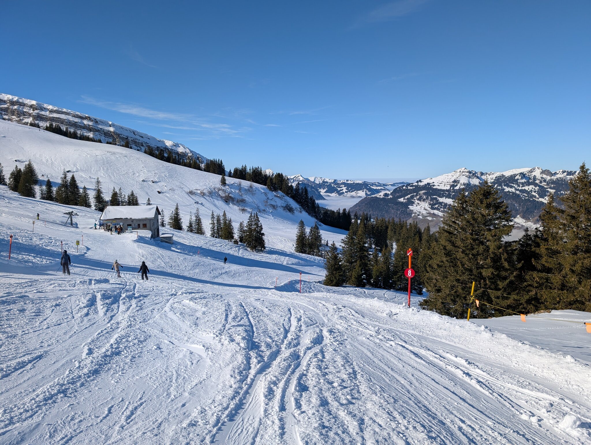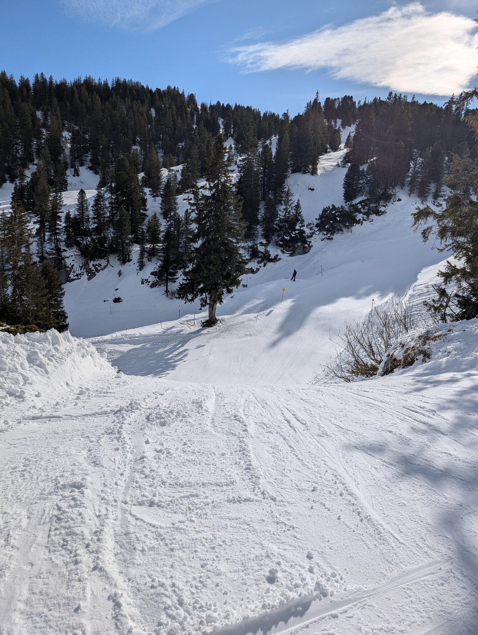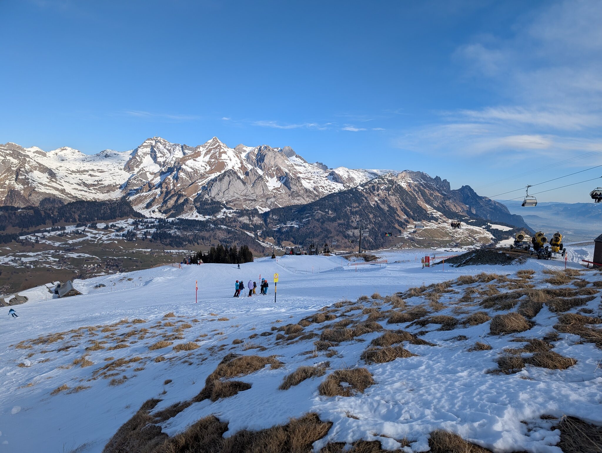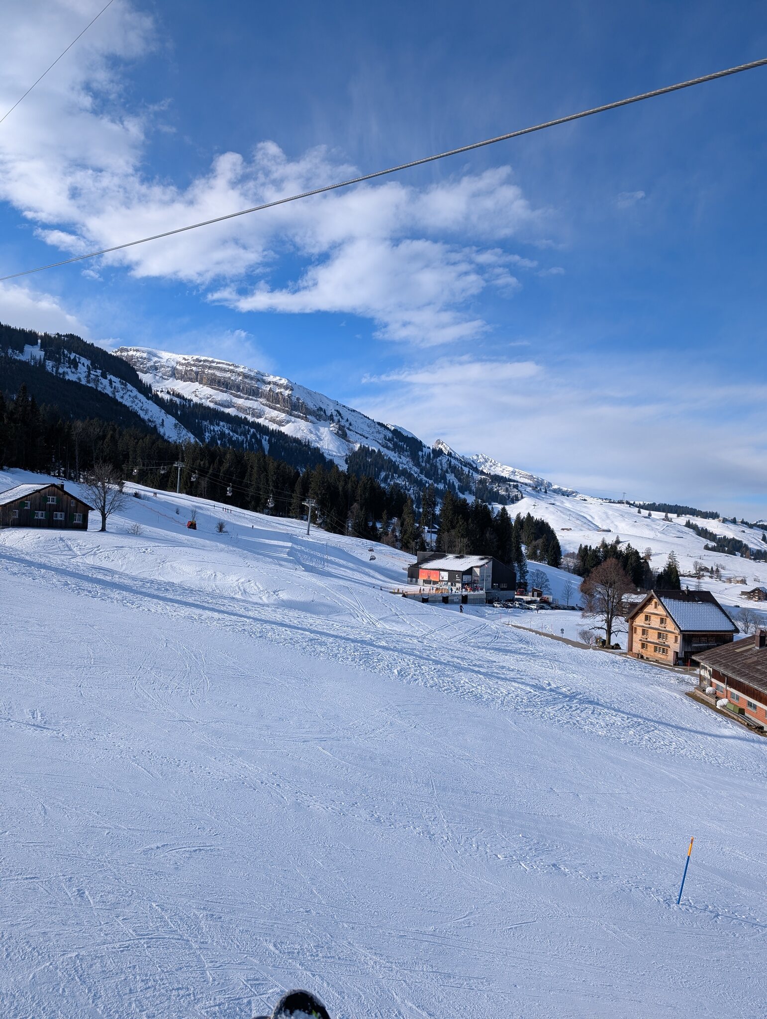 Vier Winter in folge waren wir jeweils eine Woche in Wildhaus, von 2021 bis 2024. Jedes Jahr wurde die Schneelage etwas schlechter. Wobei wir 2023 noch sehr viel Glück hatten, da es genau am Samstag bei unserer Ankunft kräftig geschneit hat. Letztes Jahr war es dann wirklich schwierig. Talabfahrten zu, der letzte Abschnitt zu den Stationen im Oberdorf nur noch auf schmalen Streifen erreichbar. Der Schnee wird mit Kisten in der Sesselbahn heruntergefahren (kein Witz).
