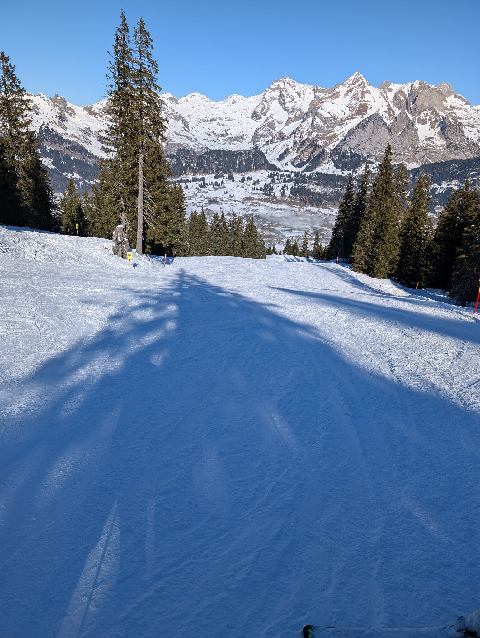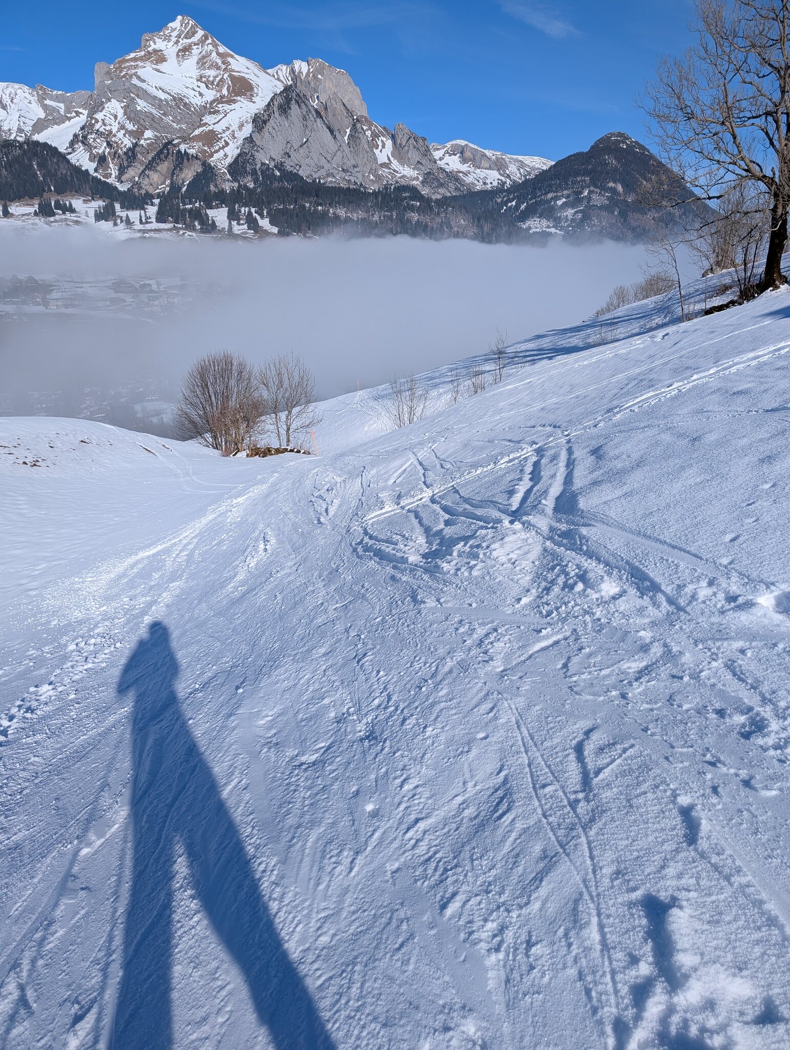 Nach meiner Rückkehr auf die Gamsalp gehen wir früh Mittagessen und gehen um 12 Uhr wieder auf die Piste. Wir steuern die 6KSB an die jetzt fast leer ist. Allerdings leidet der Schnee bereits um 12 Uhr hier unten unter dem Föhn.