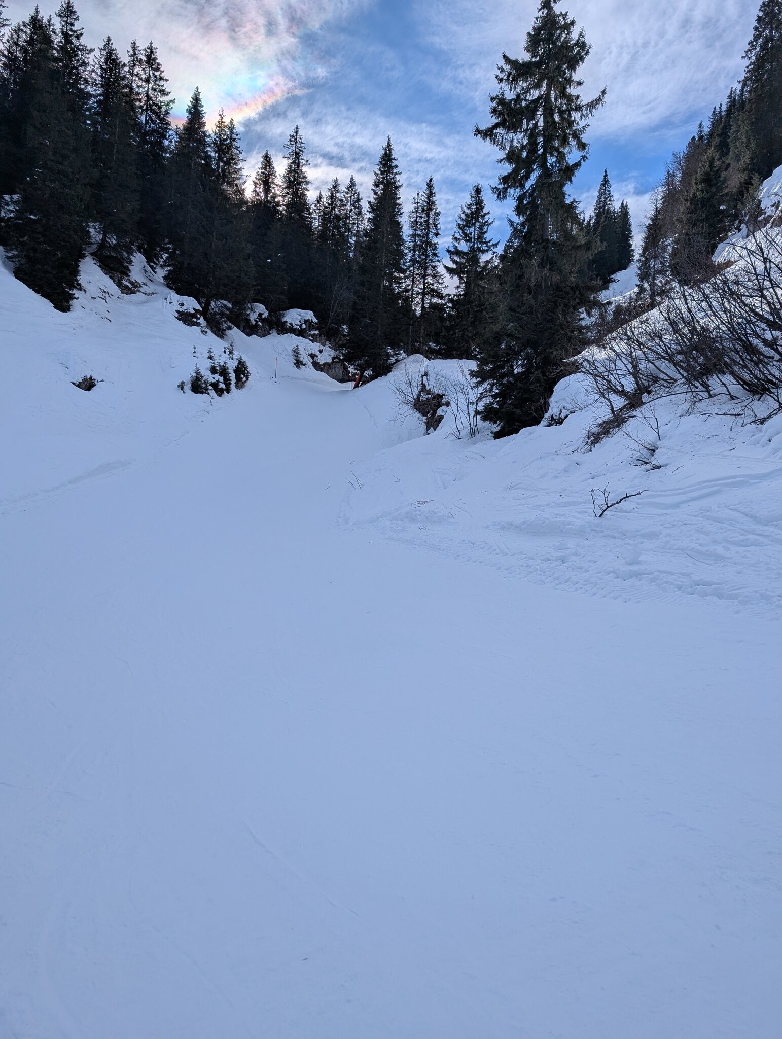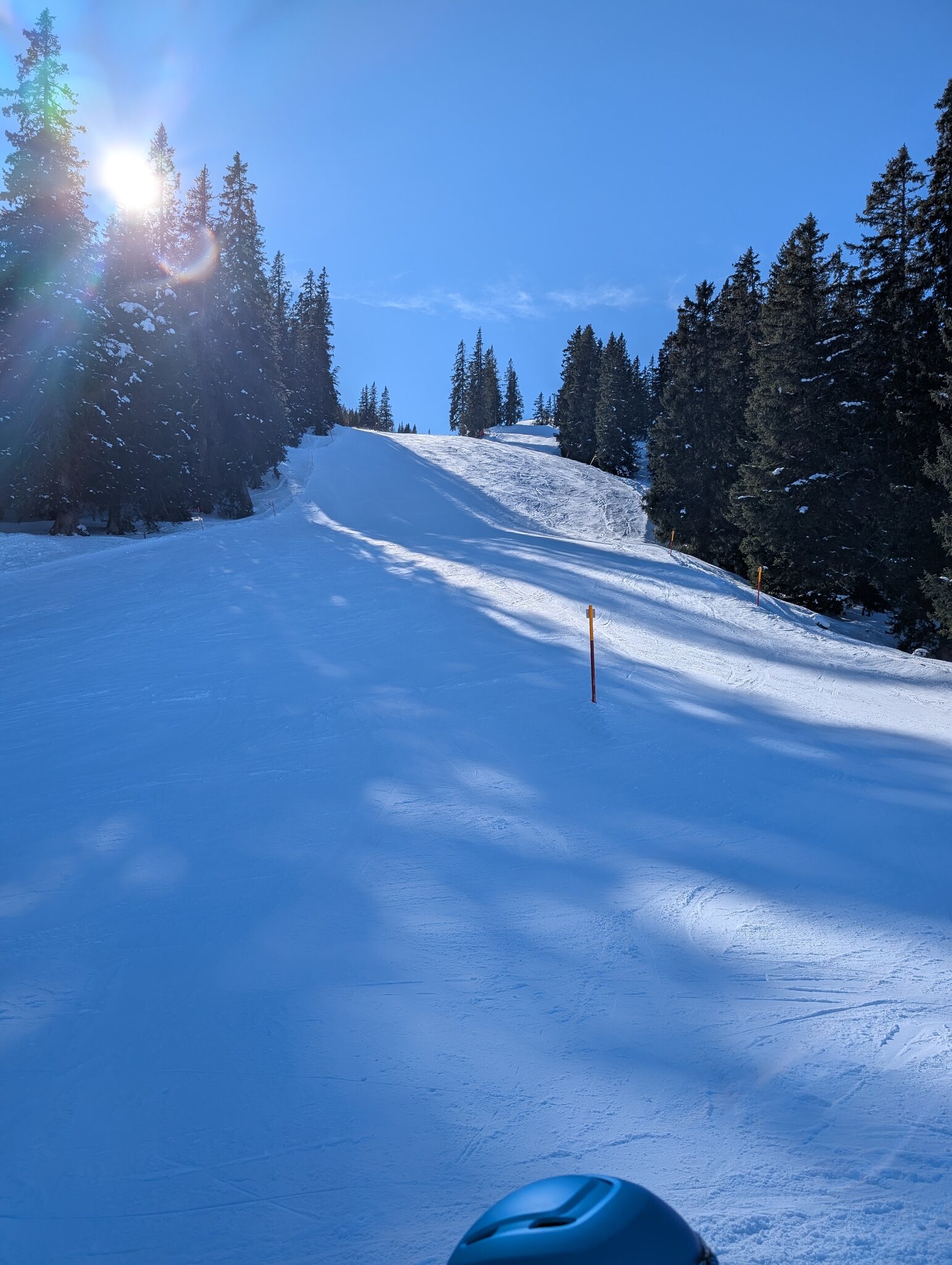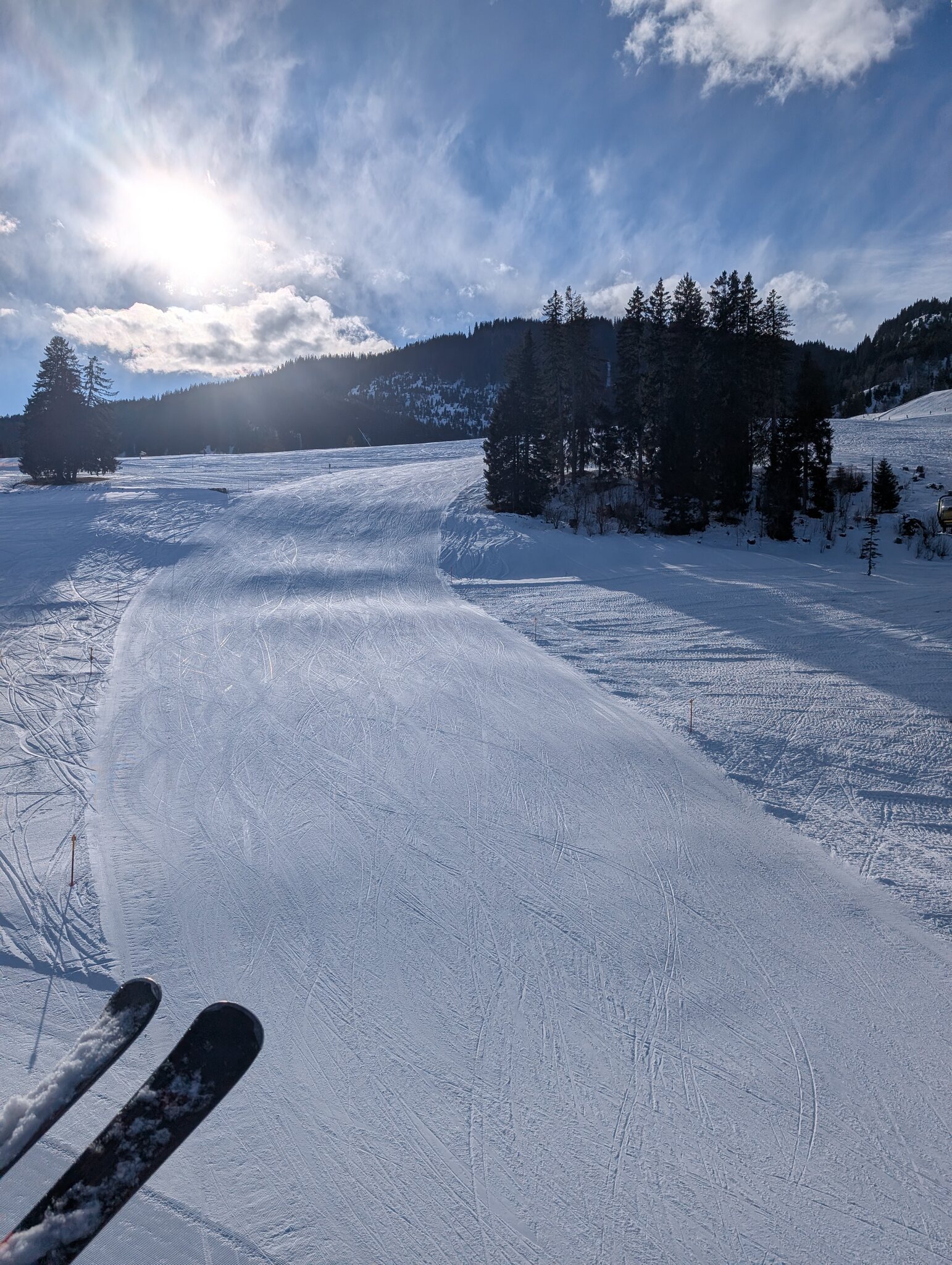 Auch hier schon viele Spuren, wurde hier überhaupt in der Nacht präpariert? Was aber auf dieser Piste egal war. Viel Platzt und griffiger Schnee. Zwar etwas kurz aber trotzdem ein toller Carving-Hang.