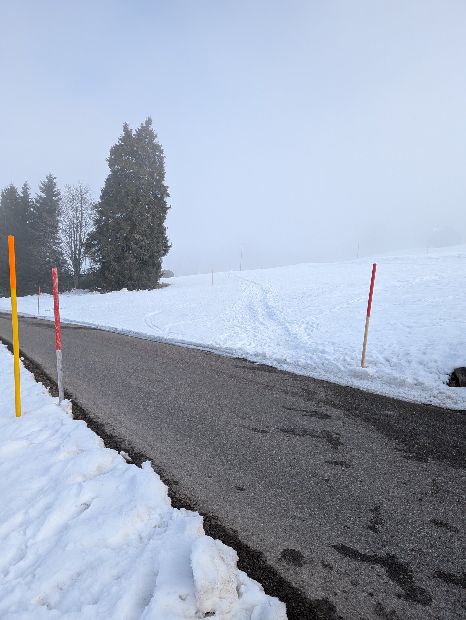 Bei der Ankunft gibt es eine Entteuschung, der Parkplatz südlich der Thur wird nicht geöffnet und wir müssen weit weg im Mutzenried parkieren. Es gibt also zuerst eine Runde Langlauf.