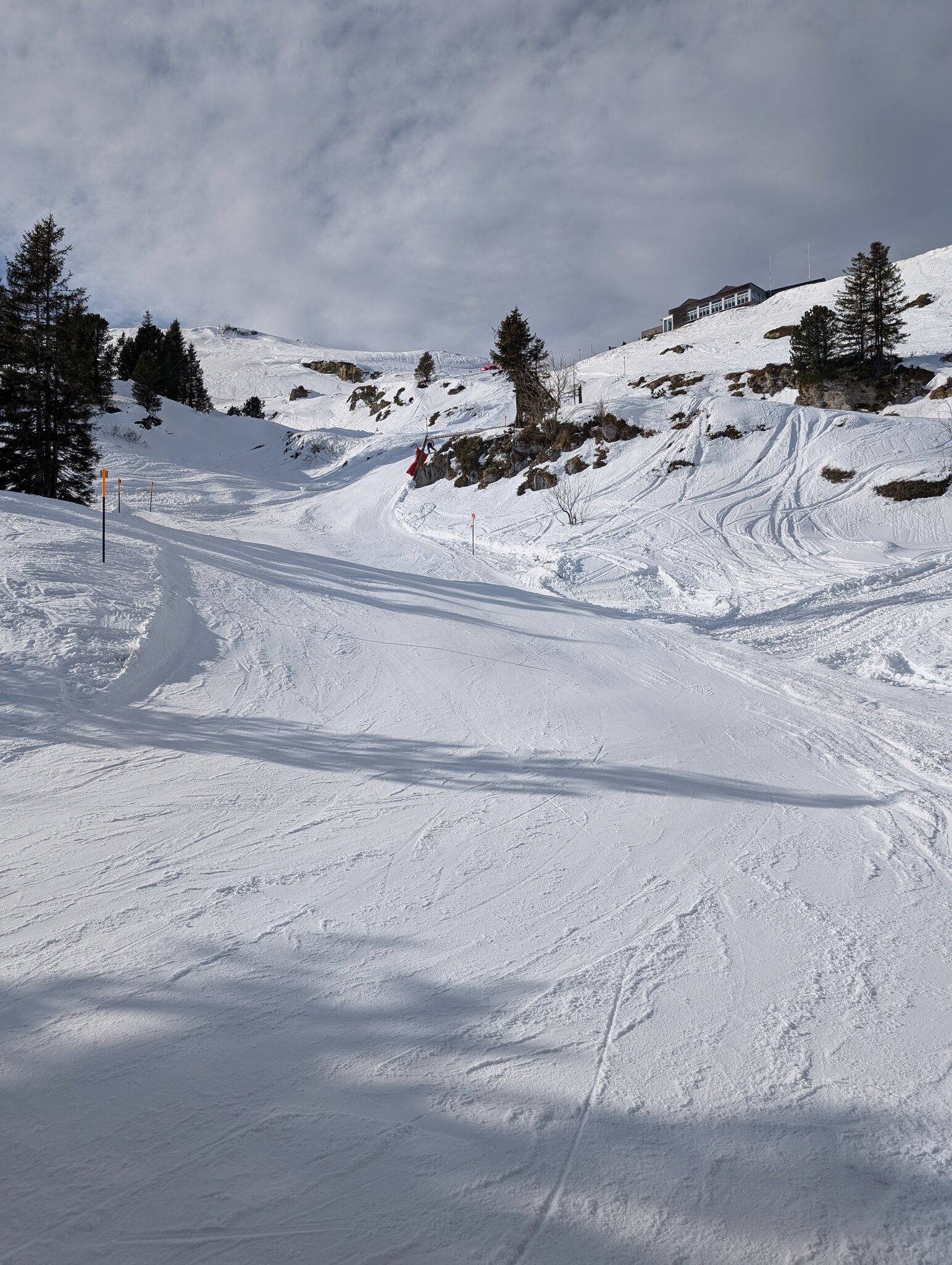 Auf Grund der Leute und Stopps am 6KSB fuhren wir diesmal direkt zur Gamsalpbahn ohne übliches "Einfahren" auf der Familienpiste. Dazu bietet sich die 6b an. Dort hat es fast nie Leute, wahrscheinlich weil man die Einfahrt von oben her nicht gut sieht. Eigentlich ist sie aber gut ausgeschildert.