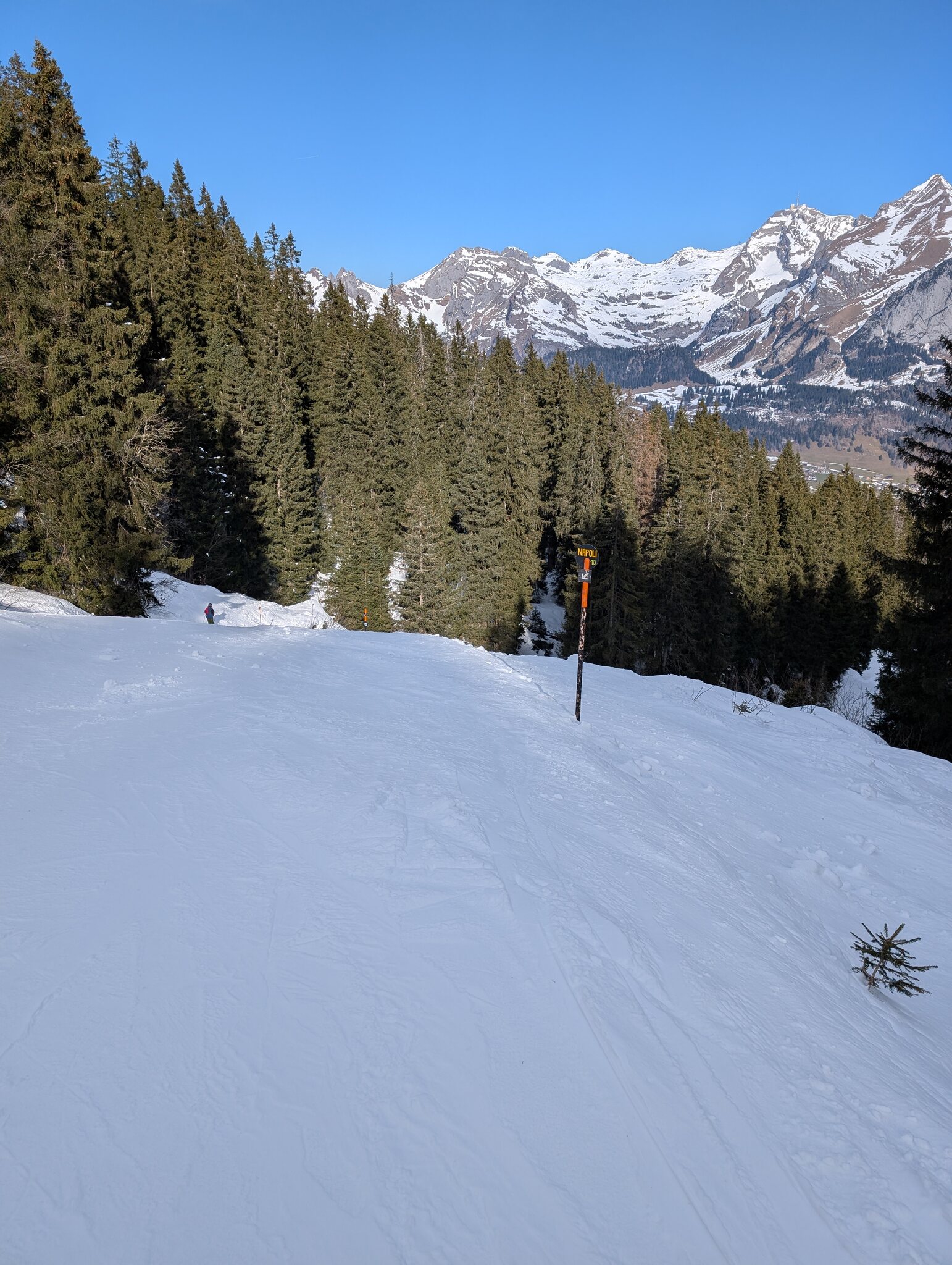 Die Blaue (Schwendi bzw. oben Häggis) kann nicht beschneit werden. Landschaftlich aber eine sehr schöne Talabfahrt.