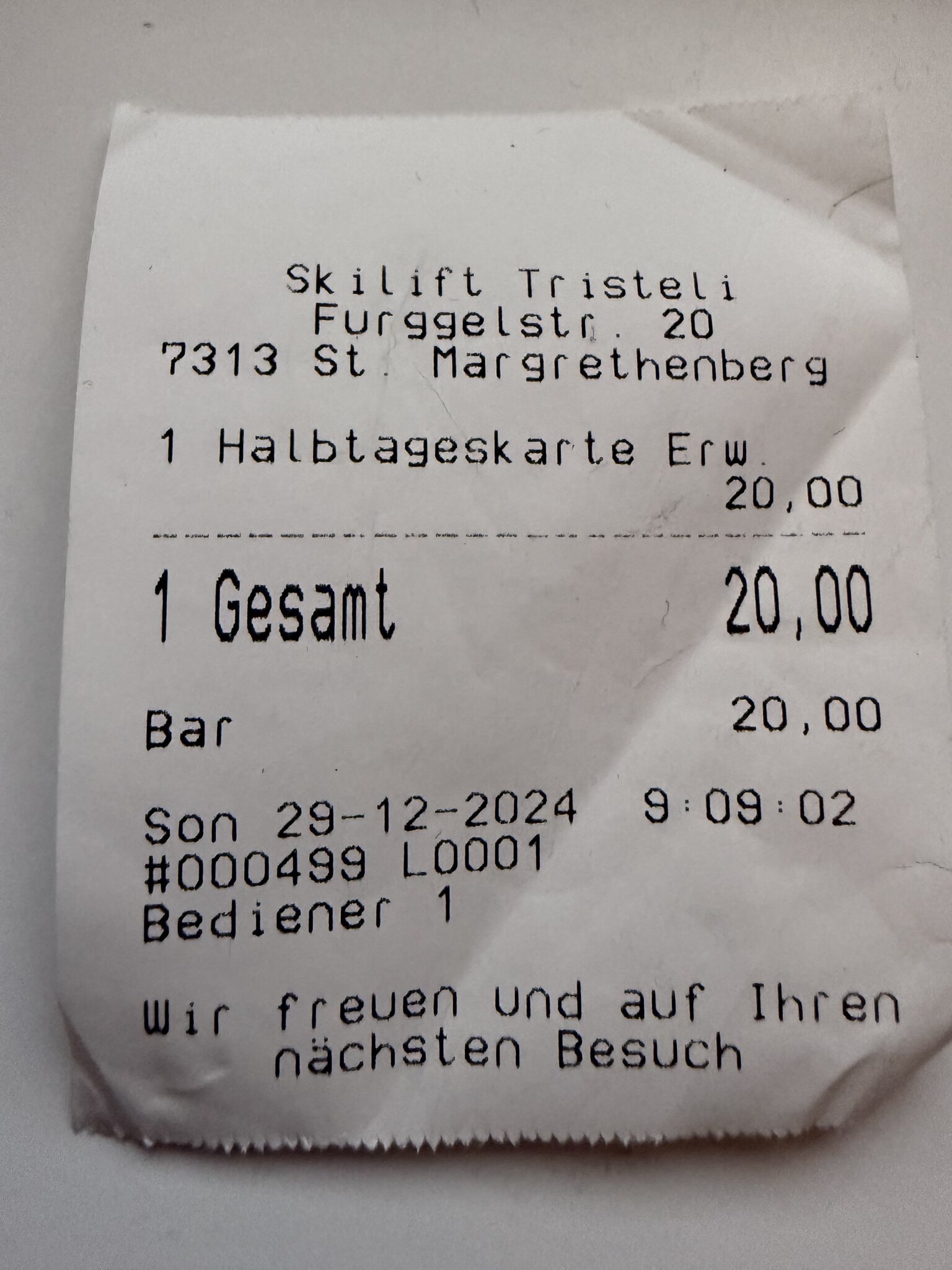 Die Halbtageskarte gab es für 20 Franken, leider erhält man nur eine Quittung und keine schöne Tageskarte zum Sammeln.