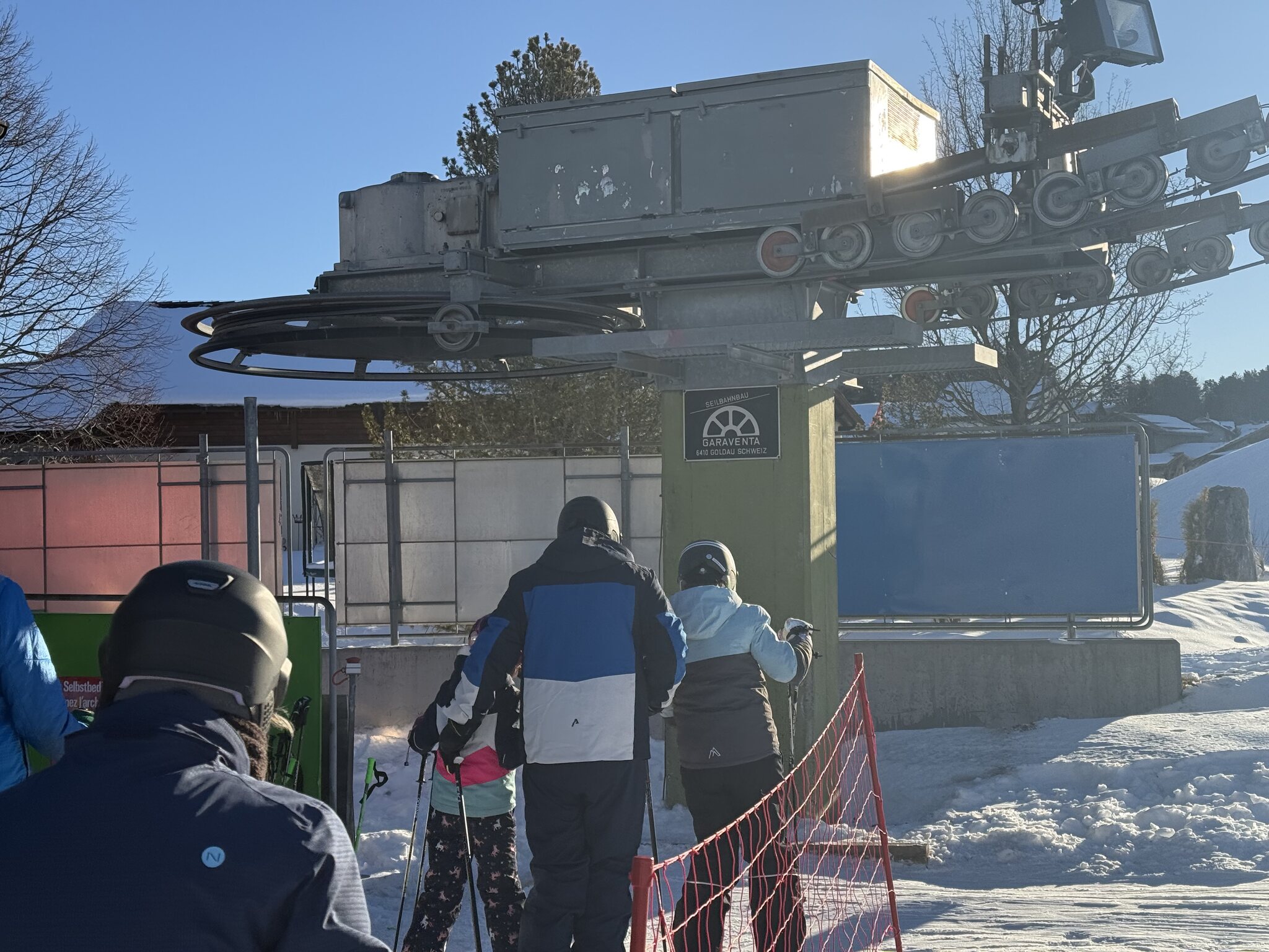 Ski angeschnallt, dann aber bei der Kasse warten müssen. Ich glaube der Kassier hat zuerst noch eine Testfahrt gemacht.
