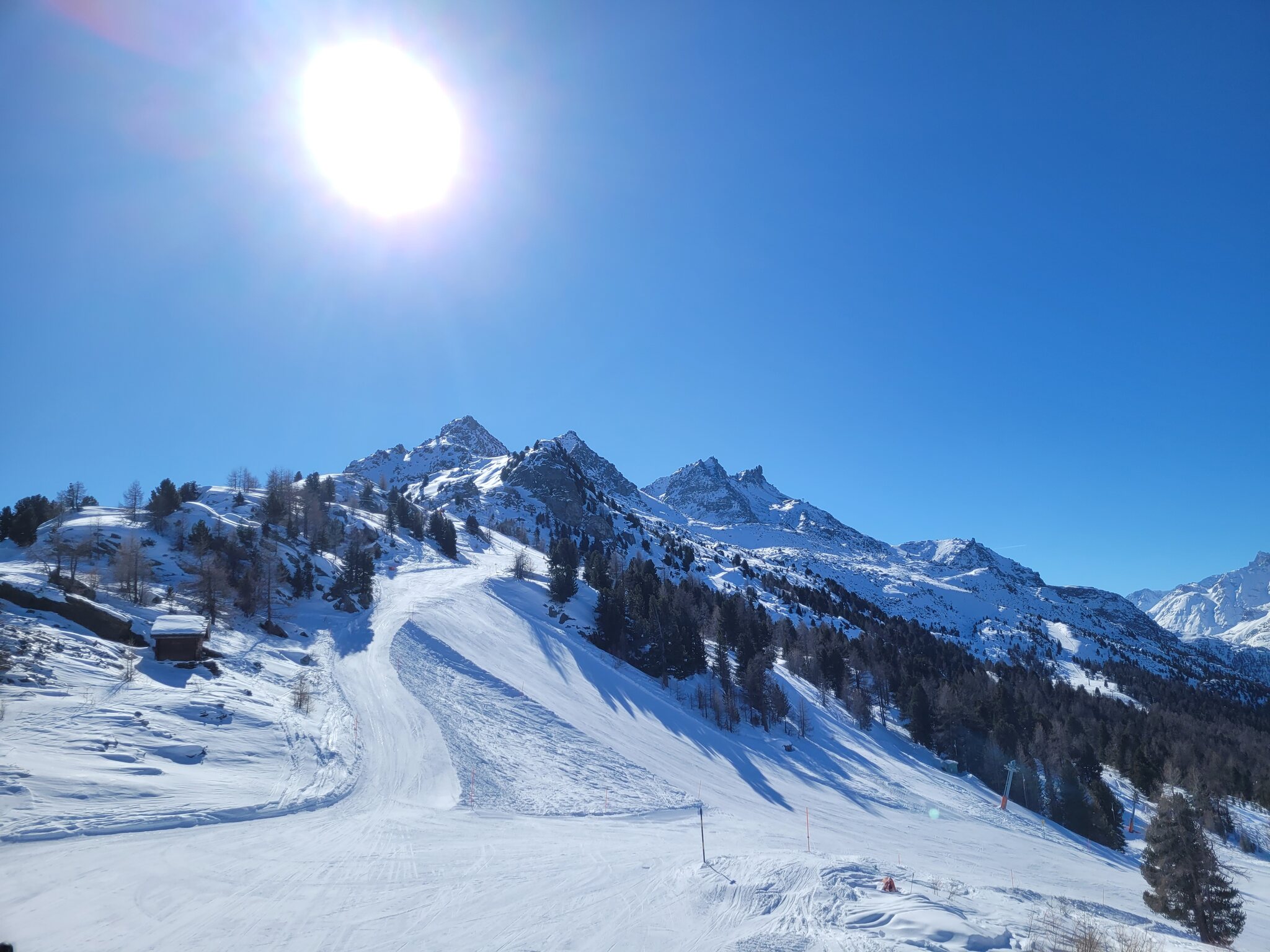 Abfahrt nach Plattja mit Blick auf die Reste des Riedgletschers. Zwar toll gelegene Pisten, jedoch durchwegs sehr schmal. Obwohl gestern nicht viel los war wäre ich ungern hier wenn es auch nur ein wenig voller wäre