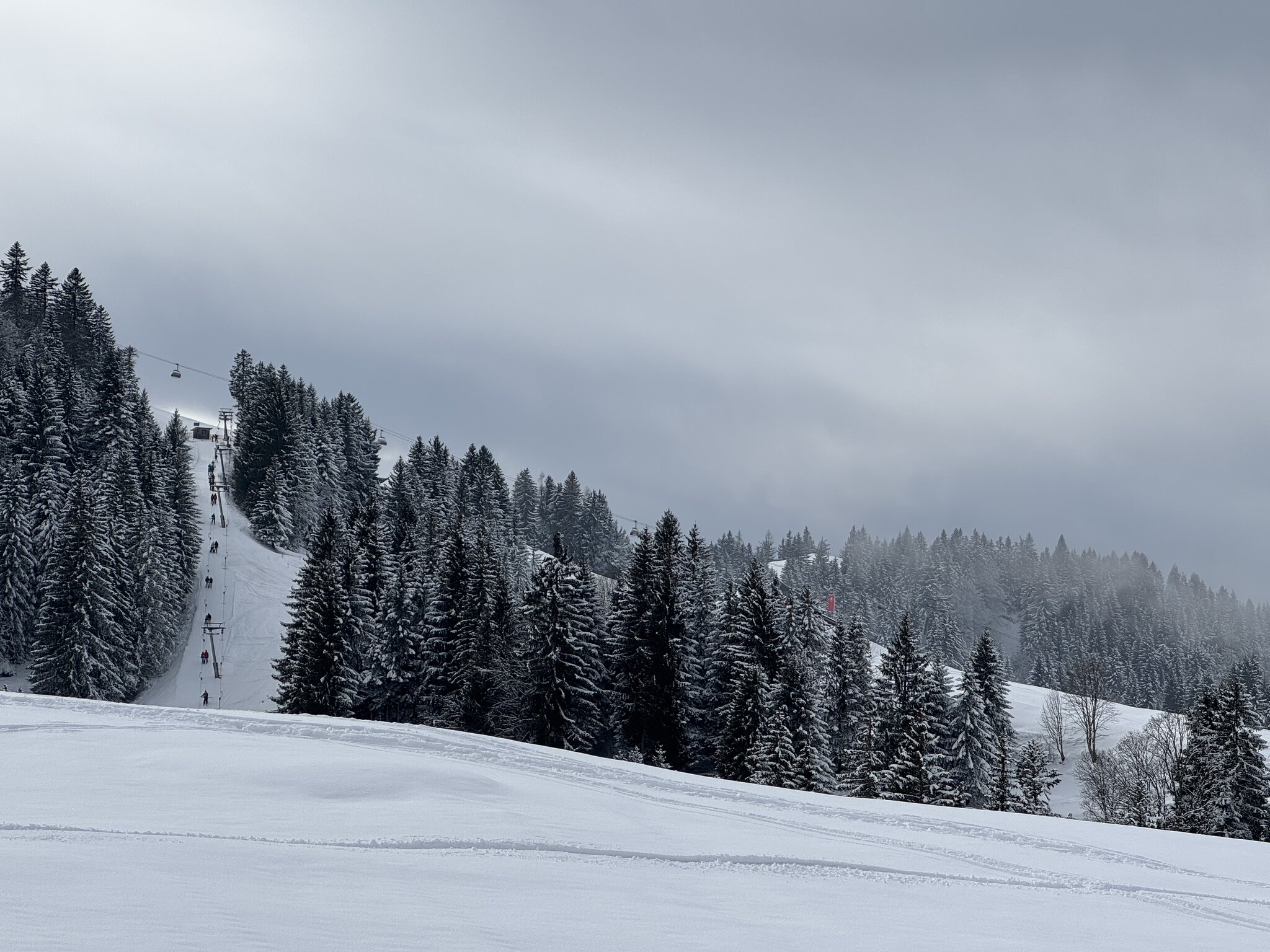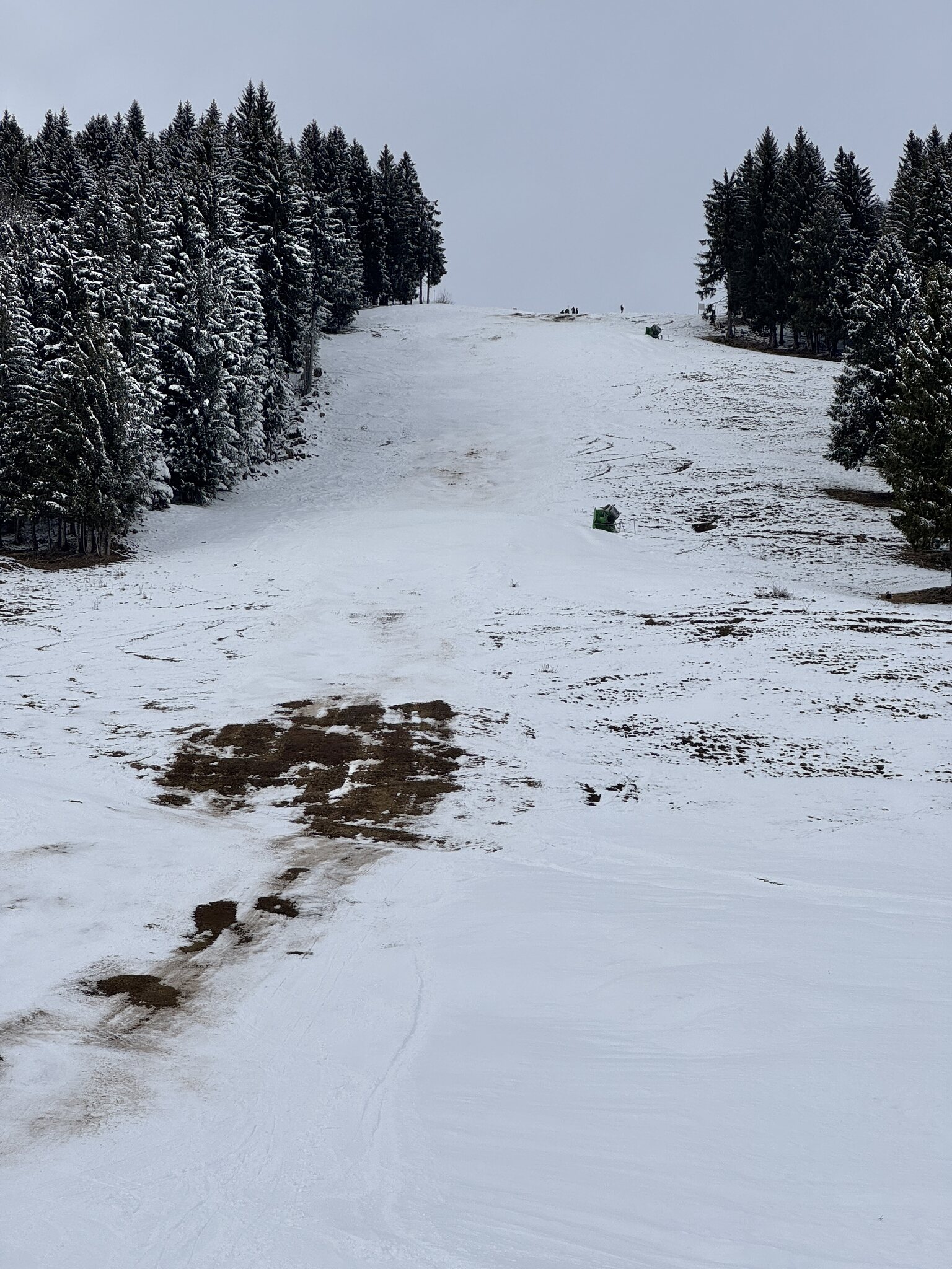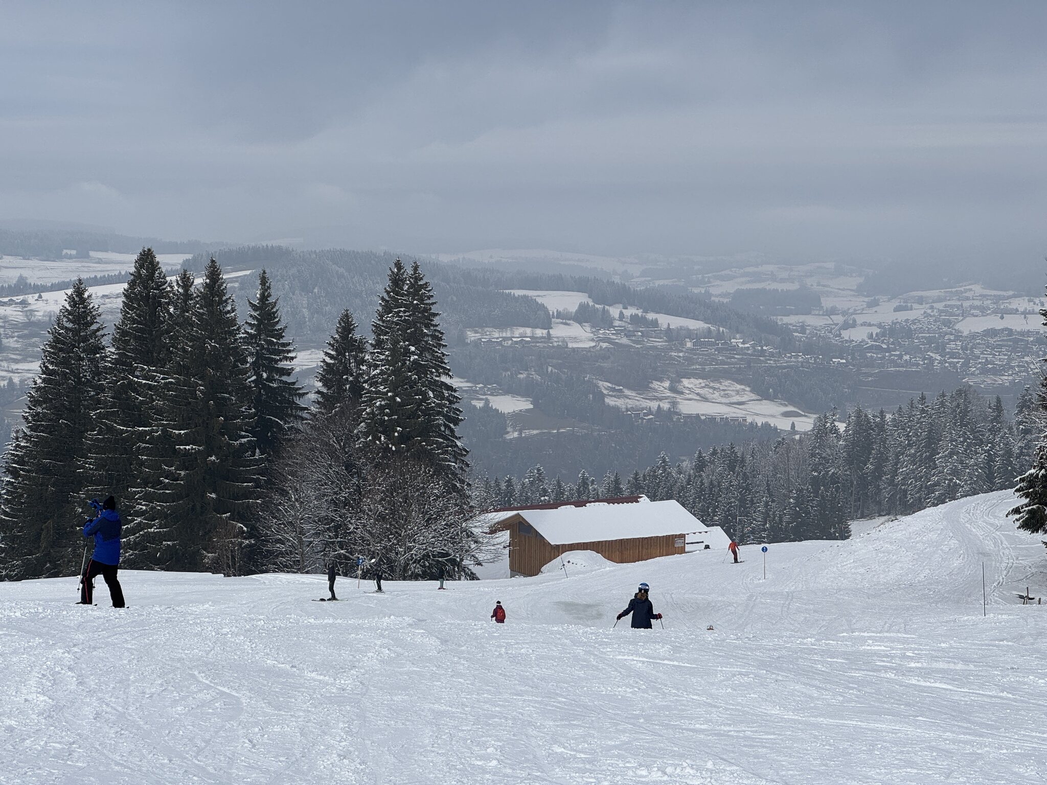 Die Schneeverhältnisse auf den beschneiten Pisten sind recht gut. Insgesamt ist es allerdings schon mager mit vielen geschlossenen Pisten. Die rote Talabfahrt ist offen, die blaue geschlossen.