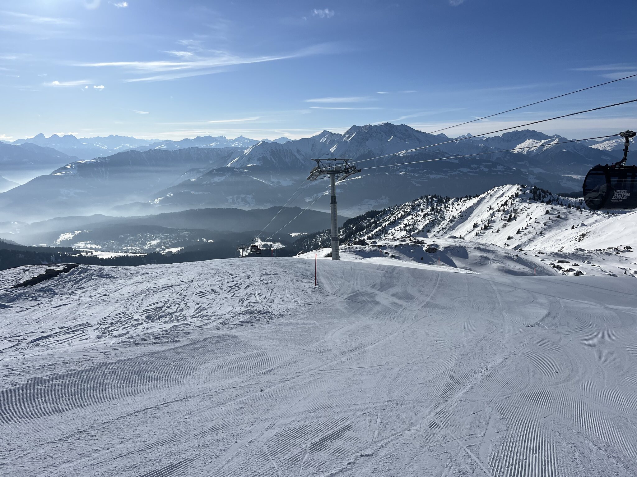 Nach einem Vormittag mit Auf und Ab in Obersaxen besteige ich um 12.45 Uhr den Flem-Express. Es hat fast keine Leute, Joe wählt nach zwei abfahrenden Foppa-Gondeln dann zwei mal Nagens, obwohl ich eher mit Segnes gestartet hätte. So geht es halt direkt weiter Richtung Siala und Sattel.