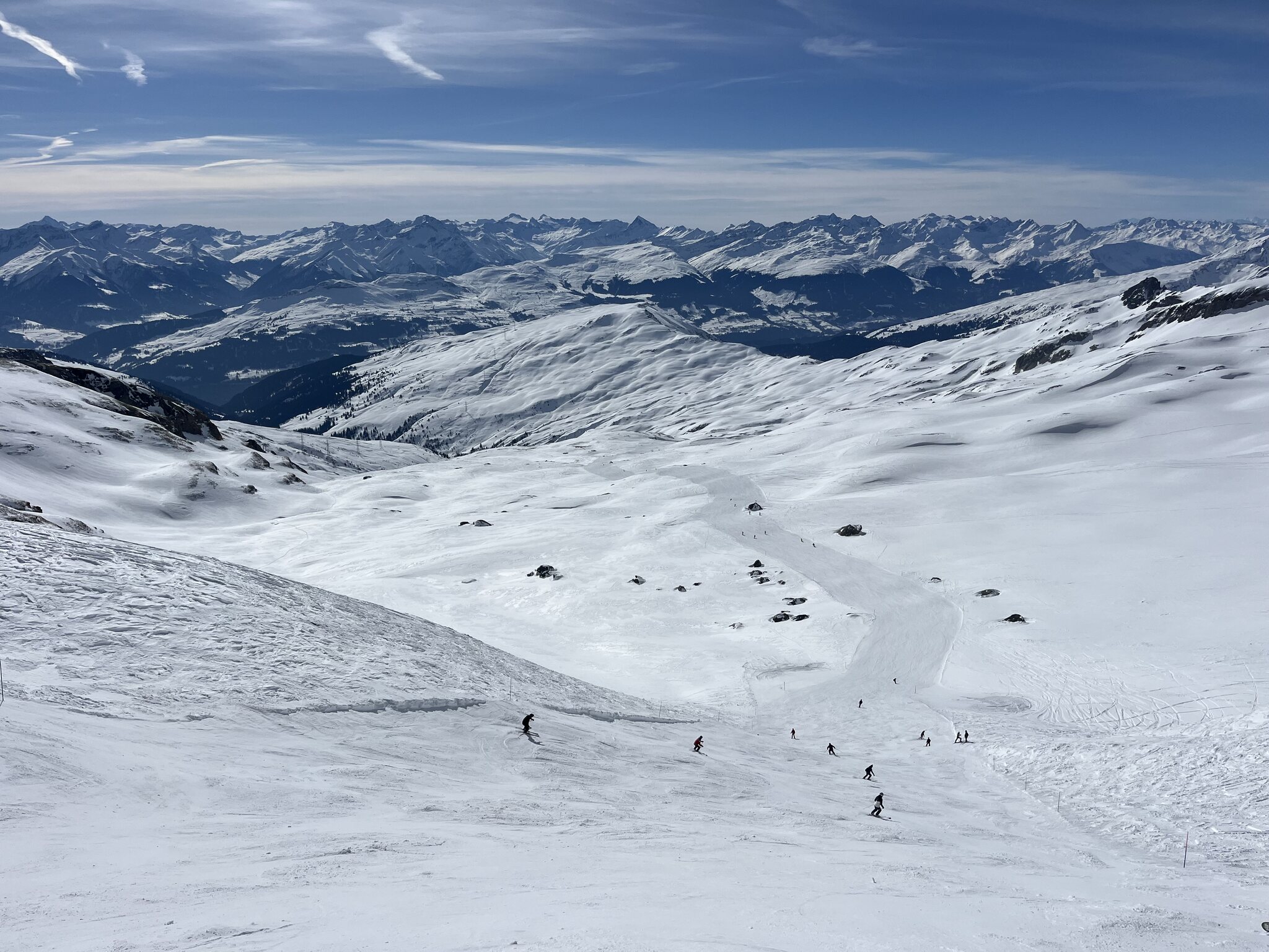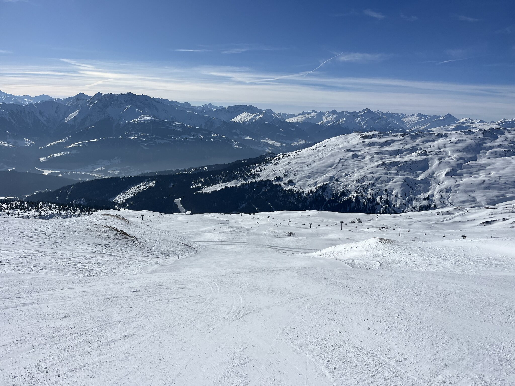 War ich in einem anderen Skigebiet? Um 9.00 h auf Nagens (klassisch mit Arenaexpress), Mutta, Siala (ohne Minenfeld, minimal Steinchen), die 27 runter (Rillenspasse) nach Fuorcla. Oben am Vorab. Wind und Nebelschwaden. Der Satteleinstieg recht braun, aber keine Steine geküsst. Die Piste dafür gut (kein Acker) (die Siala West war schon genial) aber z.T. nicht frisch präpariert. Das Engstück enorm verbreitert, bravo. Kaum Leute. Dann noch die 41 und runter von Masegn nach Plaun ins Tipi (musste nach 20 Jahren mal sein). Am Ende Mutta, Siala und Siala Ost. Auch hier ein paar Steinchen, die man problemlos umfahren kann. Es ist sehr mild, dafür haben die Pisten erstaunlich gut gehalten. Die SIcht meist gut, am Ende am Grauberg solala. Vom Andrang voll gut, kein klassischer Samstag. Klar, es baucht Schnee, aber da ist Laax wohl kein Einzelfall. Hammer war Siala-Fuorcla. War schön, wieder mal ne klassische grosse Runde.