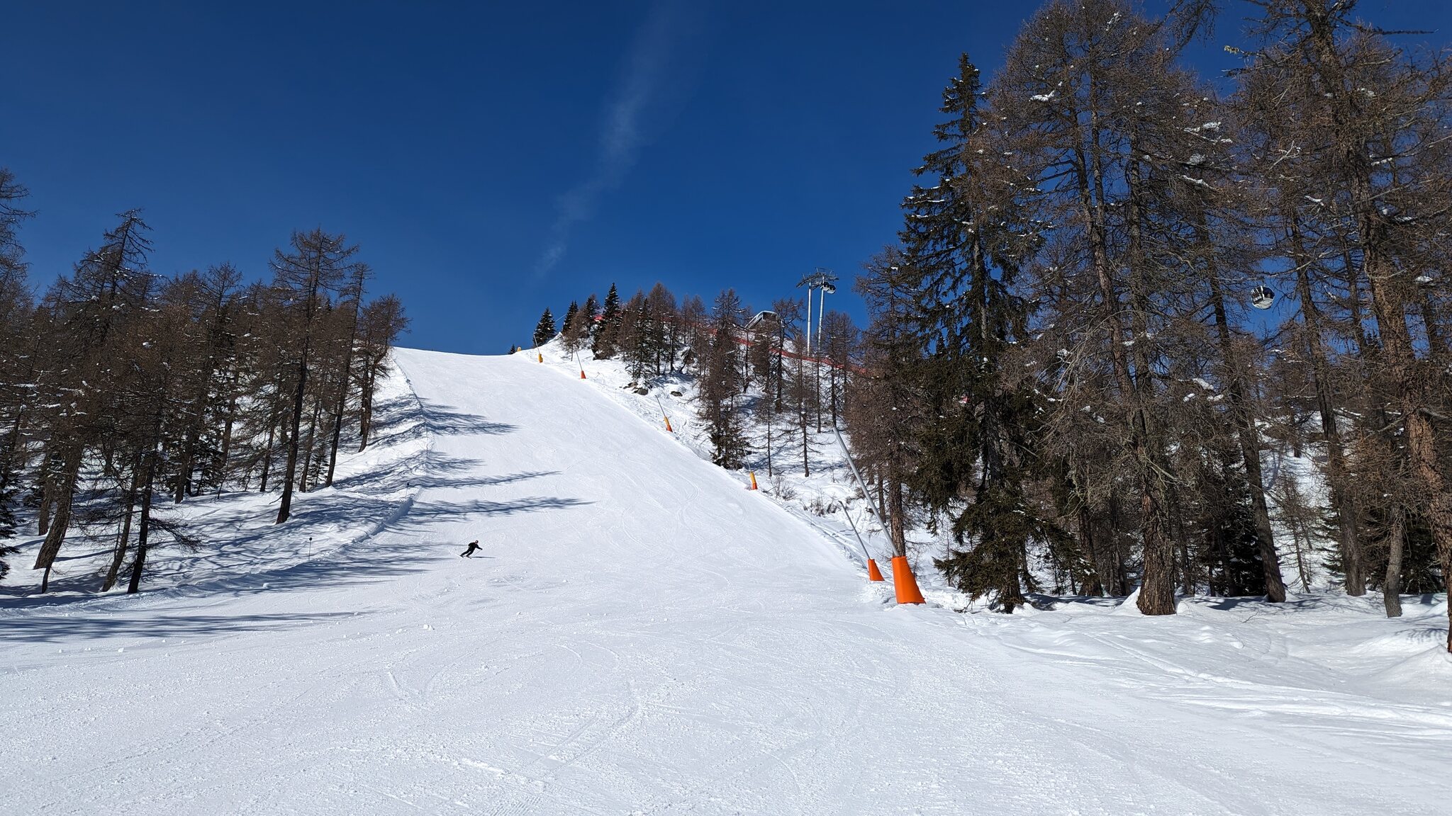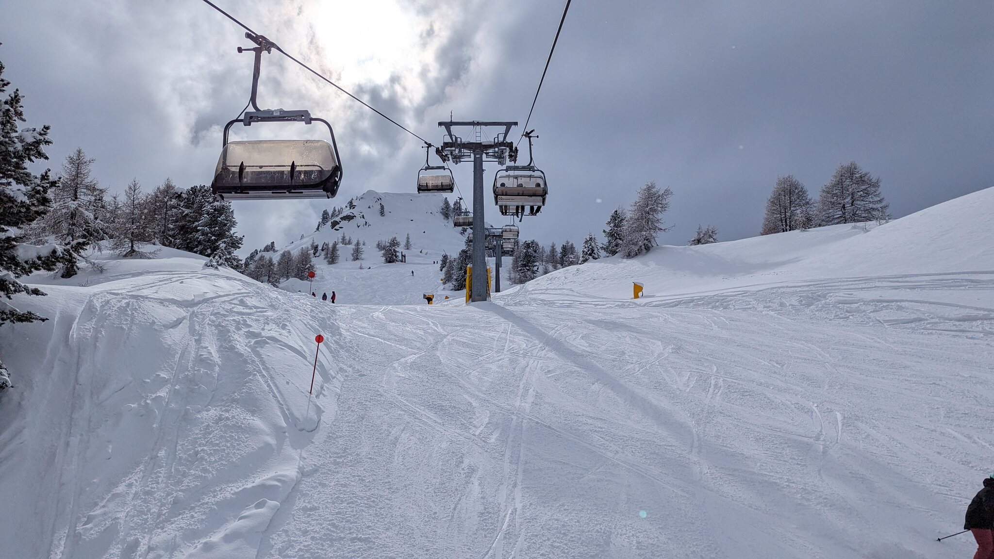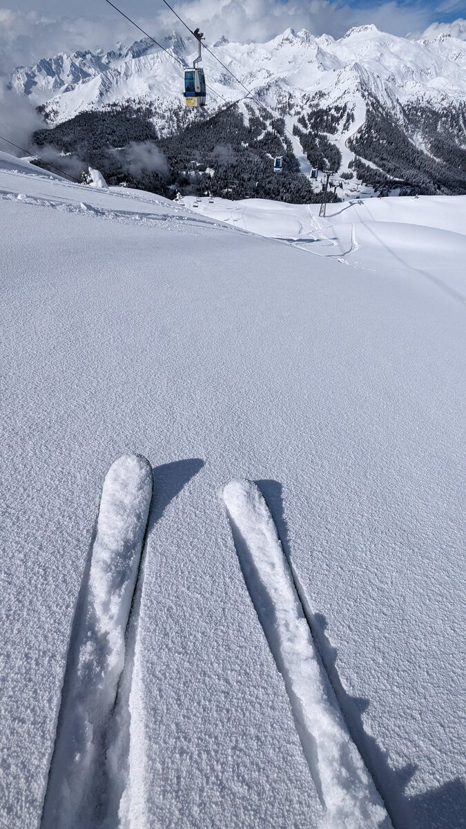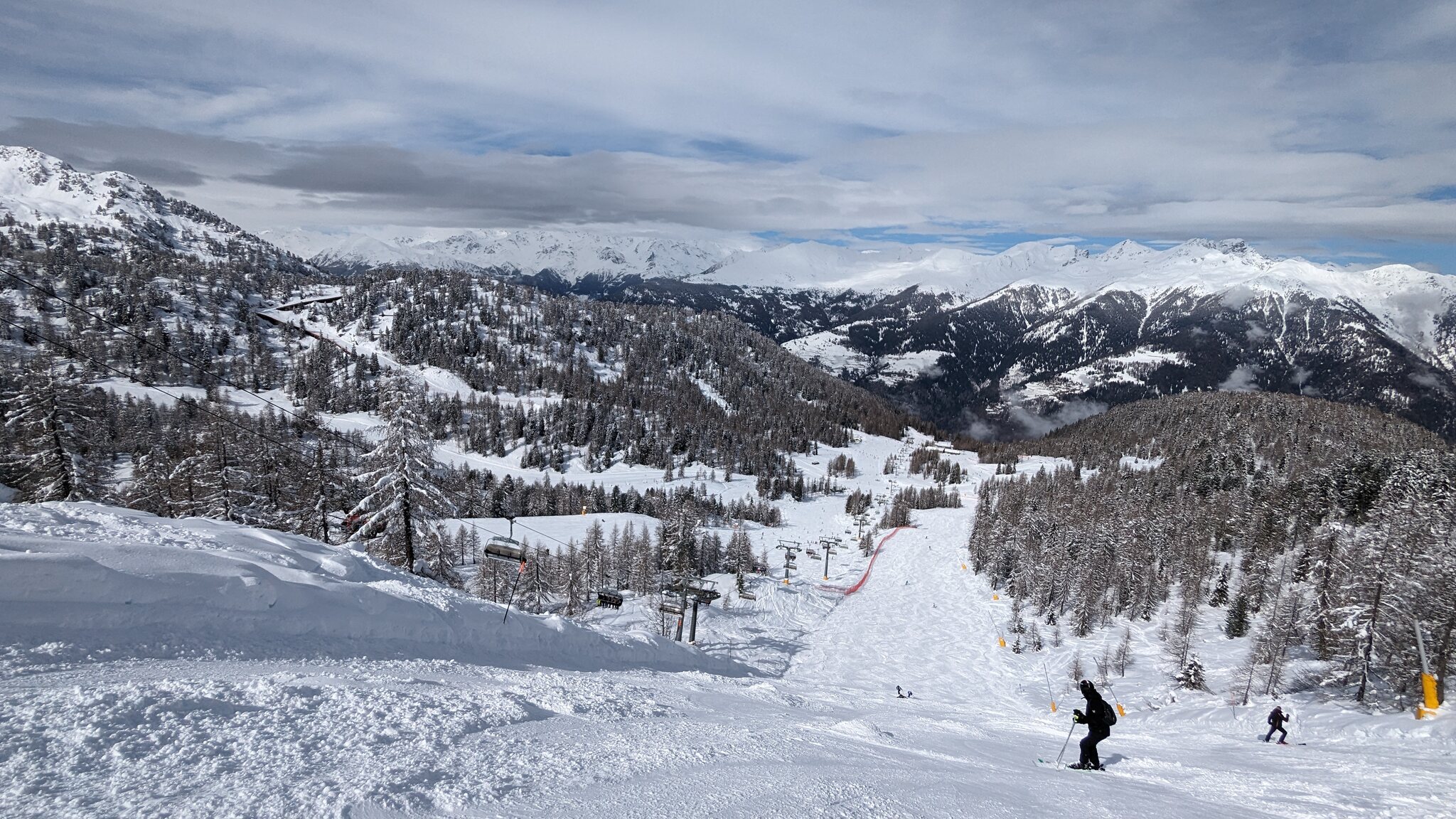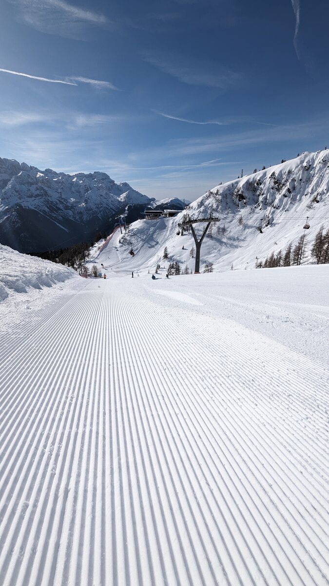 Es ist schön viel Schnee hier, vielleicht sogar mehr als auf der Alpen Nordseite. Und ich finde die Pisten schön breit und auch die Präparierung ist gut. Wartenzeiten bisher kaum, aber auch sehr moderne Seilbahnen.