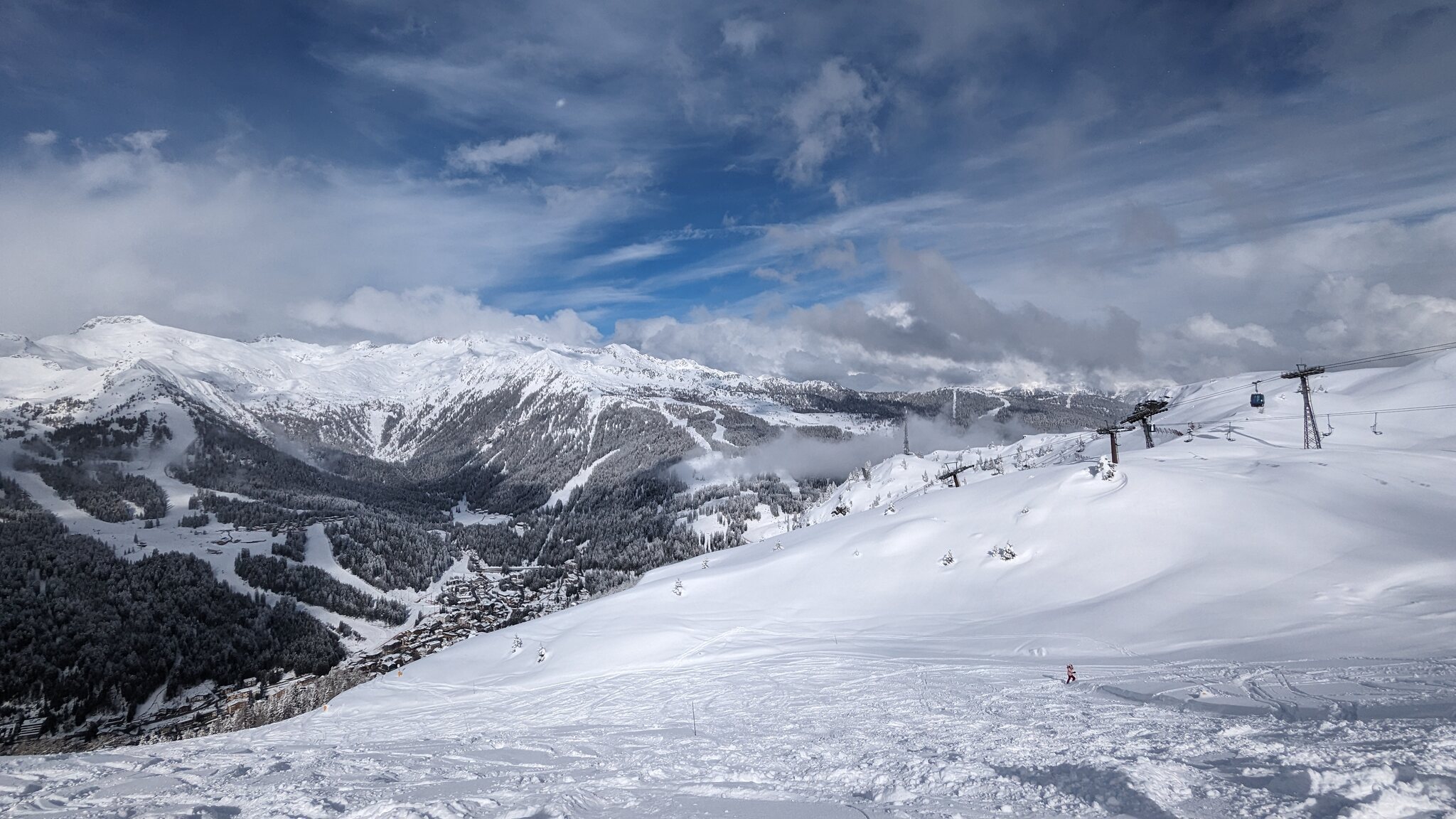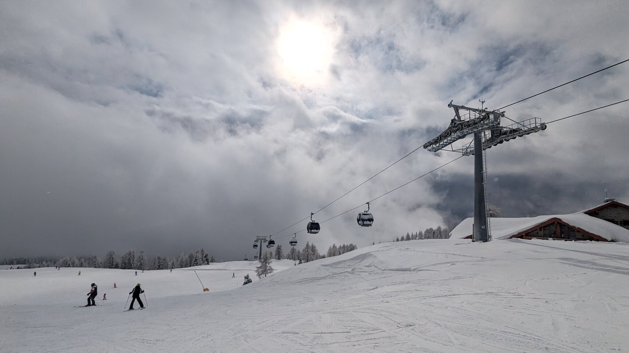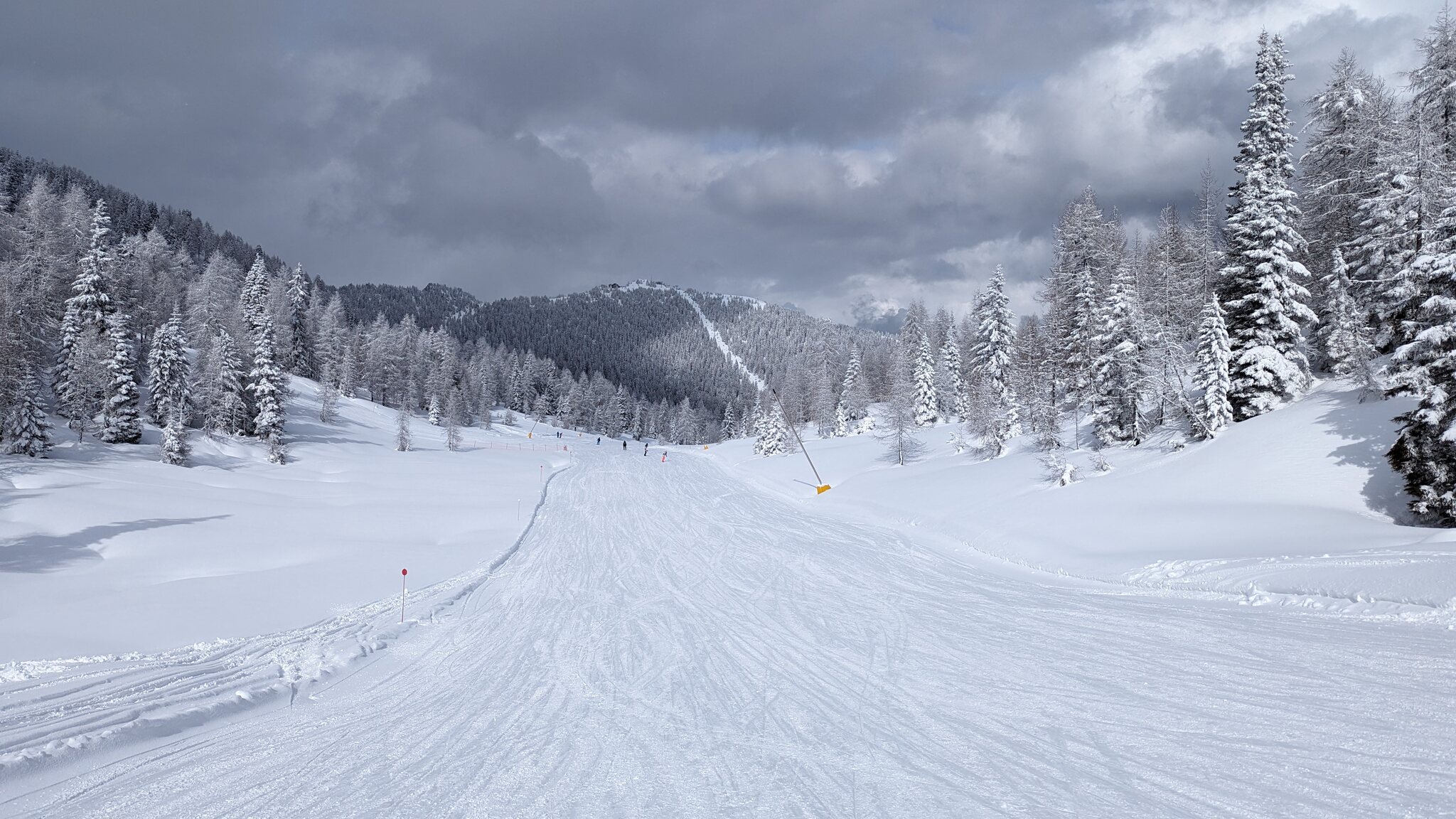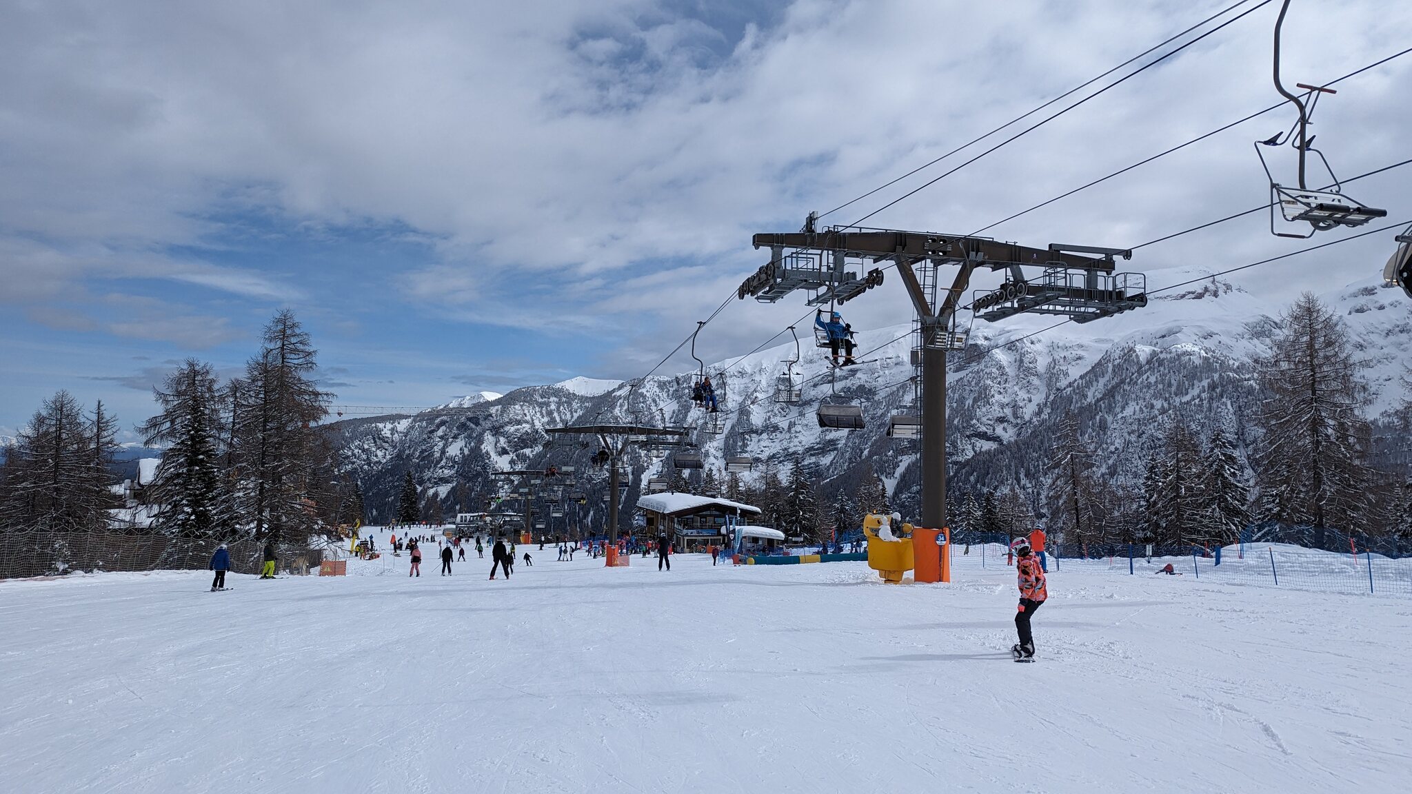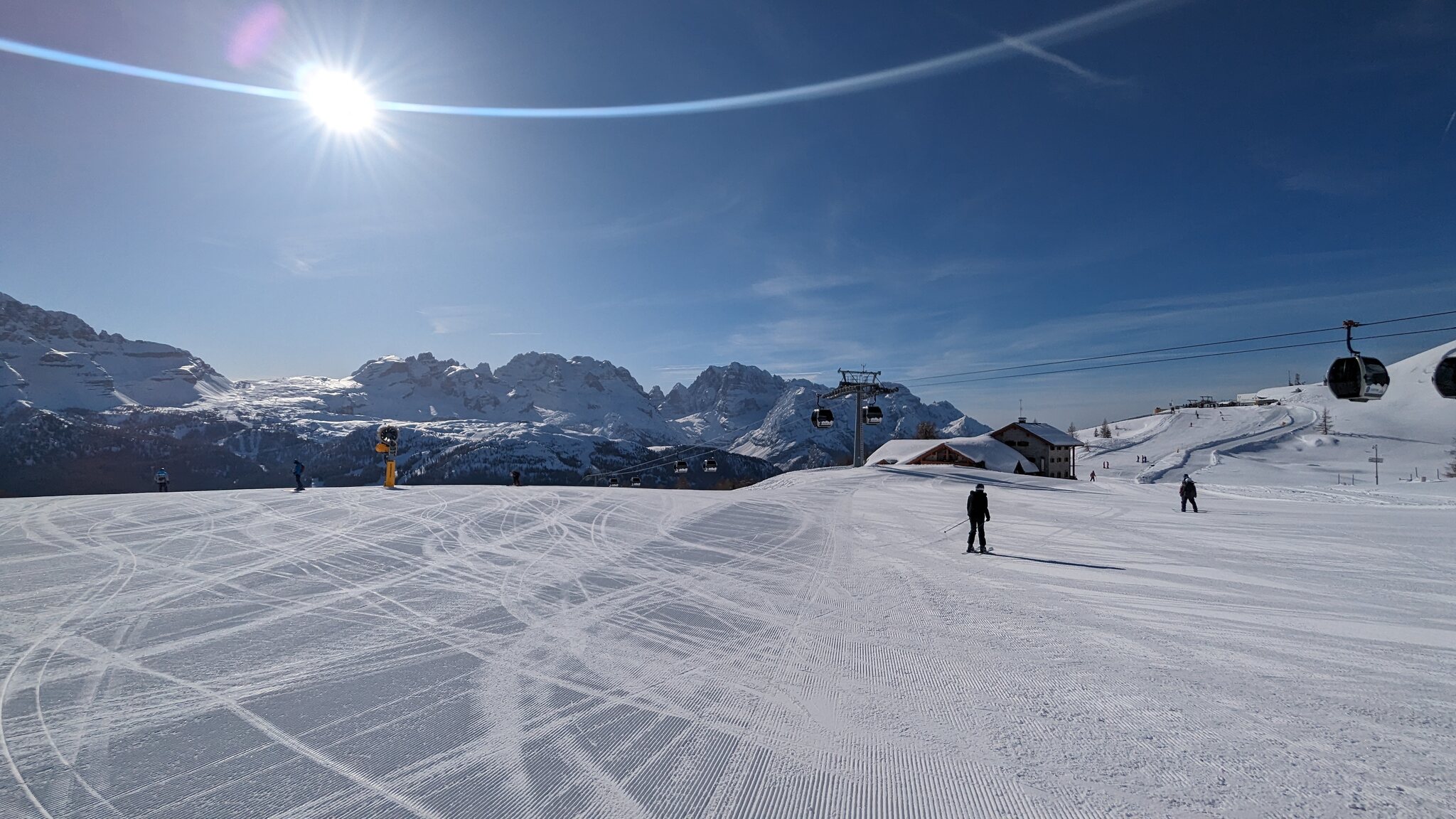 Es ist schön viel Schnee hier, vielleicht sogar mehr als auf der Alpen Nordseite. Und ich finde die Pisten schön breit und auch die Präparierung ist gut. Wartenzeiten bisher kaum, aber auch sehr moderne Seilbahnen.