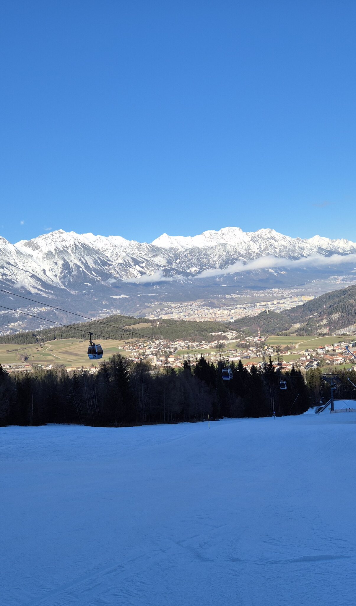 Die Abfahrt nach Mutters war noch okay. Und die steilere Abfahrt nach Götzens auch, weil dort niemand fuhr. Es gab keine Wartezeiten im ganzen Gebiet. Talabfarten ohne Steinchen.