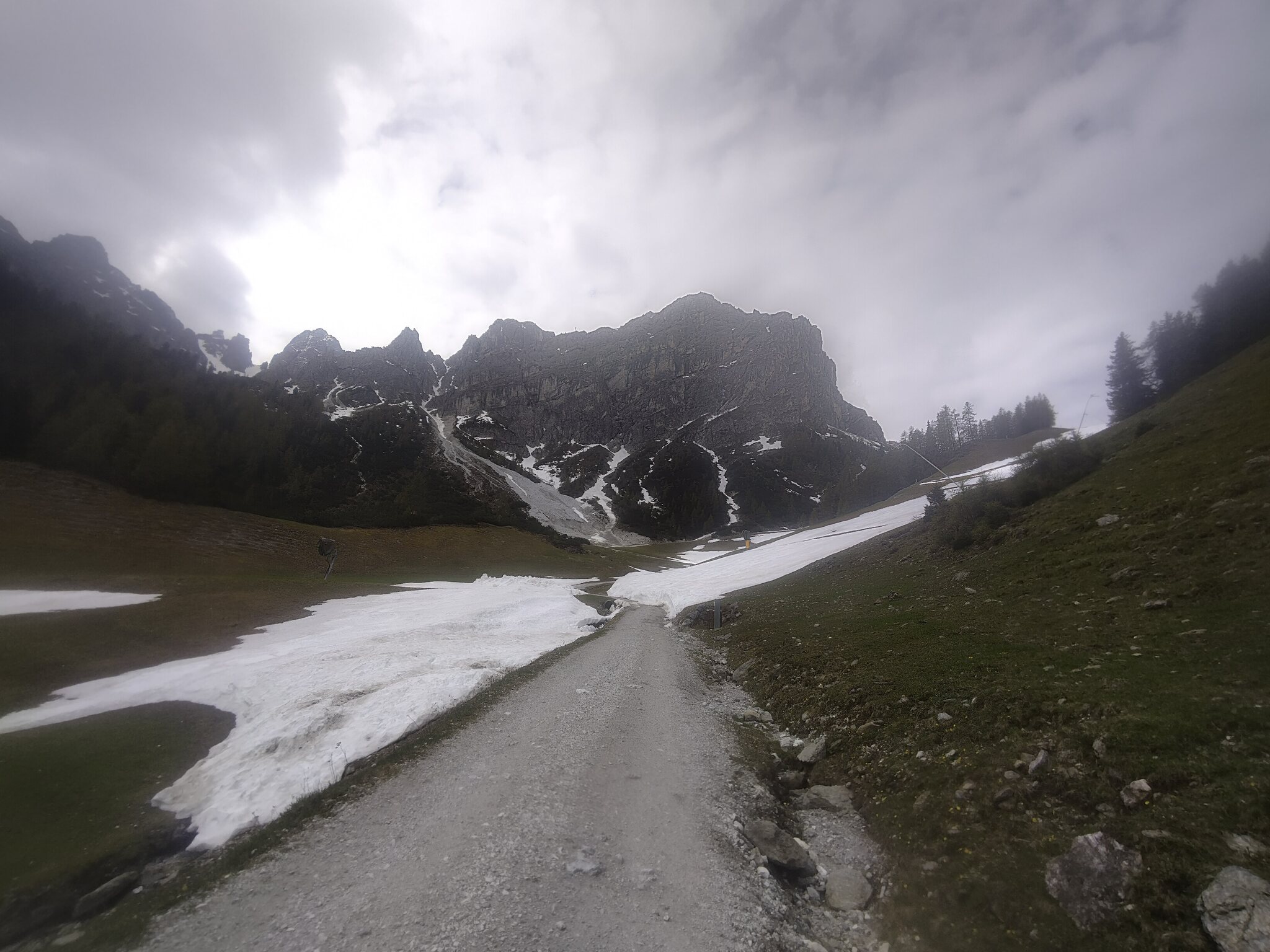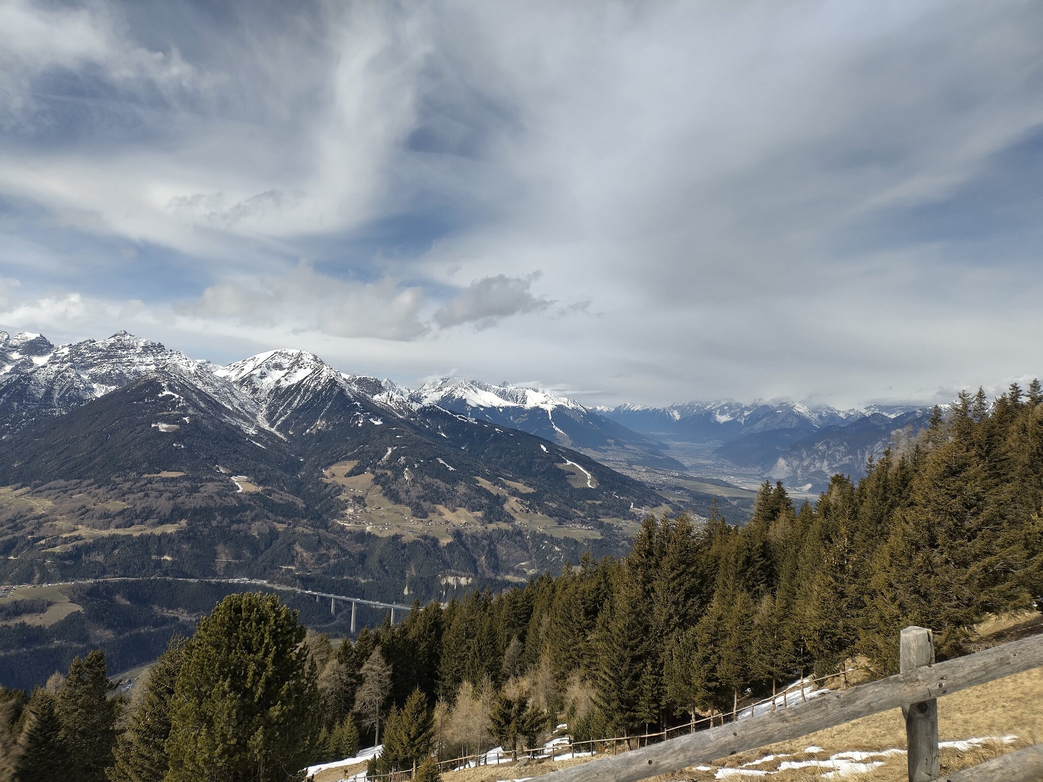 Blick vom Kofel auf das spärliche Schneeband auf der Muttererseite. Auf dem Bild nicht gut zu sehen, aber bei der Straßenquerung wirkt es schon unterbrochen: