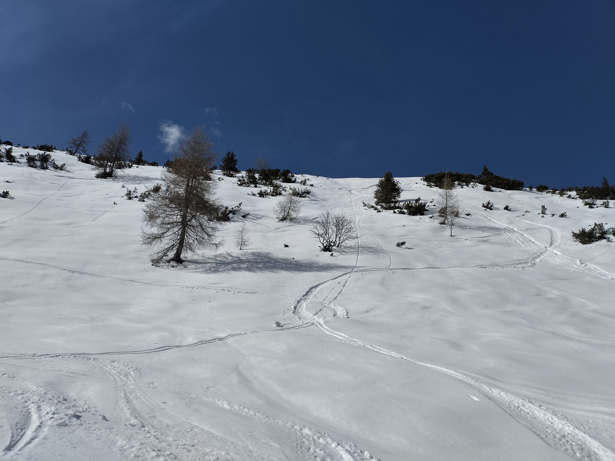 Die Nockspitze ist schon ordentlich zerfahren, inklusive einiger recht interessant Lines. Darunter der SL Götzner Grube der schon seit Jahren nicht mehr in Betrieb war.
