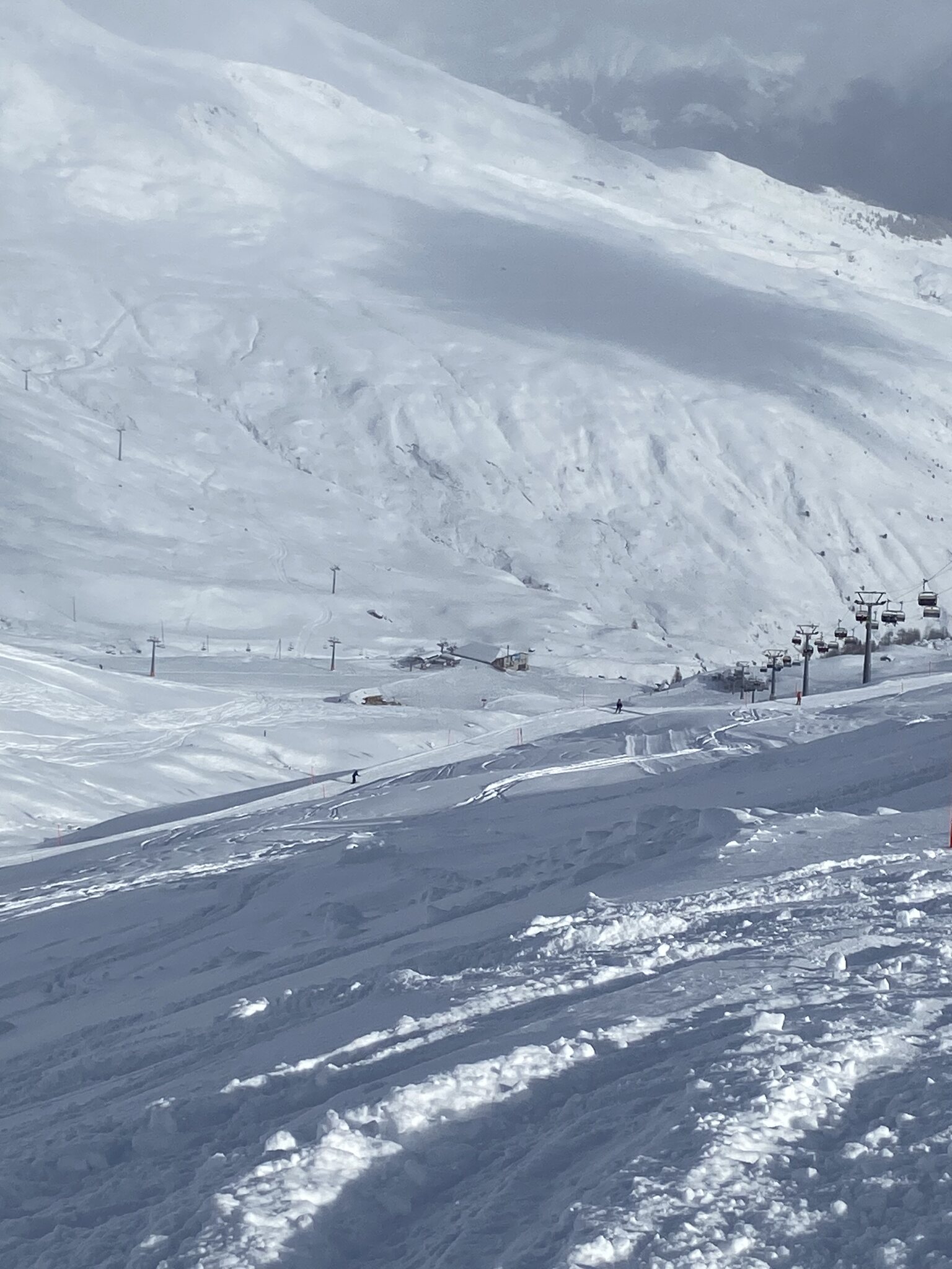 Die Pisten sind bis ca. 13:00 in gutem Zustand danach halt zimlich zerfahren. Es hilft nicht dass eigentlich alle unbeschneiten Pisten geschlossen sind. Aber die geöffneten sind tadellos, keine Steine, kein Gras und auf voller Breite präpariert.