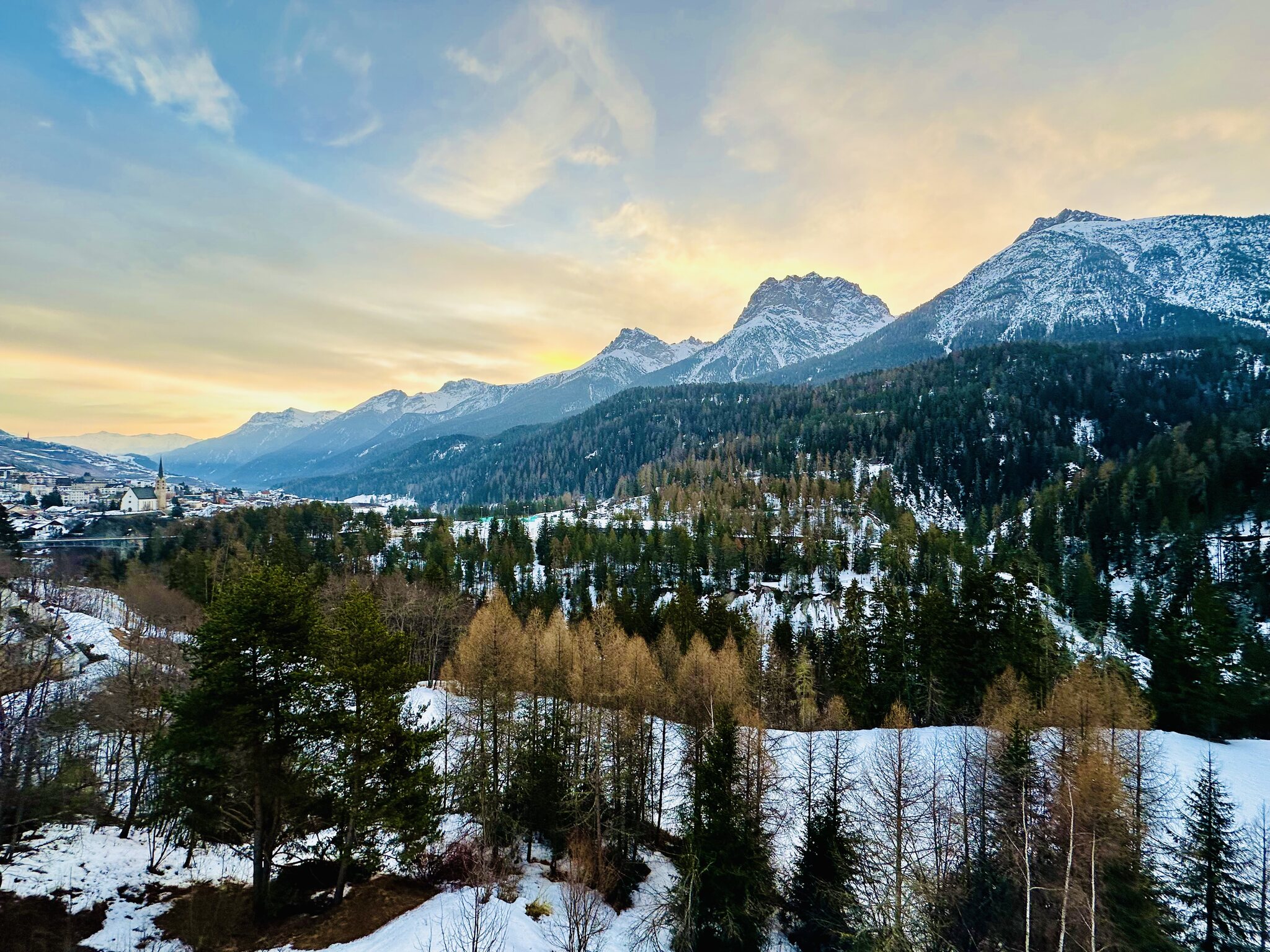 Heute steht wieder Scuol an. Der morgendliche Blick aus dem Hotel Zimmer ist genial. Es gibt etwas Höhenbewölkung, mal schauen wie sich das entwickelt.