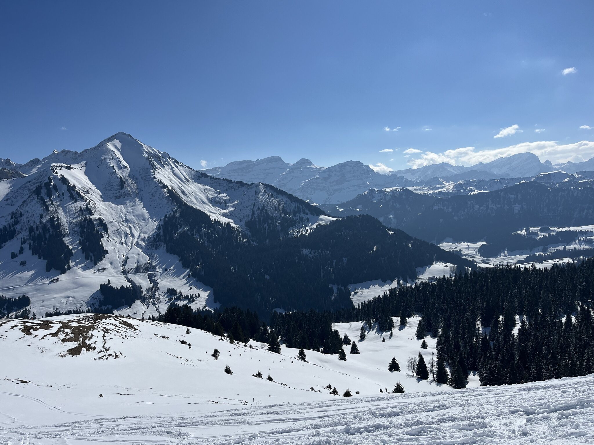 Also wechselte ich zu Les Mossses und nahm den Skibus, der am Fuße von Solepraz abfährt. Dieses Gebiet ist völlig neu für mich, aber ich habe schon mehrfach gehört, wie anfängerfreundlich es ist, also habe ich nicht allzu viel erwartet. Es stellte sich heraus, dass es viel angenehmer ist als erwartet. Sicher, es gibt keine anspruchsvollen Pisten oder große vertikale Abfahrten, und die Pisten sehen sich ein wenig ähnlich. Aber die breiten, sanften und nicht überfüllten Pisten eignen sich dennoch gut für entspanntes Carven. Die KSSLs sind schnell, was wiederholte Abfahrten attraktiv macht. Ich bin Les Parchets I ein paar Mal abgefahren und habe mich dann in Richtung La Lécherette begeben, wobei ich fast alle Pisten befahren habe. Die Schneeverhältnisse sind auf der Seite von Les Mosses besser, sie sind griffig und nicht matschig. Auf La Lécherette war es etwas schwieriger, aber auch nicht schlecht. Es lag mehr als genug Schnee auf den Pisten, und ich habe keinen einzigen Stein entdeckt.