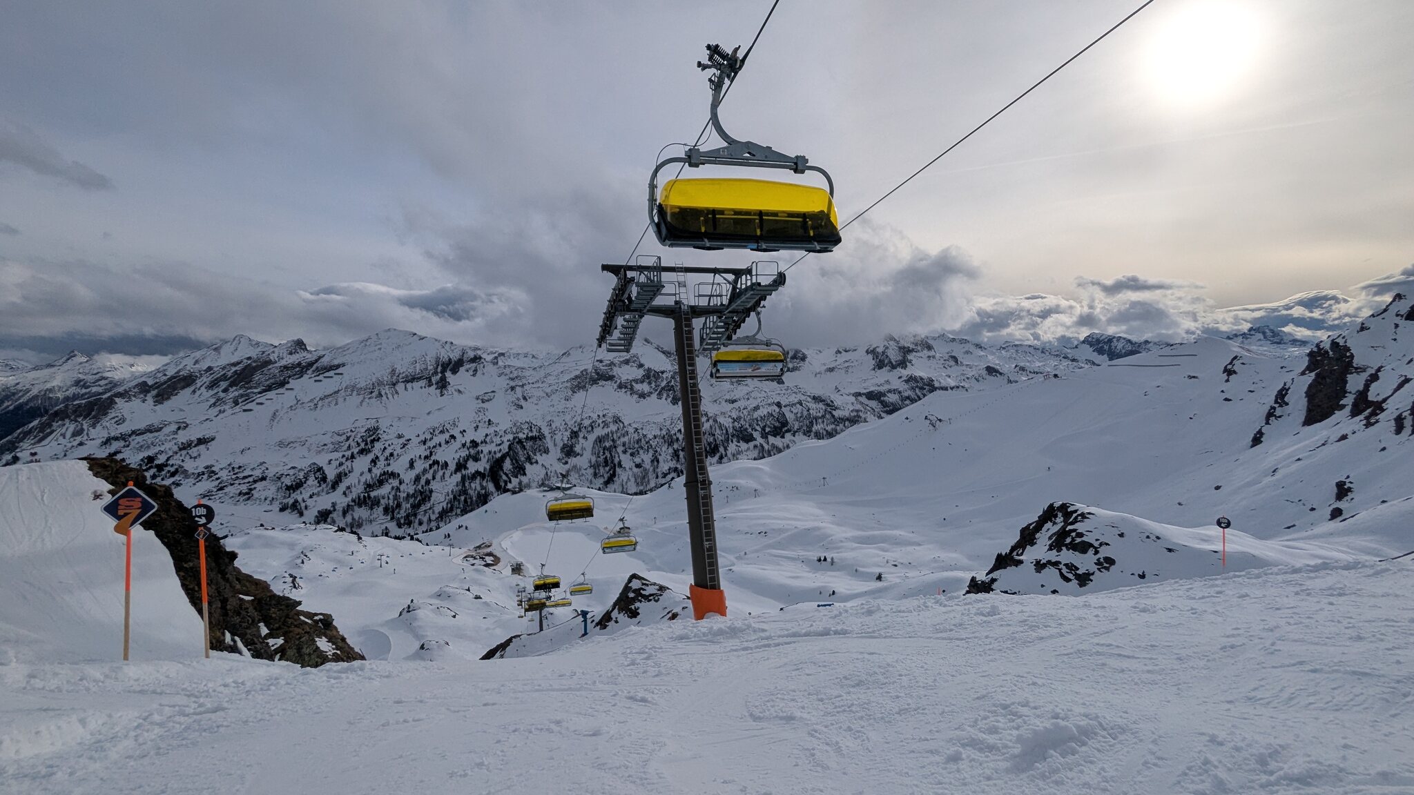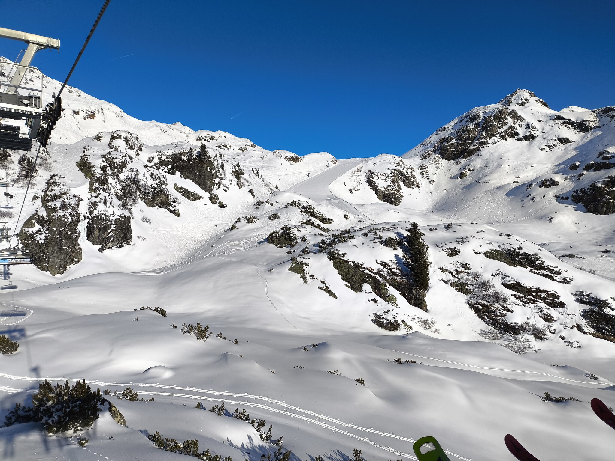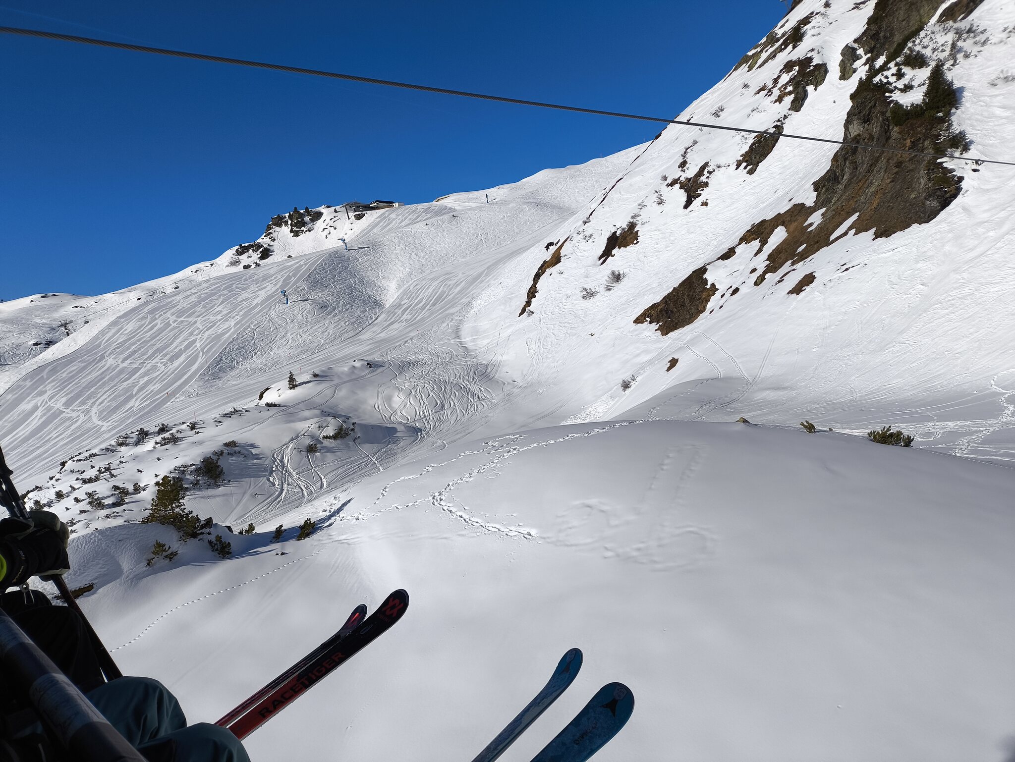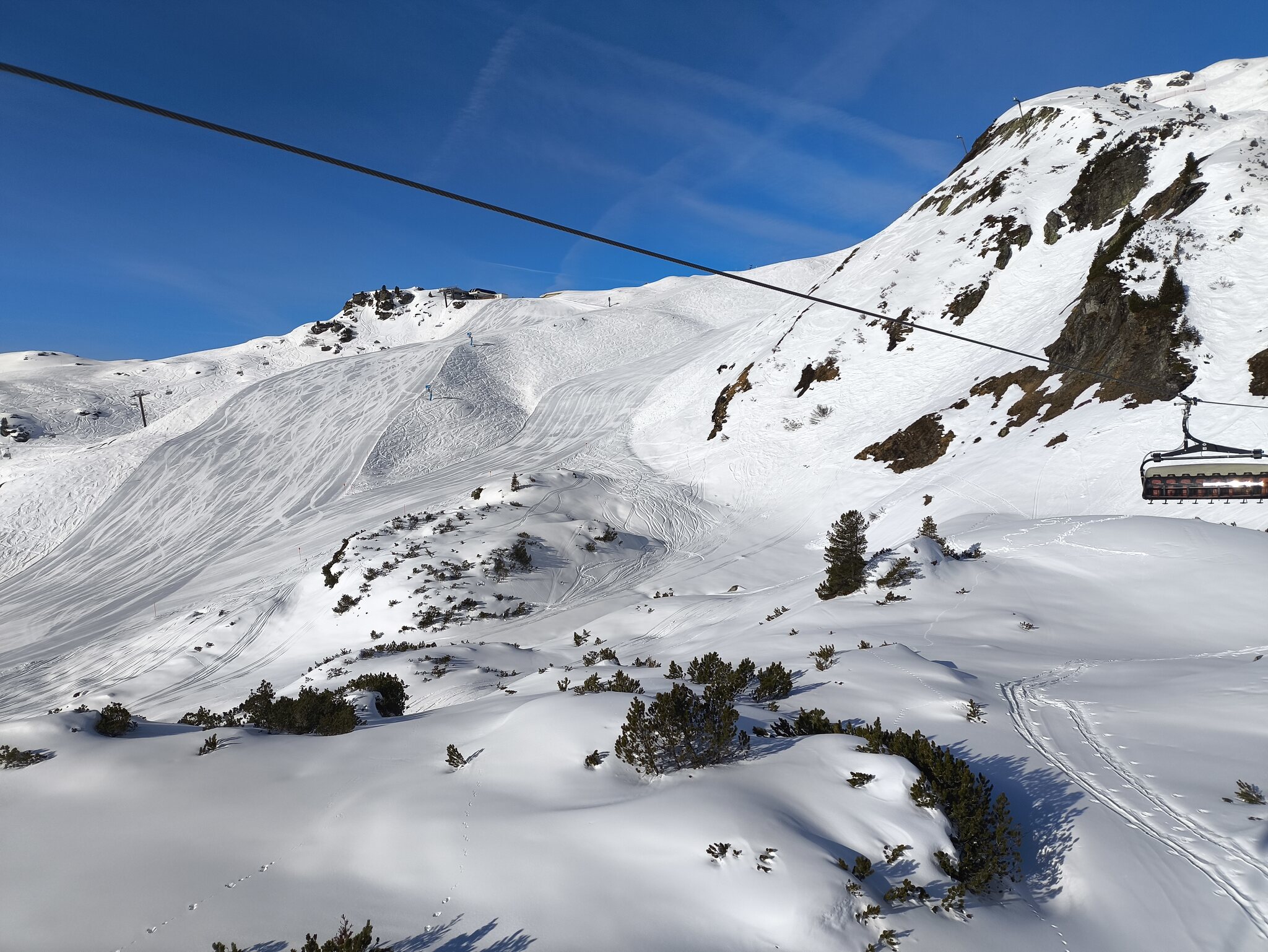 Schöne Bahn, die aber gestern irgendwelche Probleme hatte und immer wieder stehen blieb, auch 5 x pro Bergfahrt. Deshalb mit kurzen Wartezeiten an der Talstation. Die 5b schaut auch schon fast fertig aus und wurde fleissig von Tourengehern benutzt: