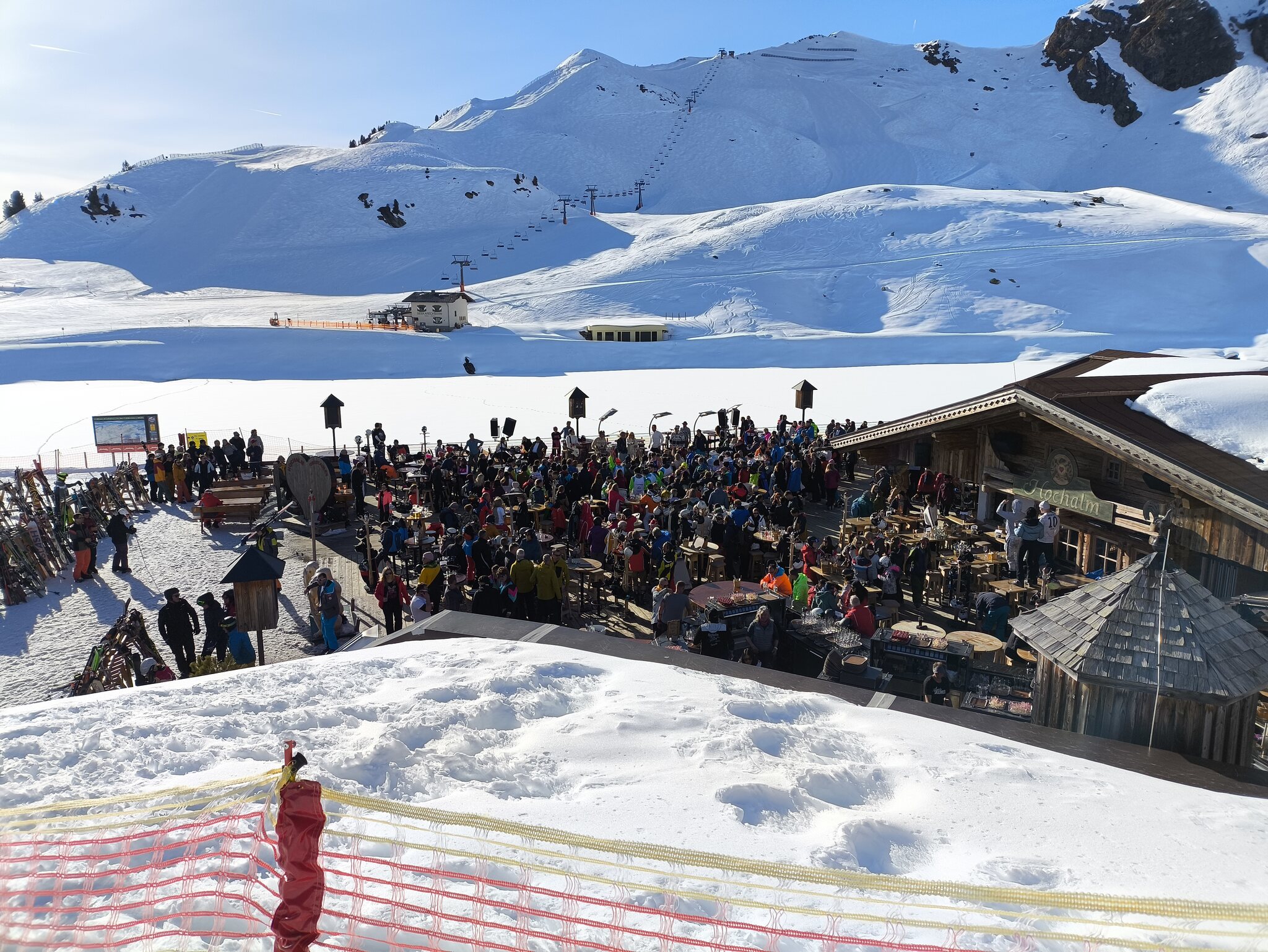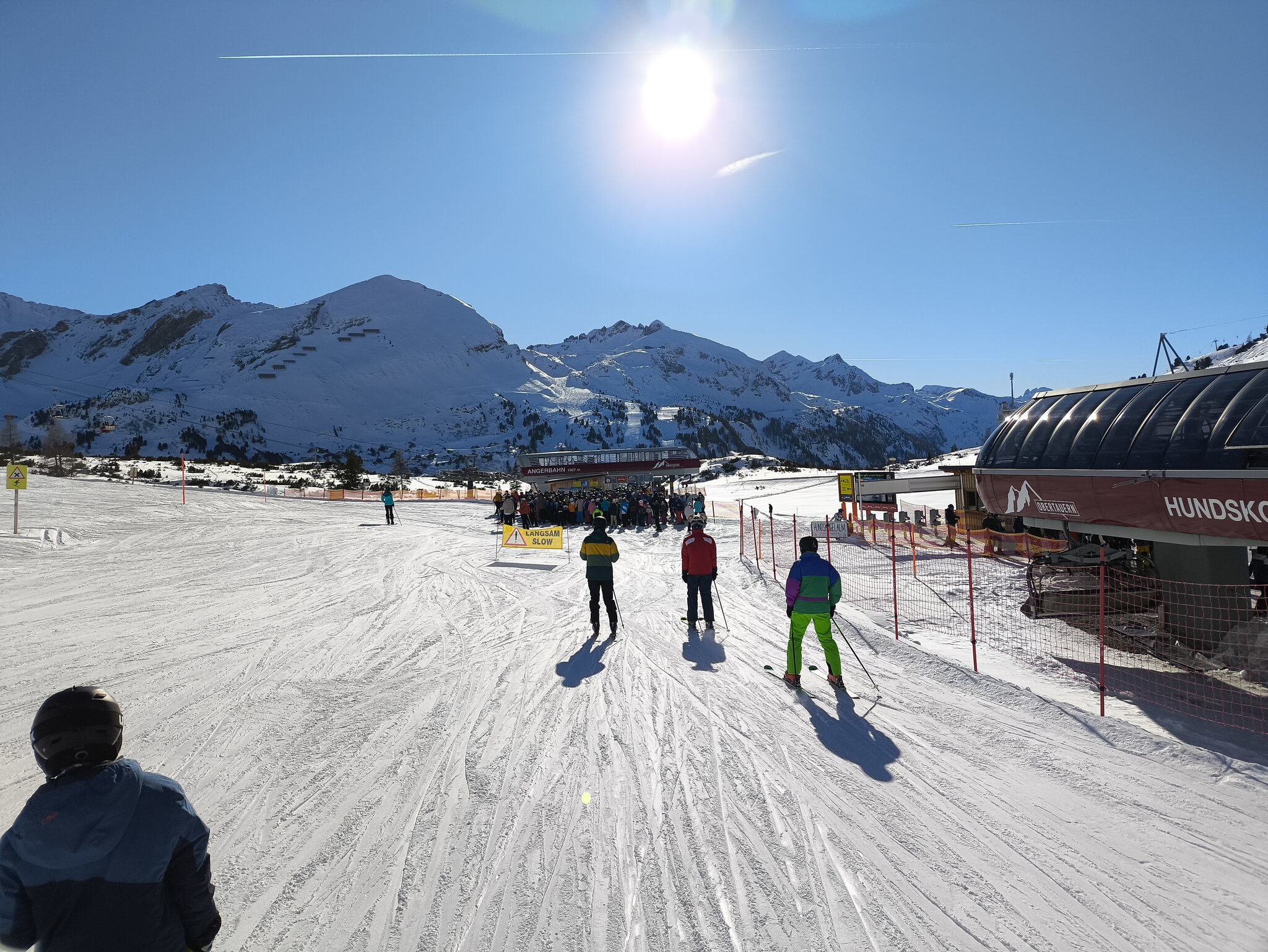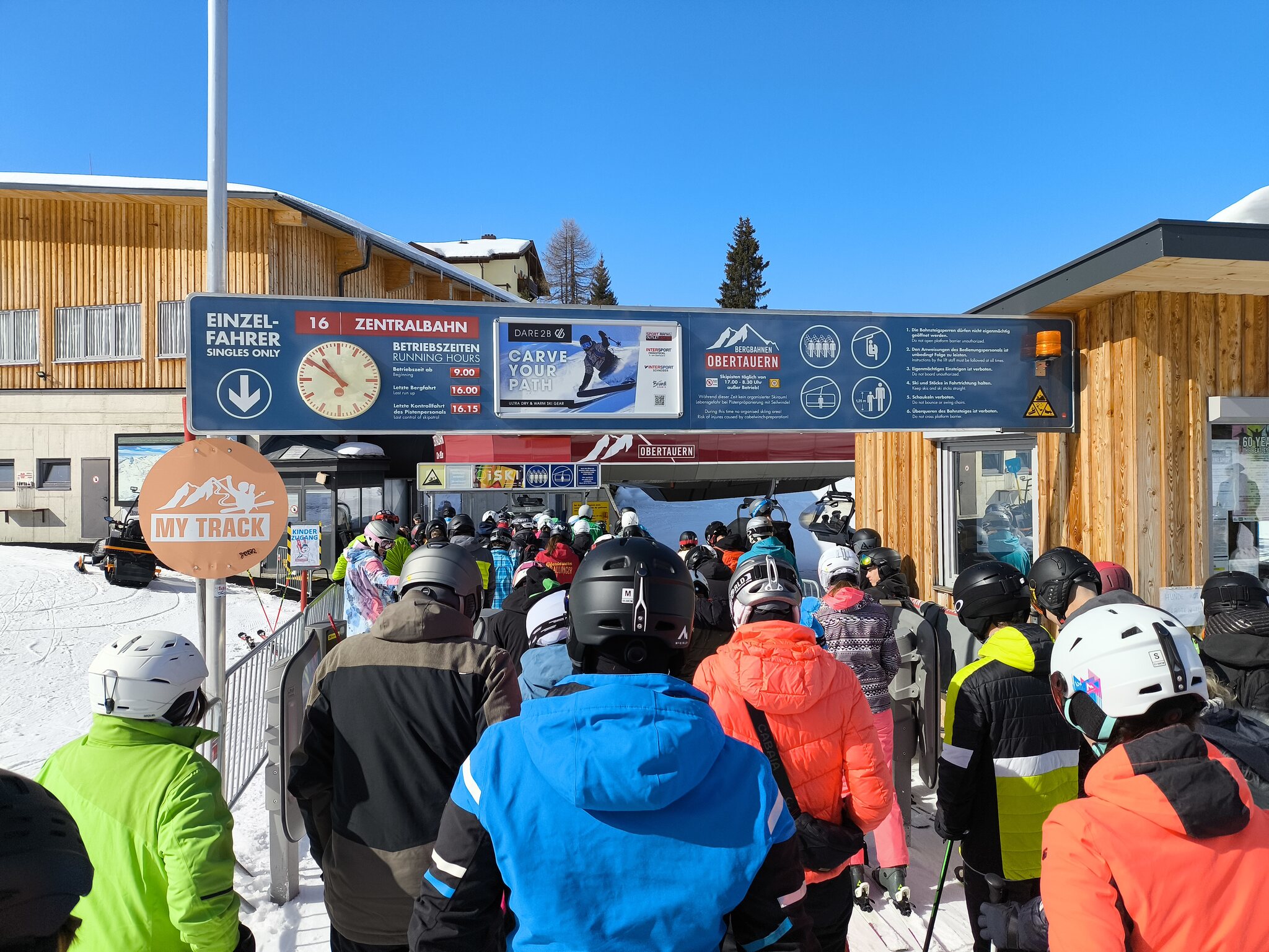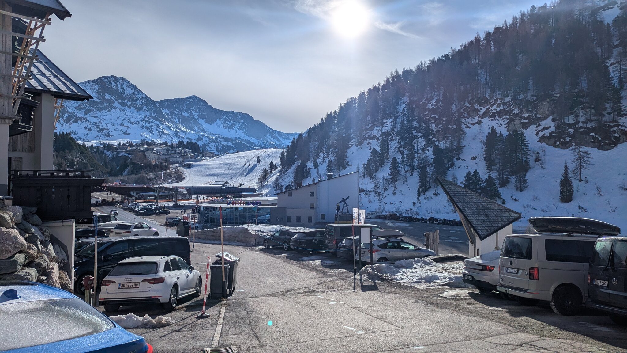 Grund genug für mich, kurzfristig umzuplanen (ursprüglich habe ich eine Kombi aus Planai + Reiteralm geplant) und nach den 2 Stunden auf der wolkigen Reiteralm das Skigebiet zu wechseln. Bereits vor halb zwölf habe ich auf den hoffnungslos überfüllten Parkplätzen P3 und P4 (beiderseits der Talstation Grünwaldkopf) nach einem freien Platz gesucht; zum Glück haben die ersten 'early Birds' zu dem Zeitpunkt bereits den Skitag beendet, so dass ich nach kurzem Abwarten einen sehr bequemen Platz 50 m von der Talstation und 1 m von der Piste erwischen konnte
