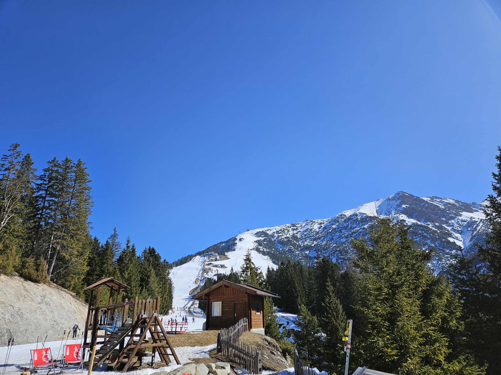 Heute morgen startete ich um 9 bei schon frühlingshaften Temperaturen mit der Standseilbahn auf die Rosshütte. Oben war das Geläuf dann erstmal bretthart und die Kanten knirschten ziemlich. Ich hatte aber meine älteren Ski angeschnallt, was sich im unteren Abschnitt der Abfahrt zum Rosshütte-Express als passend erwies; da war ein Hang nämlich Restschnee analog Winterberg 🤷🏻‍♂️🤣.