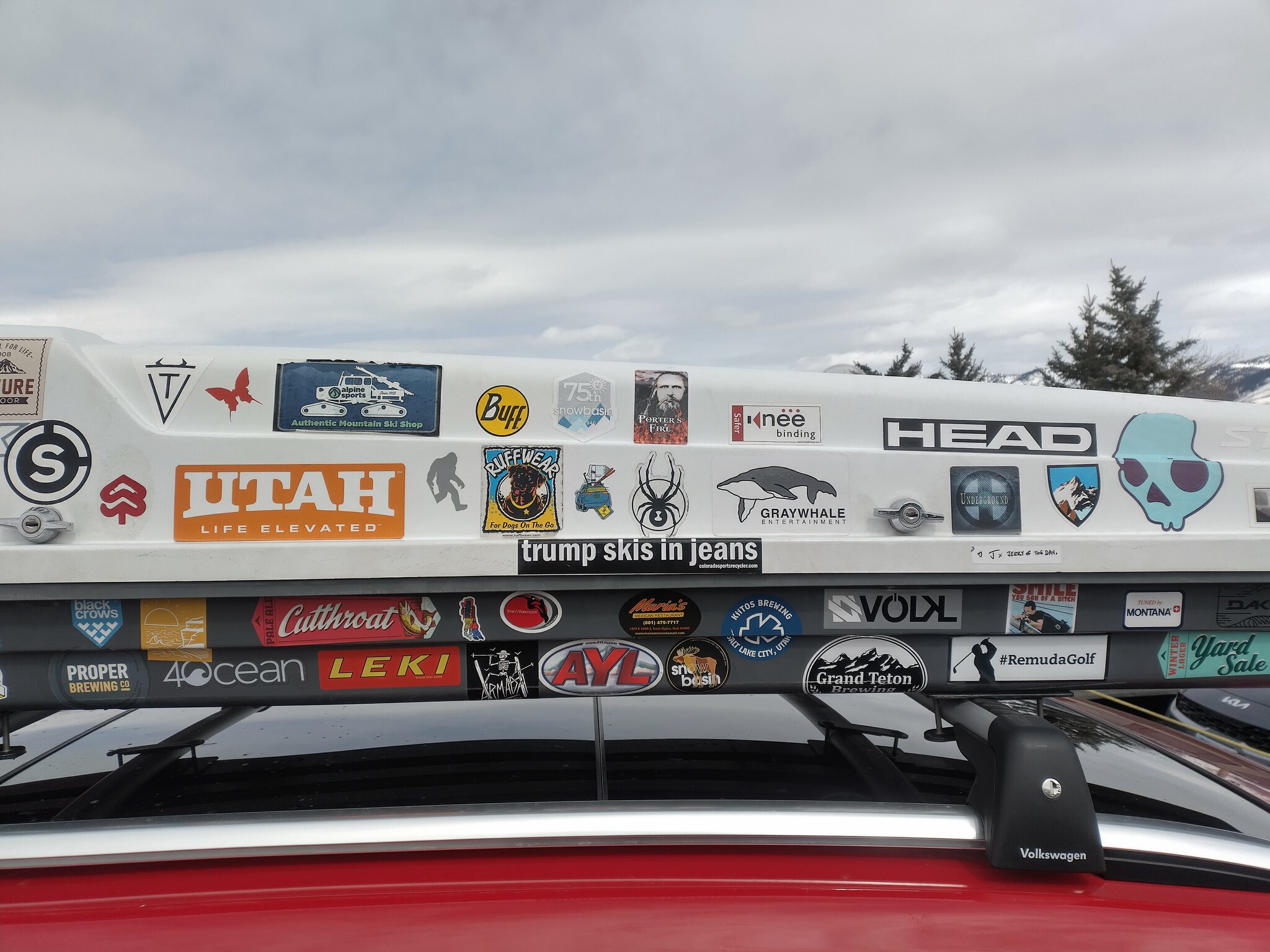 Die Aufkleber mit mehr oder weniger lustigen Sprüchen, die die amerikanischen Skifahrer auf Helm, Ski und Auto platzieren finde ich immer interessant