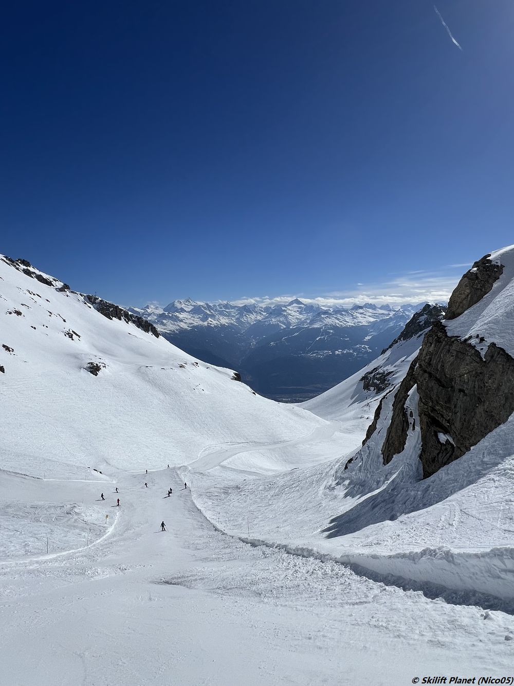 Mit Ausnahme der Talabfahrt in Aminona ist in Crans-Montana derzeit fast alles geöffnet. Alle Anlagen sind geöffnet. Allerdings beginnt es auf vielen Pisten an Schnee zu fehlen (einige braune Flecken oder Steine). Aber im Großen und Ganzen ist es okay. Die Bedingungen sind in Ordnung, aber der Schnee ist entweder eisig oder sehr nass und hat daher große Buckel. Nicht wunderschön... Und es gab viele Leute. Aber das herrliche Panorama entschädigt dafür!