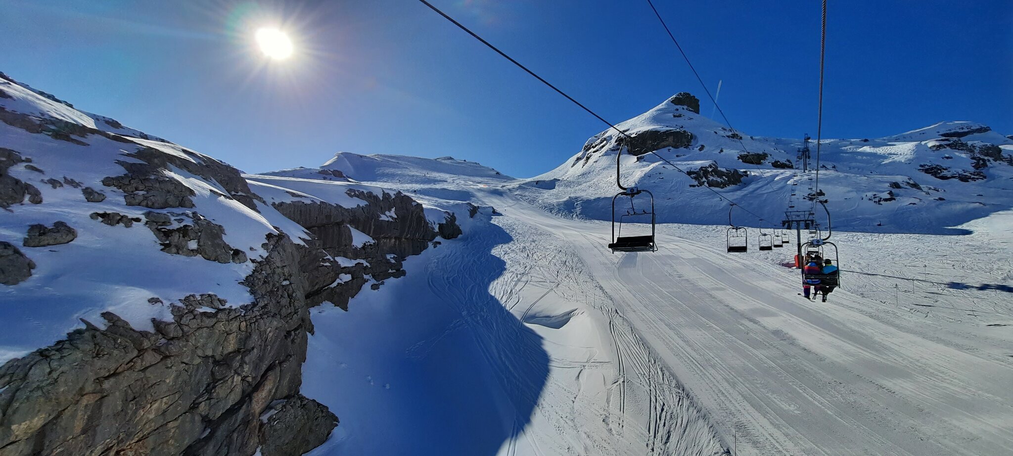 Mit diesem Lift gelangt man wieder nach oben und kann dann den Diamant Noir-Sessellift nutzen, um fast bis zum höchsten Punkt des Skigebiets zu kommen – ohne die lange Warteschlange an der Grandes Platières-Gondel. Anschließend geht es über die rote Piste Faust bis zum Désert Blanc-Sessellift. Von dort fährt man wieder nach oben und dann über die blauen Pisten Richtung Flaine Forêt, um mit dem Grand Vans-Lift weiter nach oben zu gelangen.