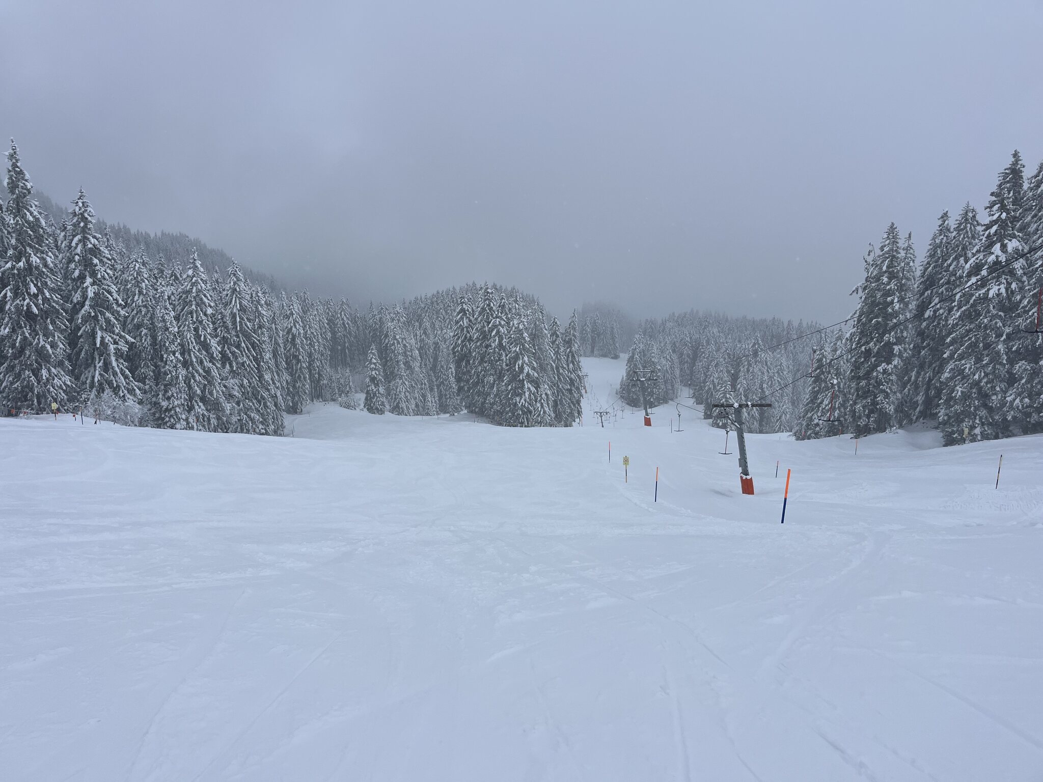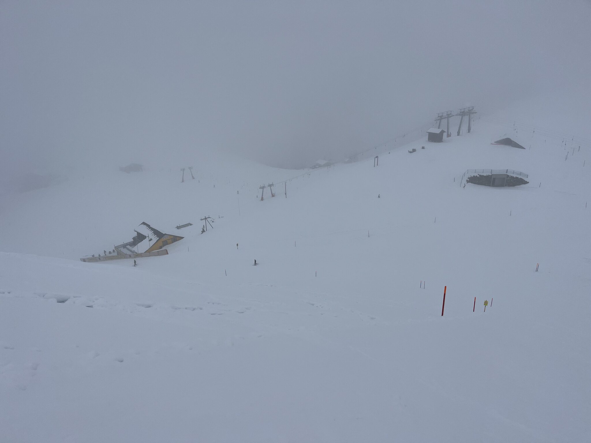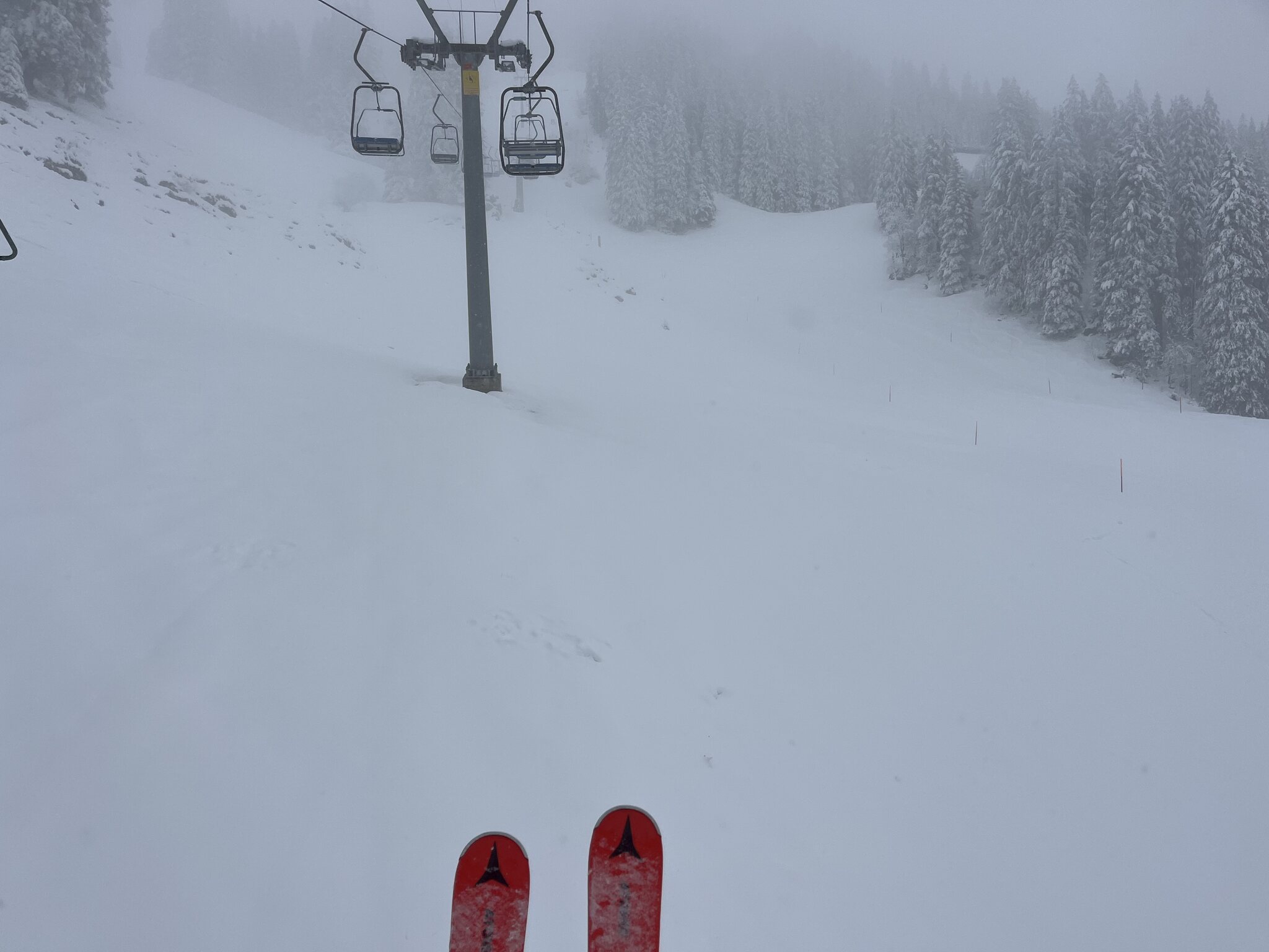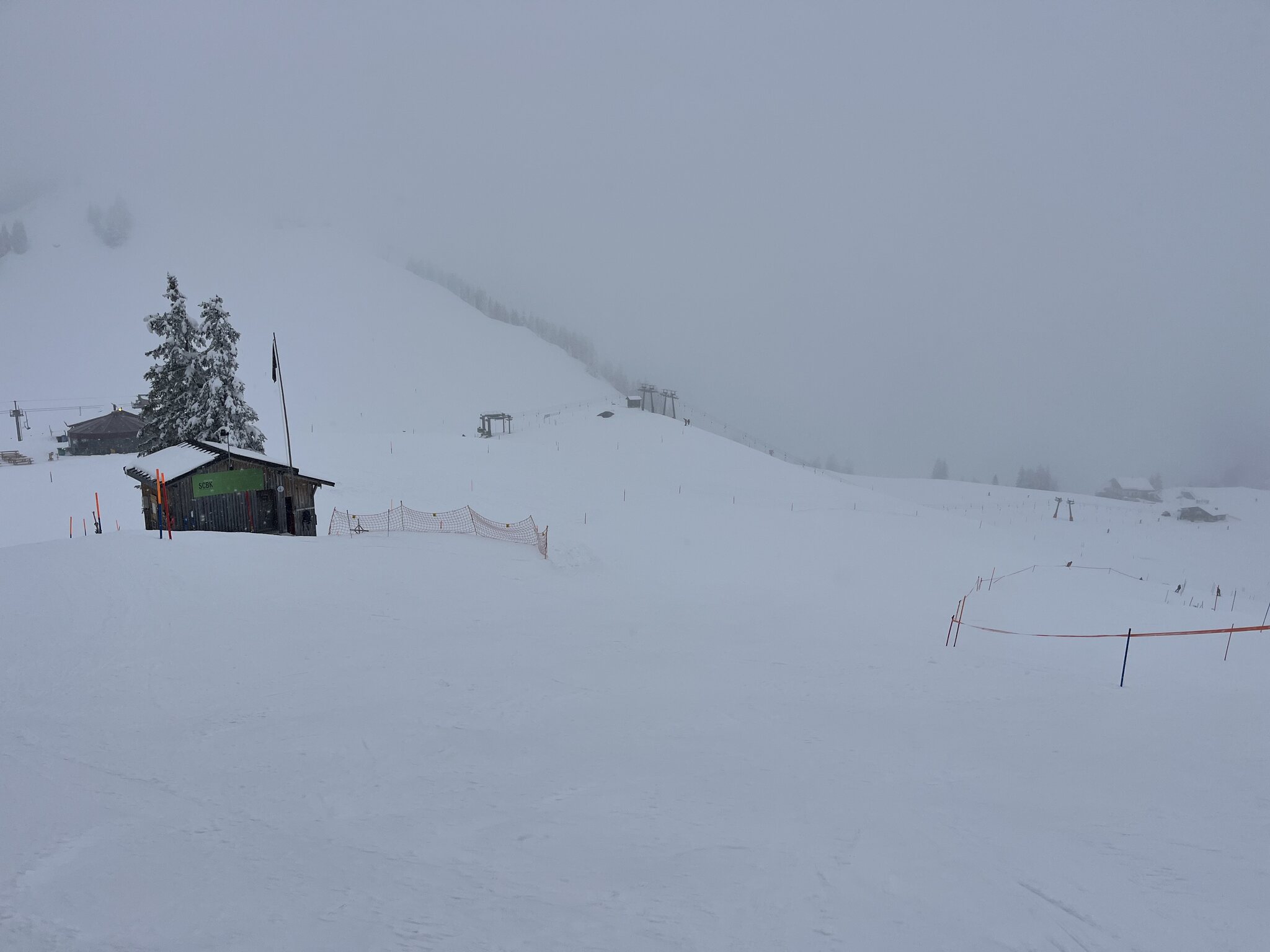 Heute quasi copy-paste von gestern, nur schlechter: Der dichte Nebel reicht heute bis knapp unter die Chälen-Bergstation. So macht es keinen Spass. Einzig am Twäregg kann man halbwegs normal fahren, weil da der Nebel nicht so dicht ist.