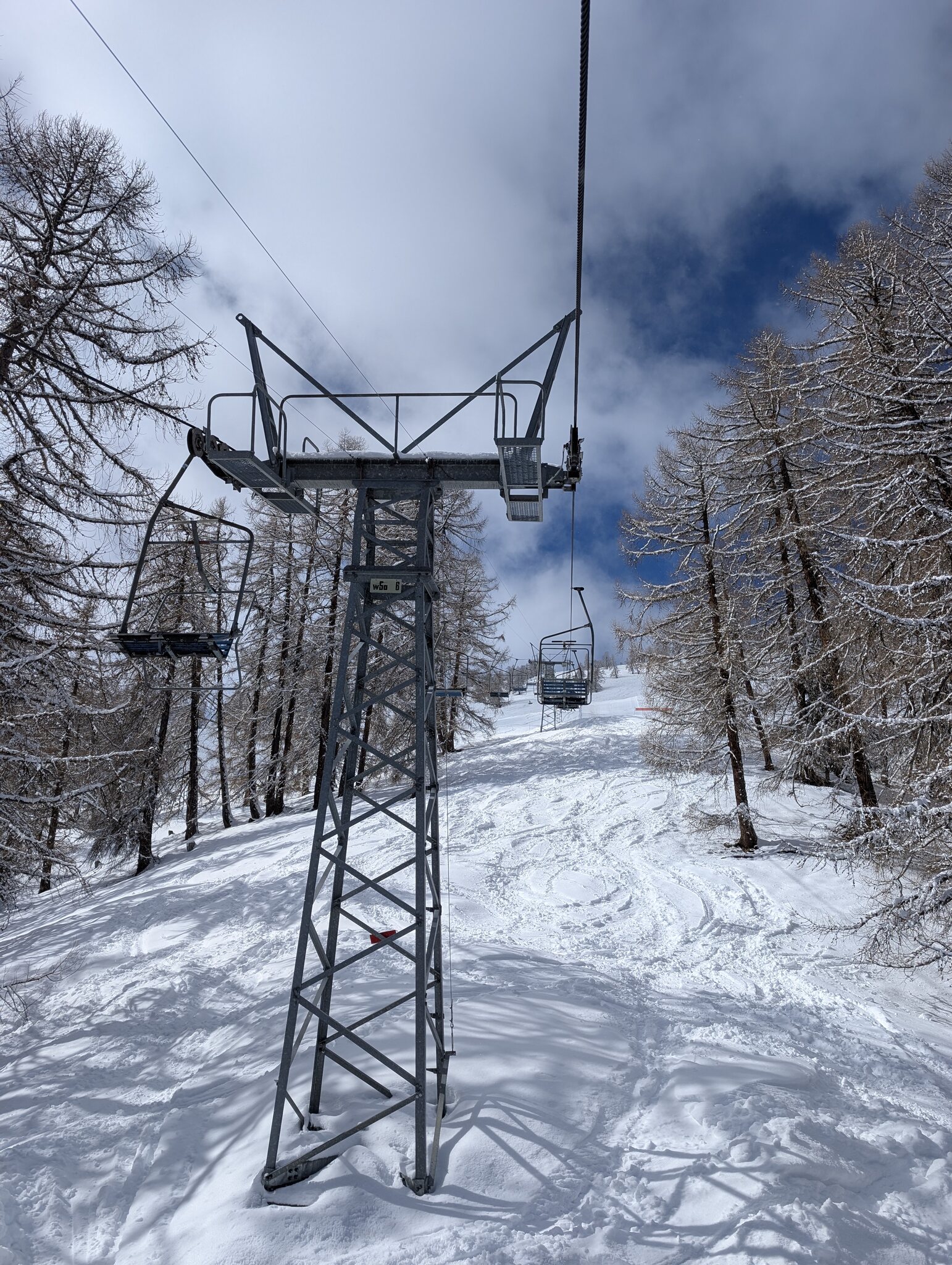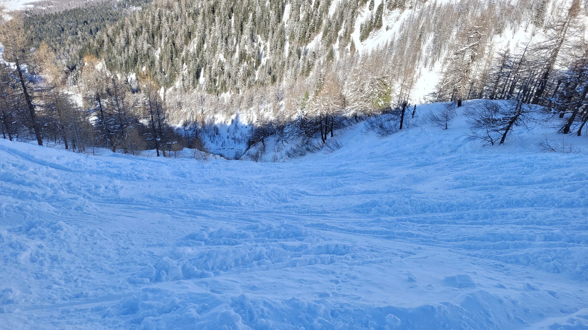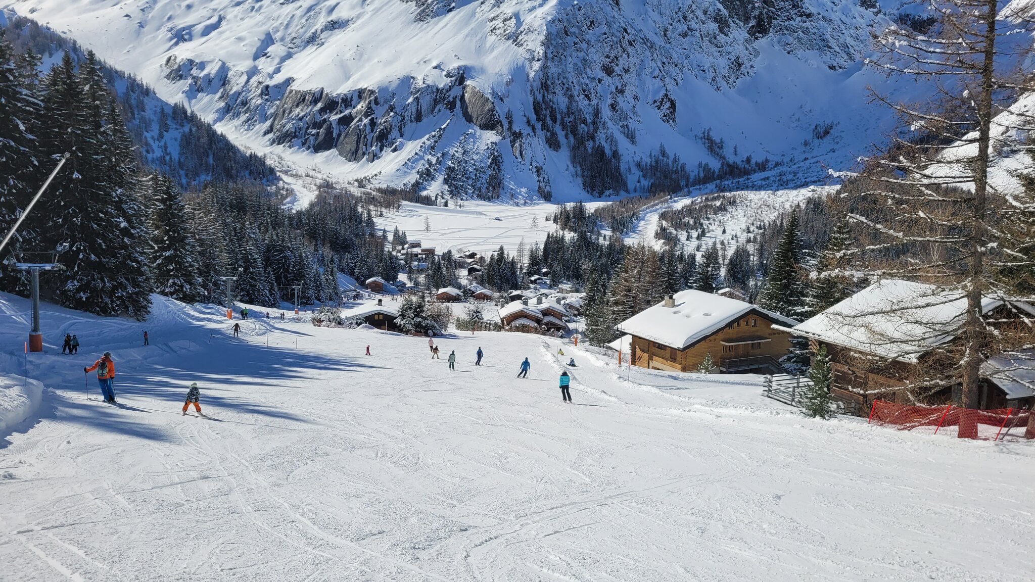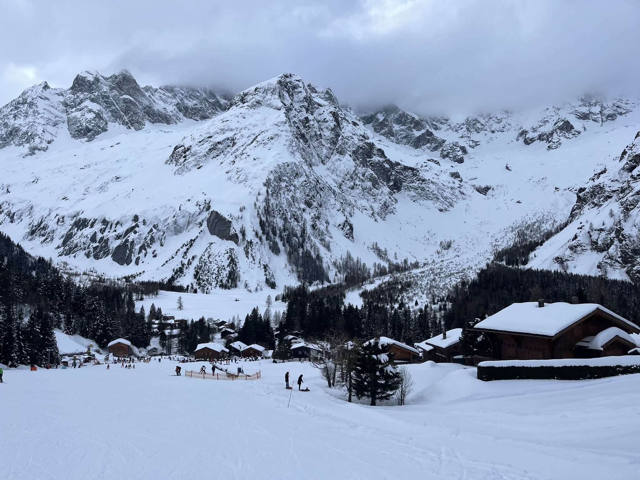 Am Nachmittag wechselten wir nach La Fouly. Schade, dass eine Wolke über der Region hing, in Richtung Orsières sieht man tatsächlich klaren blauen Himmel. Die Pisten sind hier recht holprig, was angesichts der vielen Skifahrer etwas seltsam ist. Die schwarze Piste Les Bassins sieht eher aus wie eine gelbe Piste oder eine Halfpipe, La combe Vert war auch nicht einfach. Wir haben auch die gelbe Piste Les Mélèzes ausprobiert, die steil und interessant war, es fühlte sich an wie das Skifahren abseits der Pisten in Nordamerika.