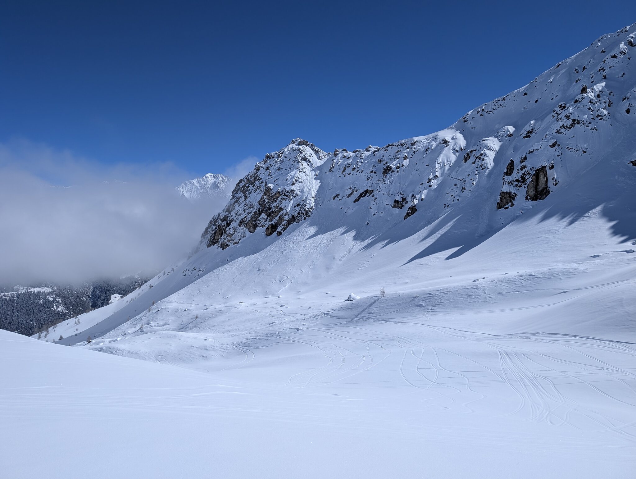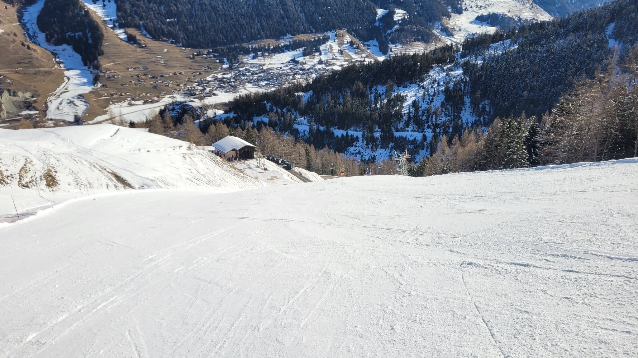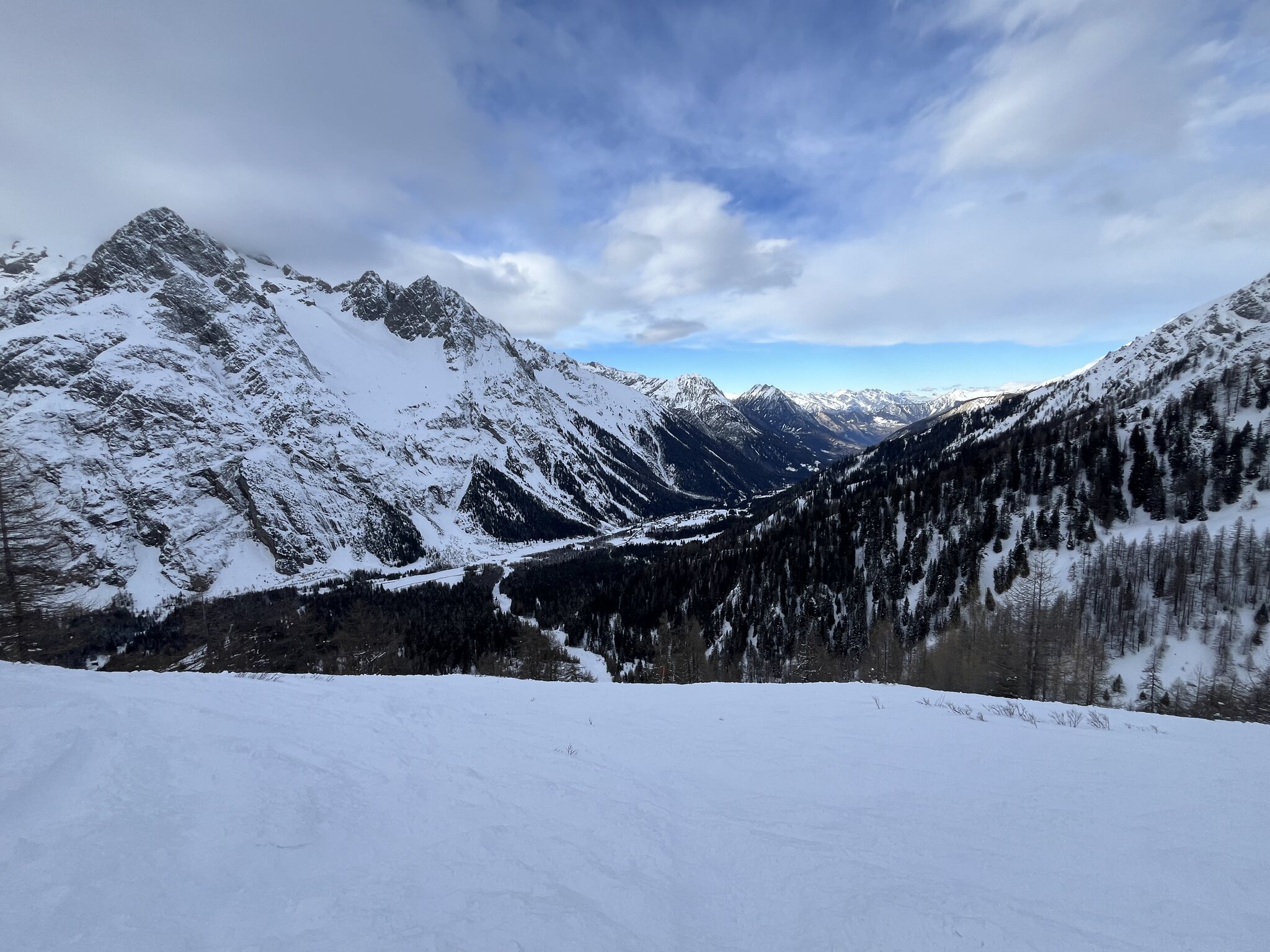 Die Variante skiers right zum Lift gefällt mir fast am Besten Ich fahre eine Stunde hier, bevor ich am Nordhang des Tour de Bavon tollen unverspurten Pulver finde und hier einige Runden im Tiefschnee drehe. Schöne Tiefblicke ins grüne Val Ferret. Der zweite SL ist leider nicht in Betrieb. Update: Der Lift ist defekt und bis auf Weiteres nicht in Betrieb. Nicht weiter schlimm für den Skibetrieb. Überhaupt verirren sich 30 vielleicht auch 40 Leute ins Gebiet. Die blaue Piste am Teller-SL ist auch um 13.00 Uhr noch tiptop in shape. Die Talabfahrt schön sulzig, richtig gut zum heizen auch mit den breiten Skiern. Schönes kleines Skigebiet. Hätte ich nochmals 2 Stunden Zeit gehabt wäre ich weiter nach La Fouly. Bleibt definitiv auf der Bucketlist.
