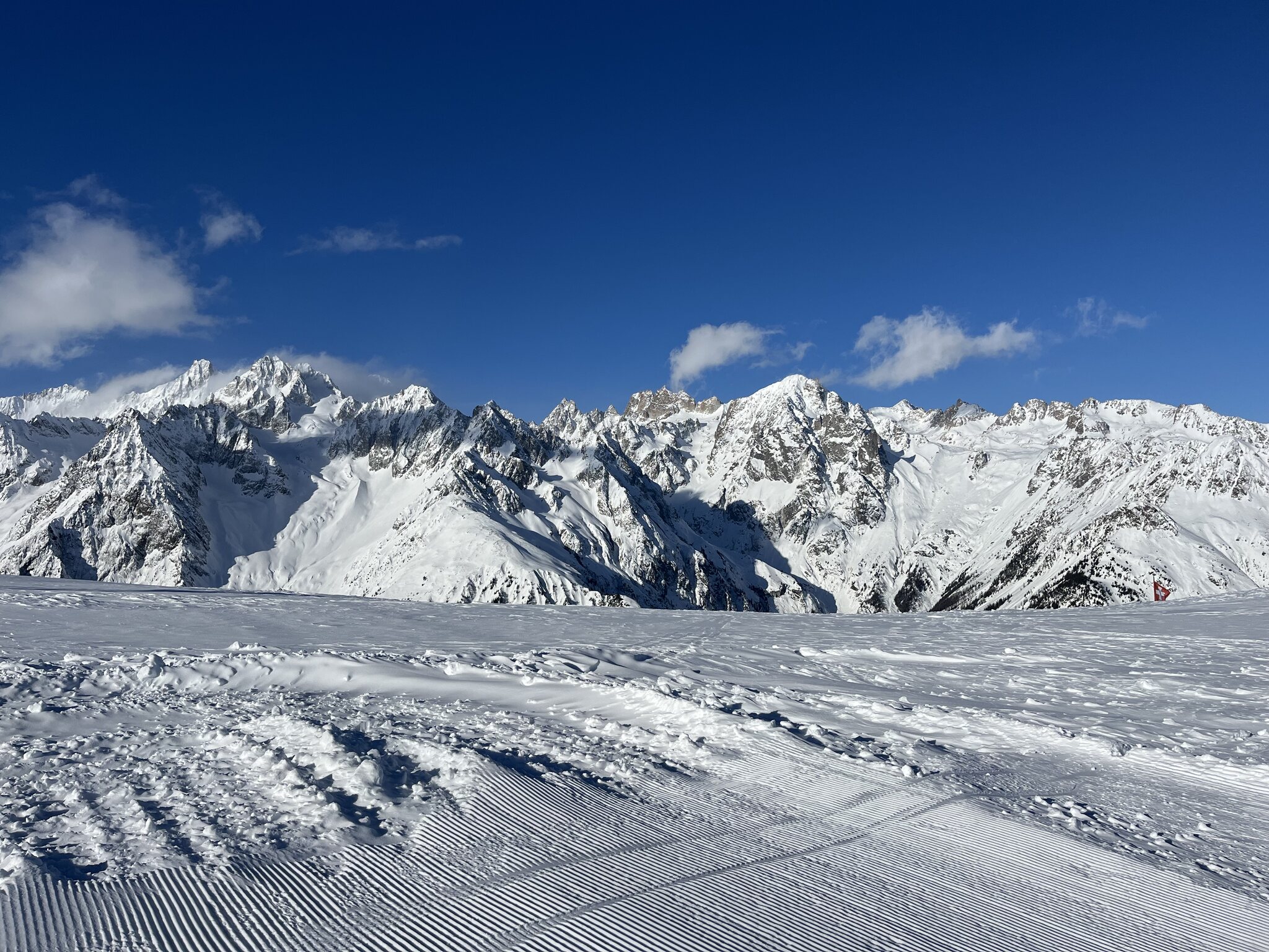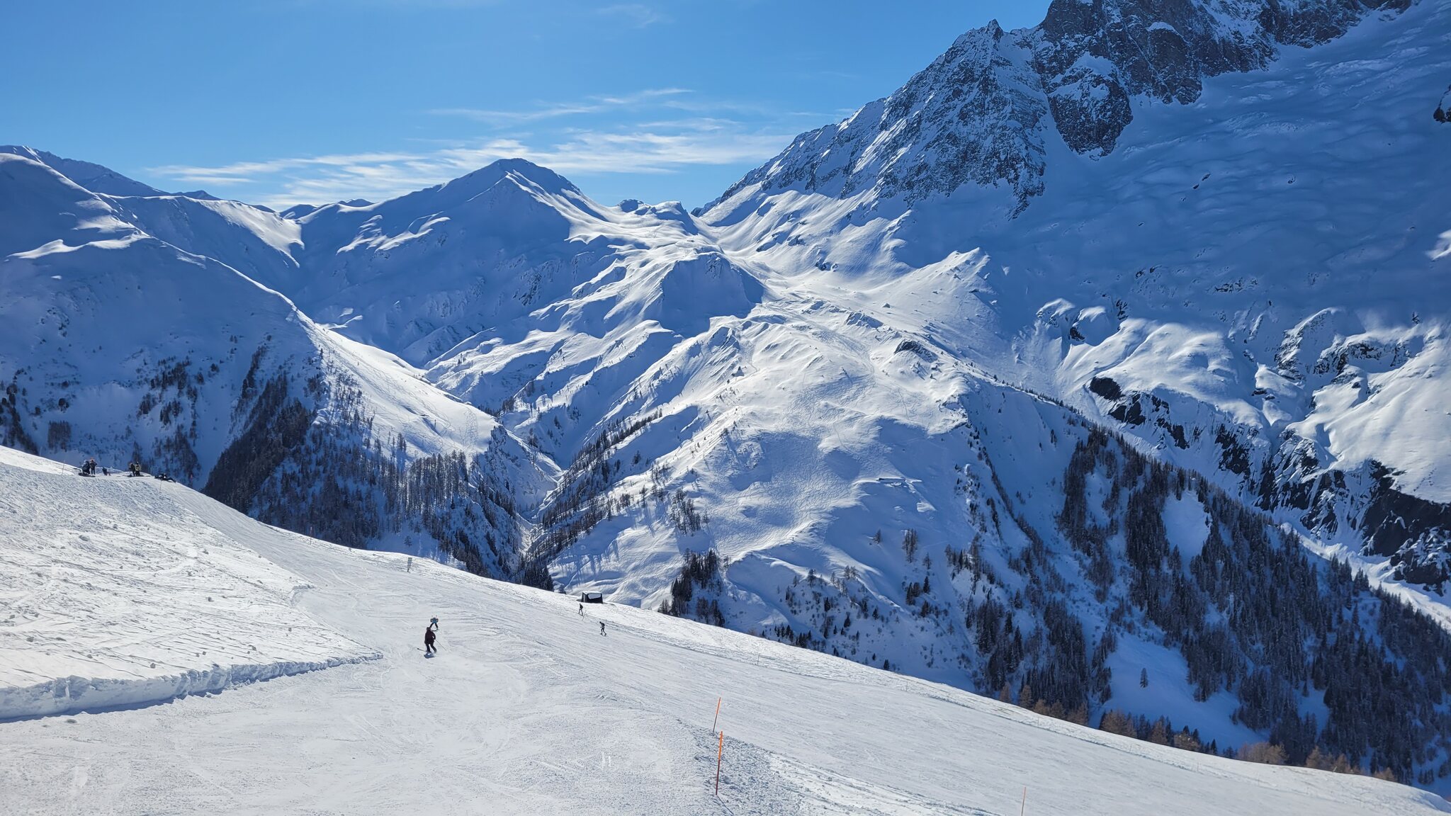 Blick vom höchsten Punkt des Skigebiets zum Col Ferret, dahinter ist schon Italien.