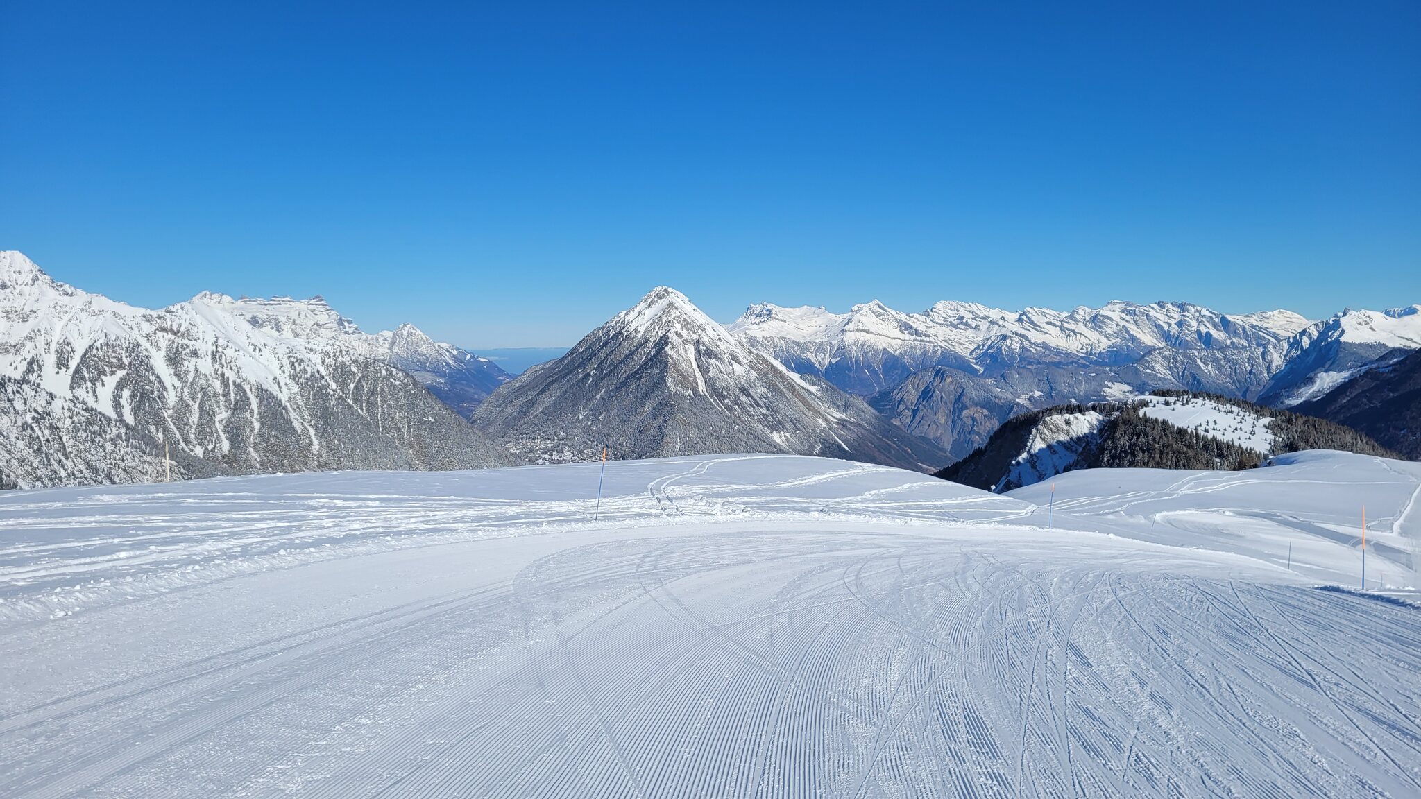 Wir begannen unseren Tag in Vichères am Morgen. Da das Skigebiet etwas abseits einer größeren Siedlung liegt, gab es hier keine regelmäßigen öffentlichen Verkehrsmittel. Zum Glück gibt es einen Shuttlebus mit Fahrplänen, der recht gut mit den öffentlichen Verkehrsmitteln verbunden ist (im Gegensatz zu Nax). Er kostet 10 Franken für Leute ohne Saisonkarte, aber der super freundliche Fahrer war ziemlich überrascht, als ich darum bat, ein Ticket zu kaufen. Heute sind die Pisten gut präpariert, die oben waren leicht verblasen. Die schwarzen Pisten unten sind irgendwie etwas hart, aber keine eisigen Stellen. Die Offpiste war auch recht gut, vor allem in der oberen Hälfte des Sessellifts.