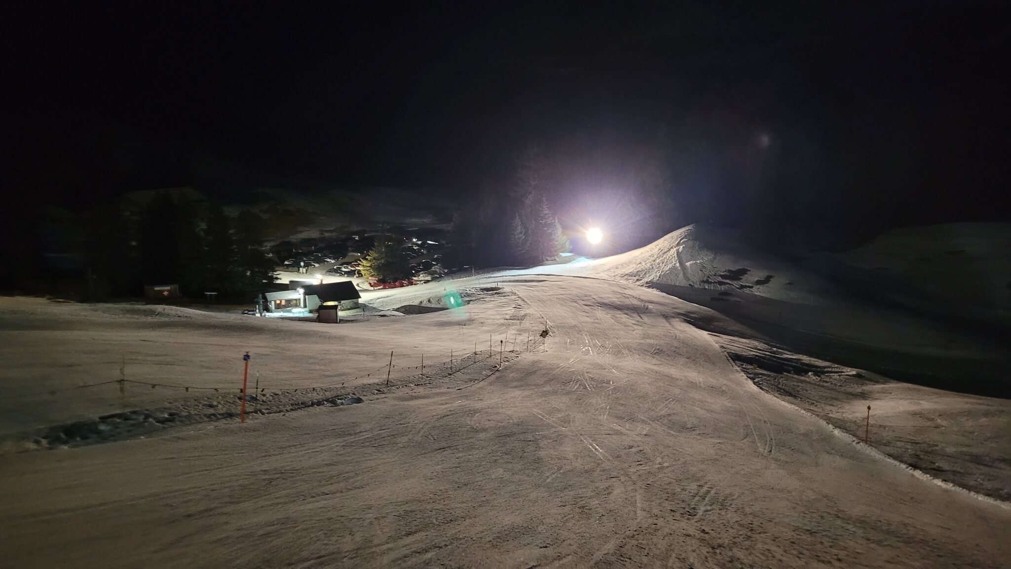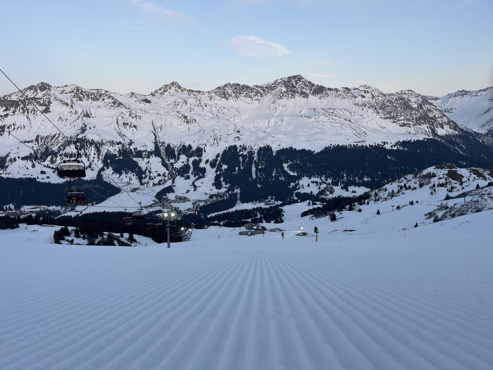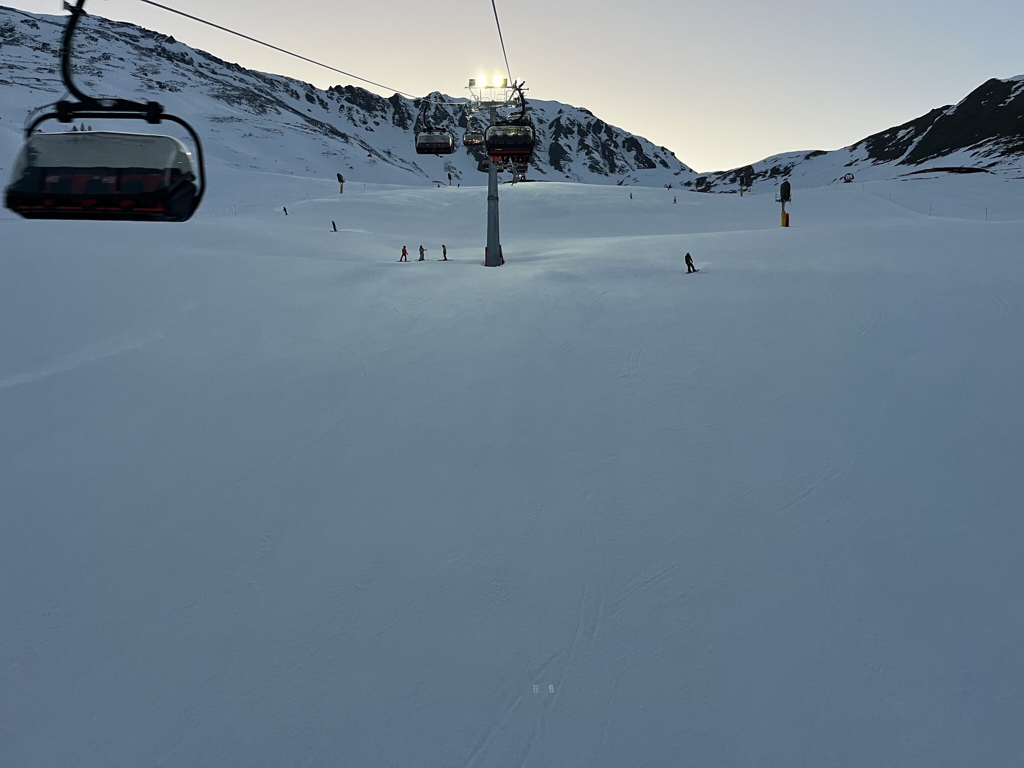 Kurz vor 18 Uhr sind zwei Bullys noch auf der Proschieri-Piste. Der Patrouilleur lässt mich mit dem Hinweis auf Vorsicht trotzdem runterfahren. Edit 19.45 Uhr: