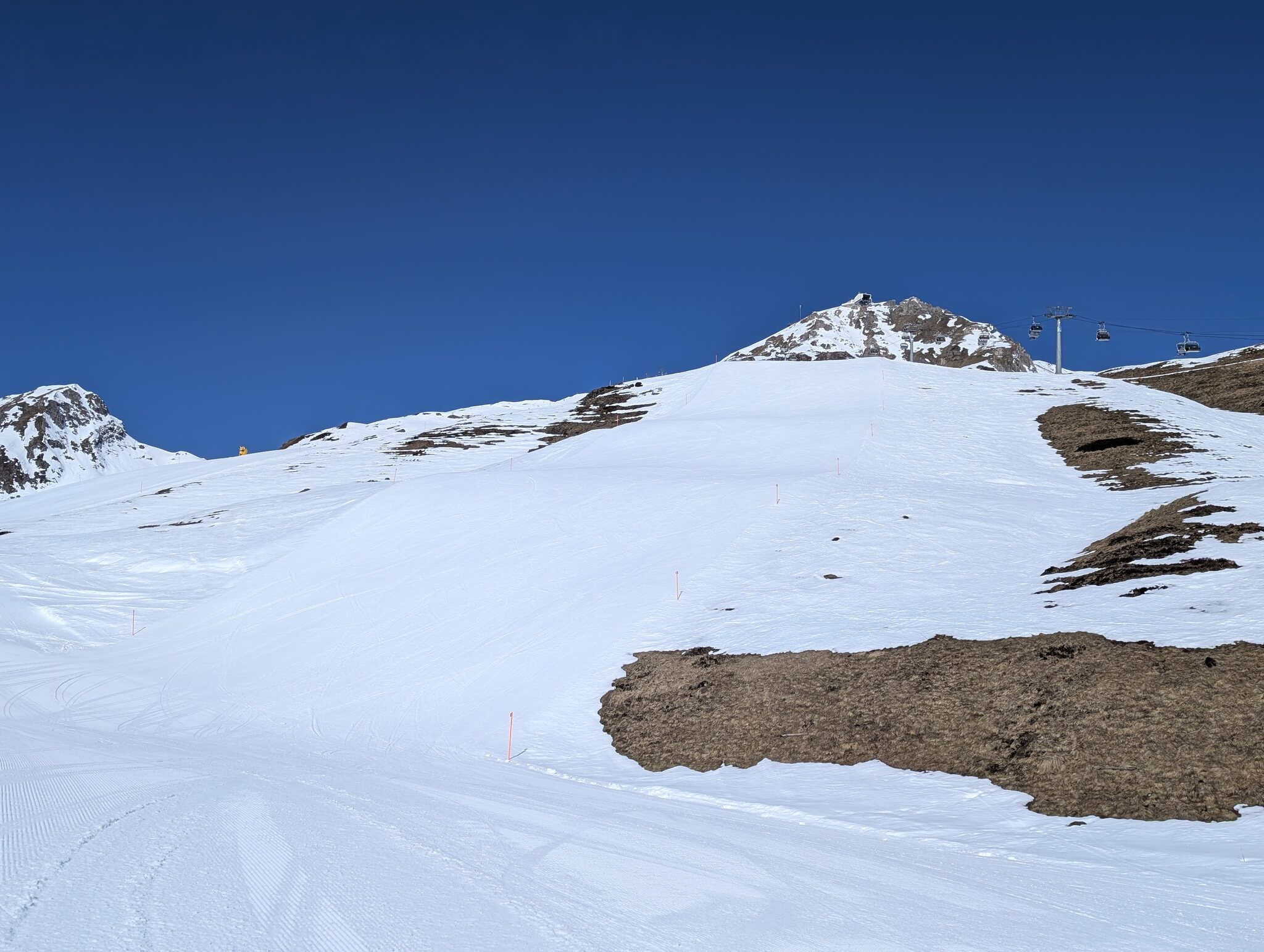 Dagegen hatte es interessanterweise auch auf beschneiten Pisten (Hörnli-Hauptpiste rot) teilweise braune Stellen. Zwar schon dort wo grundsätzlich keine Beschneiung war (in Fahrtrichtung rechts präparieren die Bullyfahrer unter der Saison jeweils immer etwas weiter nach aussen. Dort wird es jetzt auch braun). Gespannt, wie es sich die nächsten 4 Wochen entwickelt.